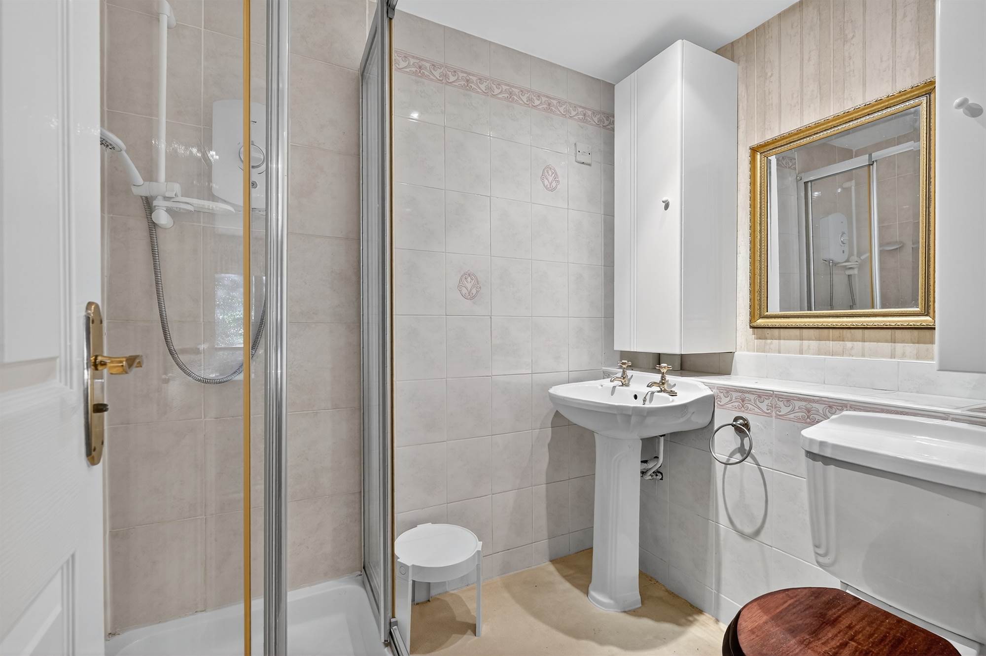 White suite comprising low flush wc, pedestal wash hand basin, shower cubicle with electric shower, part tiled walls, recessed spotlights.
