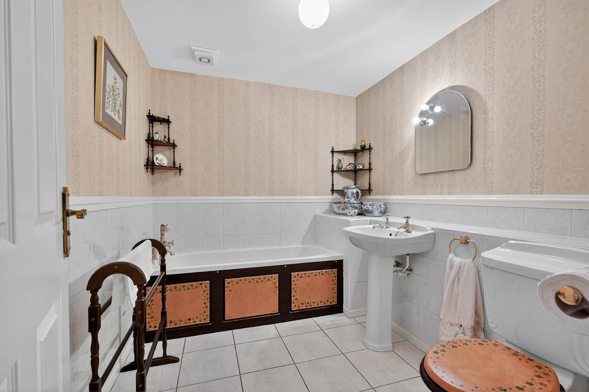 White suite comprising low flush wc, pedestal wash hand basin, bath with mixer tap and telephone hand shower, part tiled walls, tiled floor.