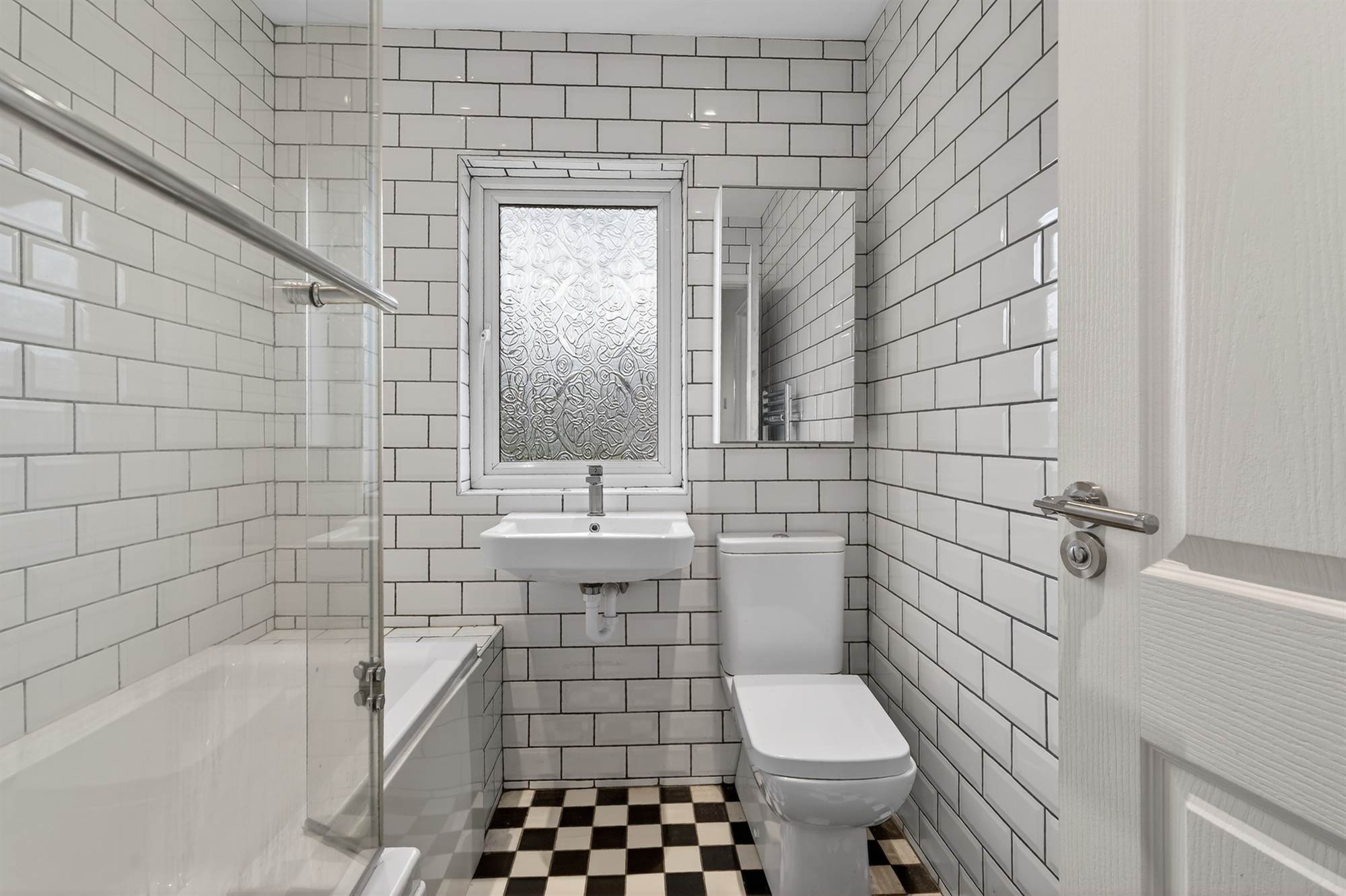 White suite comprising low flush wc, panelled bath with overhead shower, wash hand basin, fully tiled walls, chrome heated towel rail, low voltage spotlights, tiled floor.