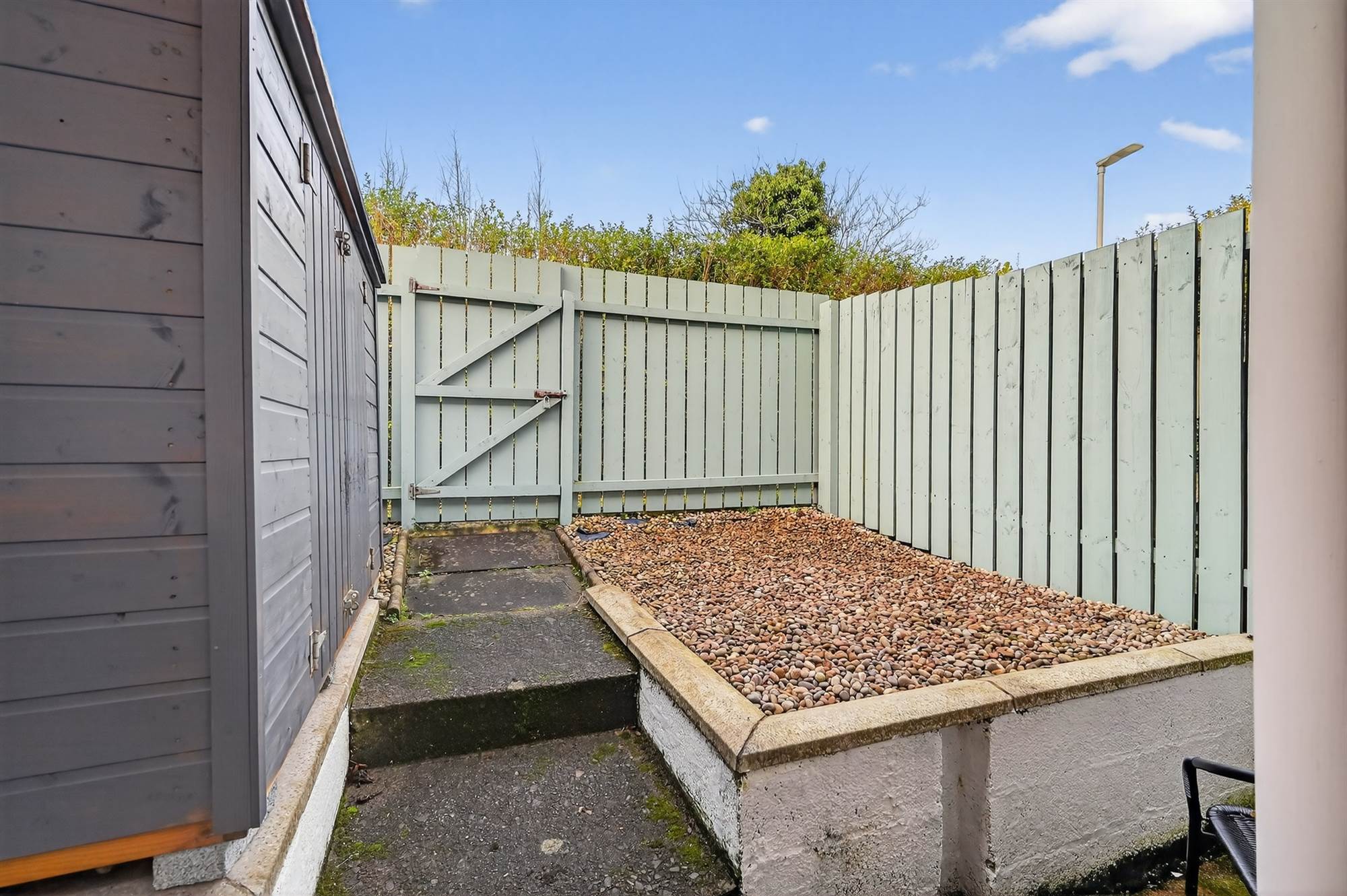 Private and enclosed pebbled rear garden with timber shed
