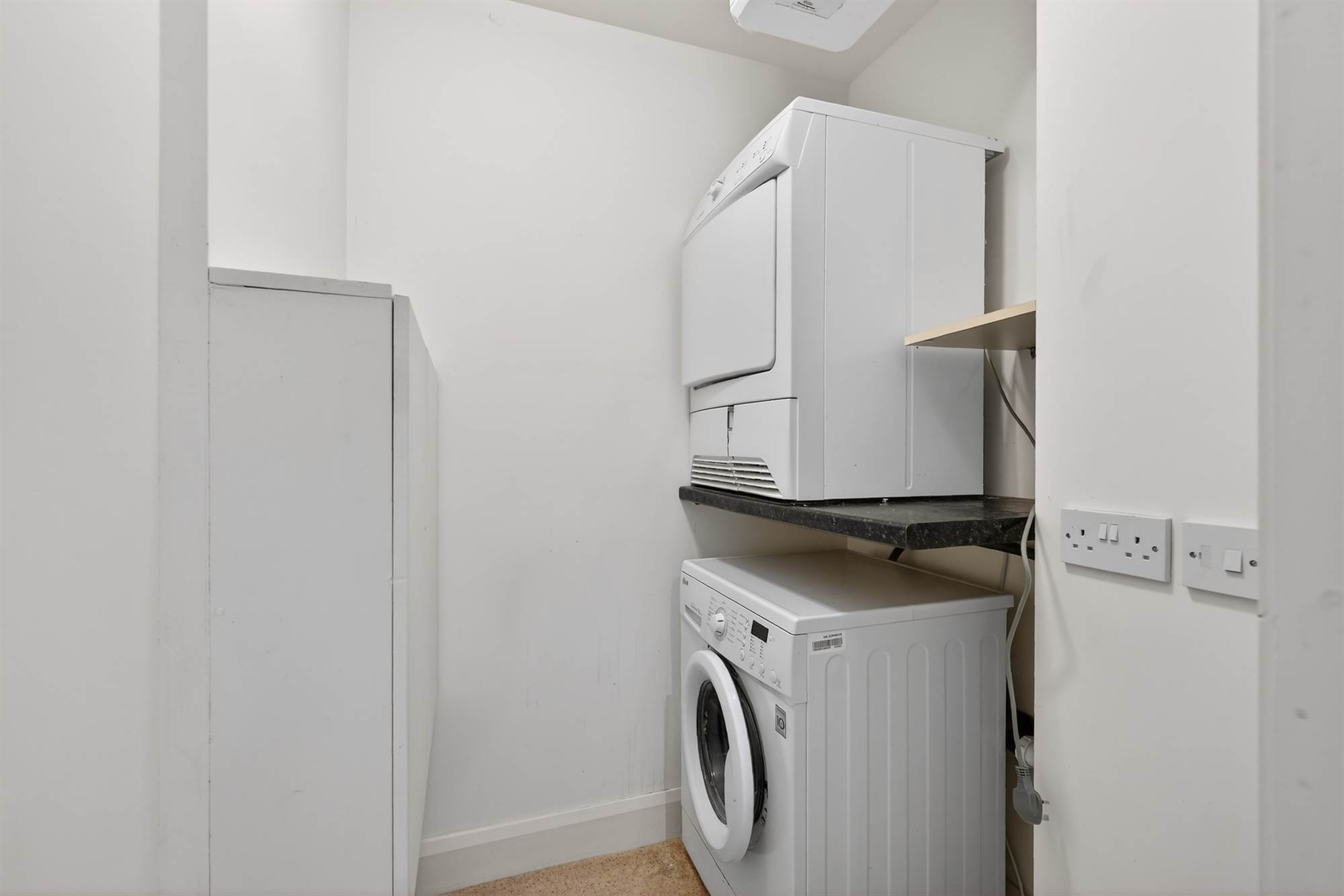Plumbed for washing machine. Space for tumble dryer. Shelving.