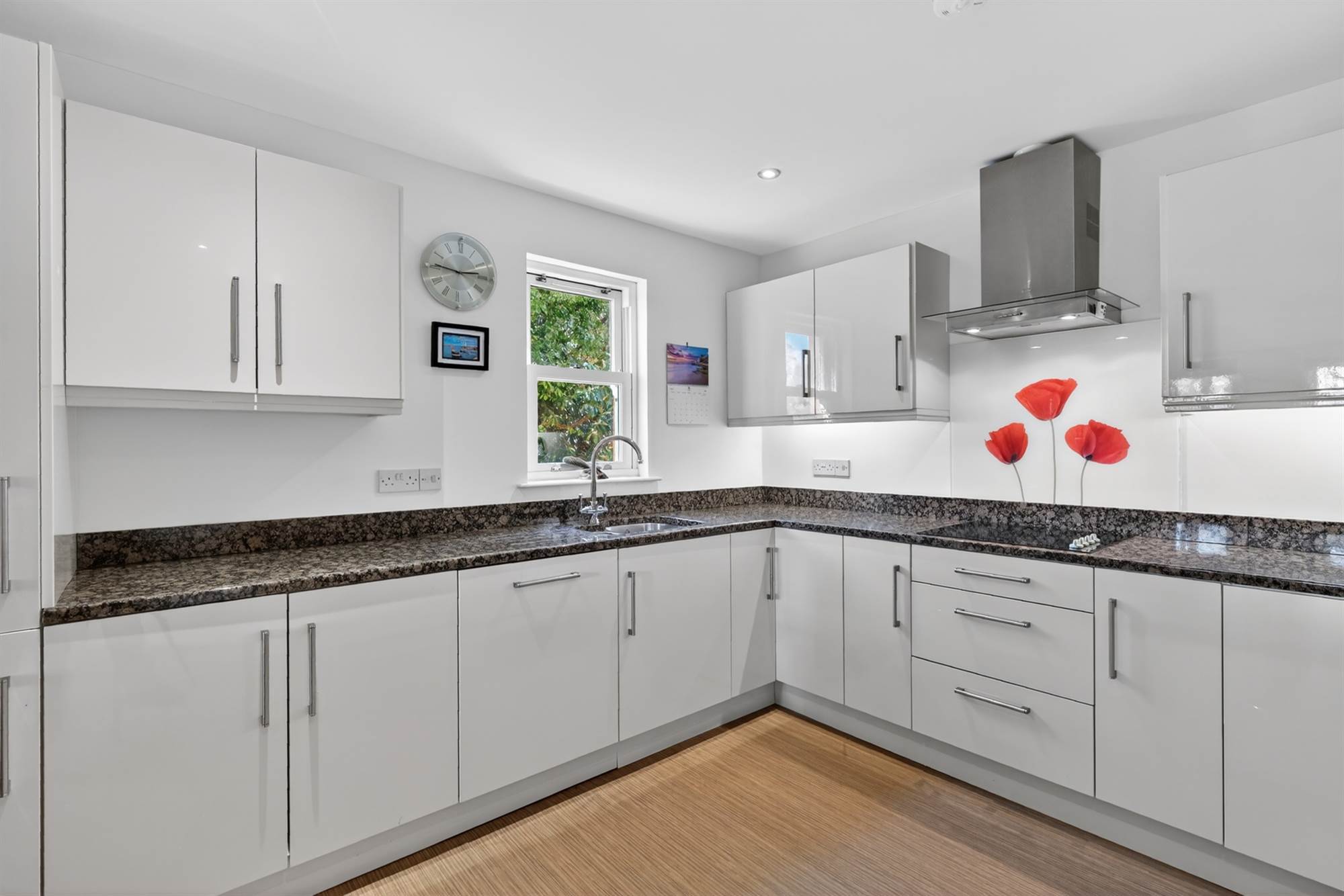 Modern fitted kitchen with range of high and low level units, Granite work surfaces, stainless steel 1.5 Belfast sink unit, integrated fridge/freezer, electric built in oven, 4 ring electric hob, integrated dish washer, low voltage spotlighting.