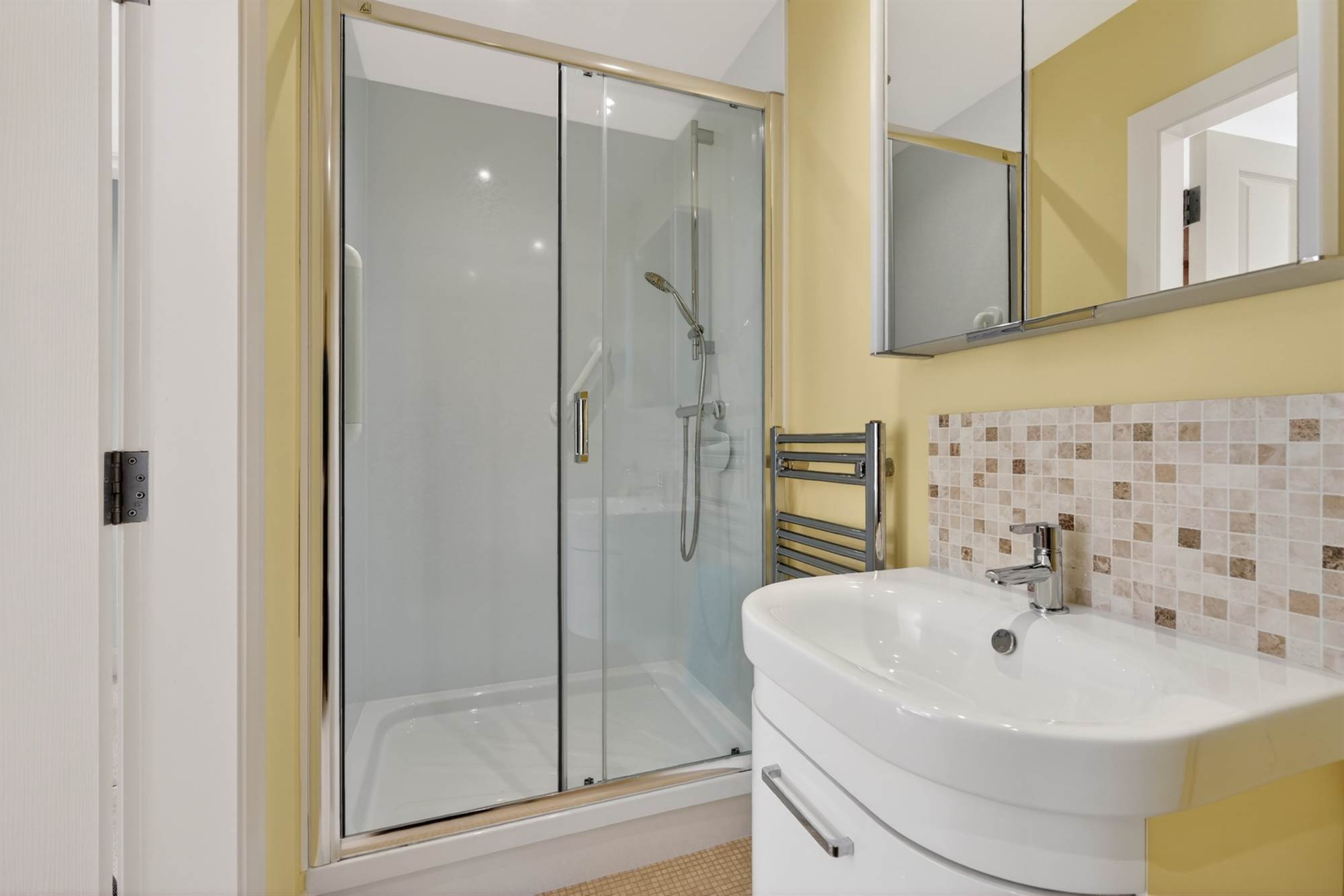 Shower cubicle, vanity sink unit, low flush WC, low voltage spotlighting, chrome heated towel rail.
