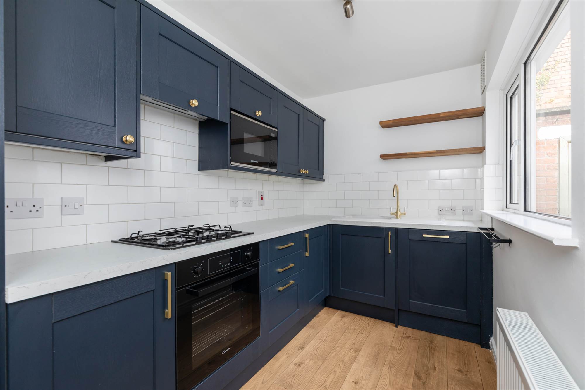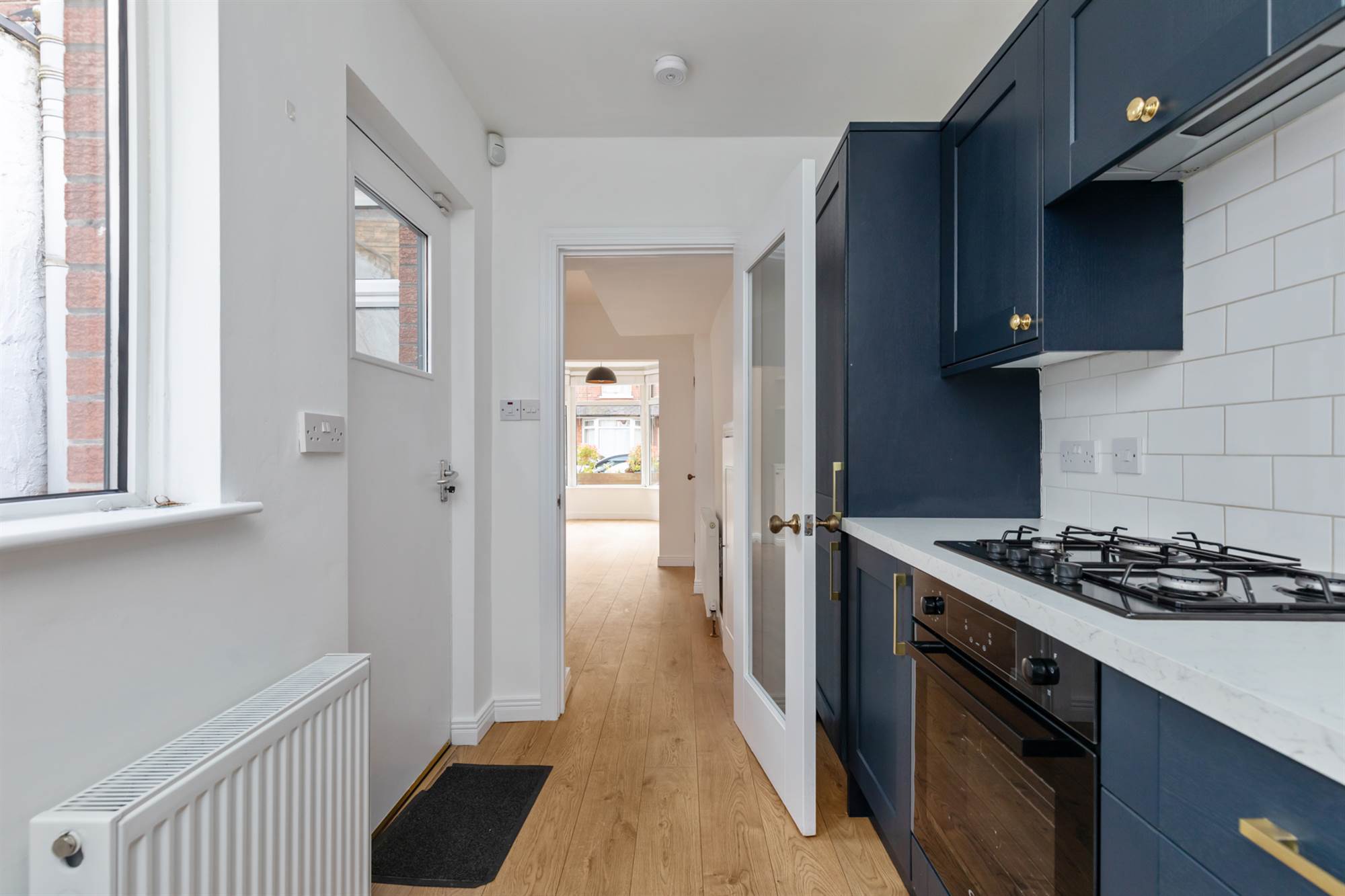 Range of high and low level units. Single drainer stainless steel sink with mixer tap. Integrated appliances including four ring gas hob with matching underbench oven. Extractor fan. Fridge-freezer. Dishwasher. Microwave. Back door to rear yard.