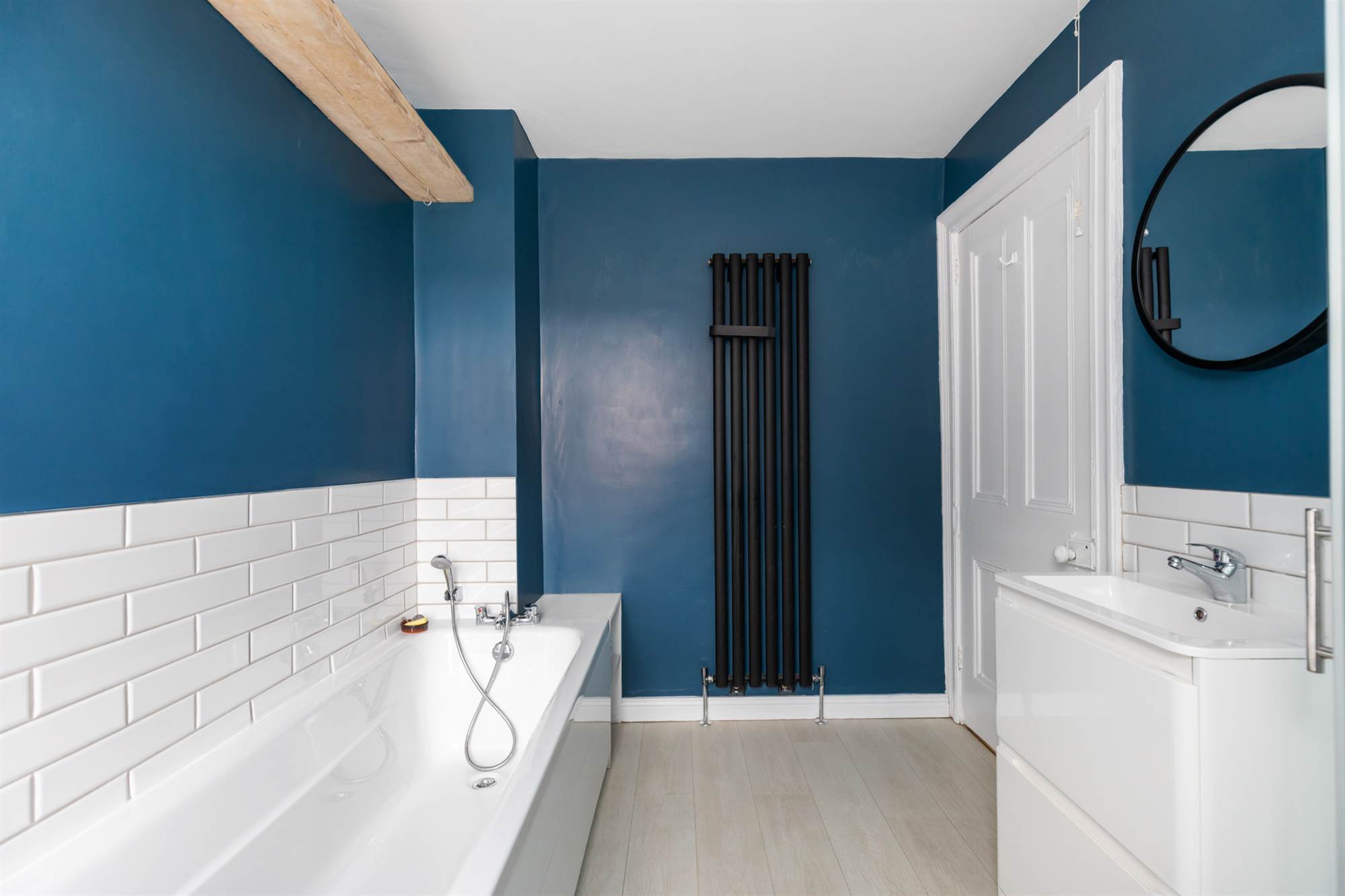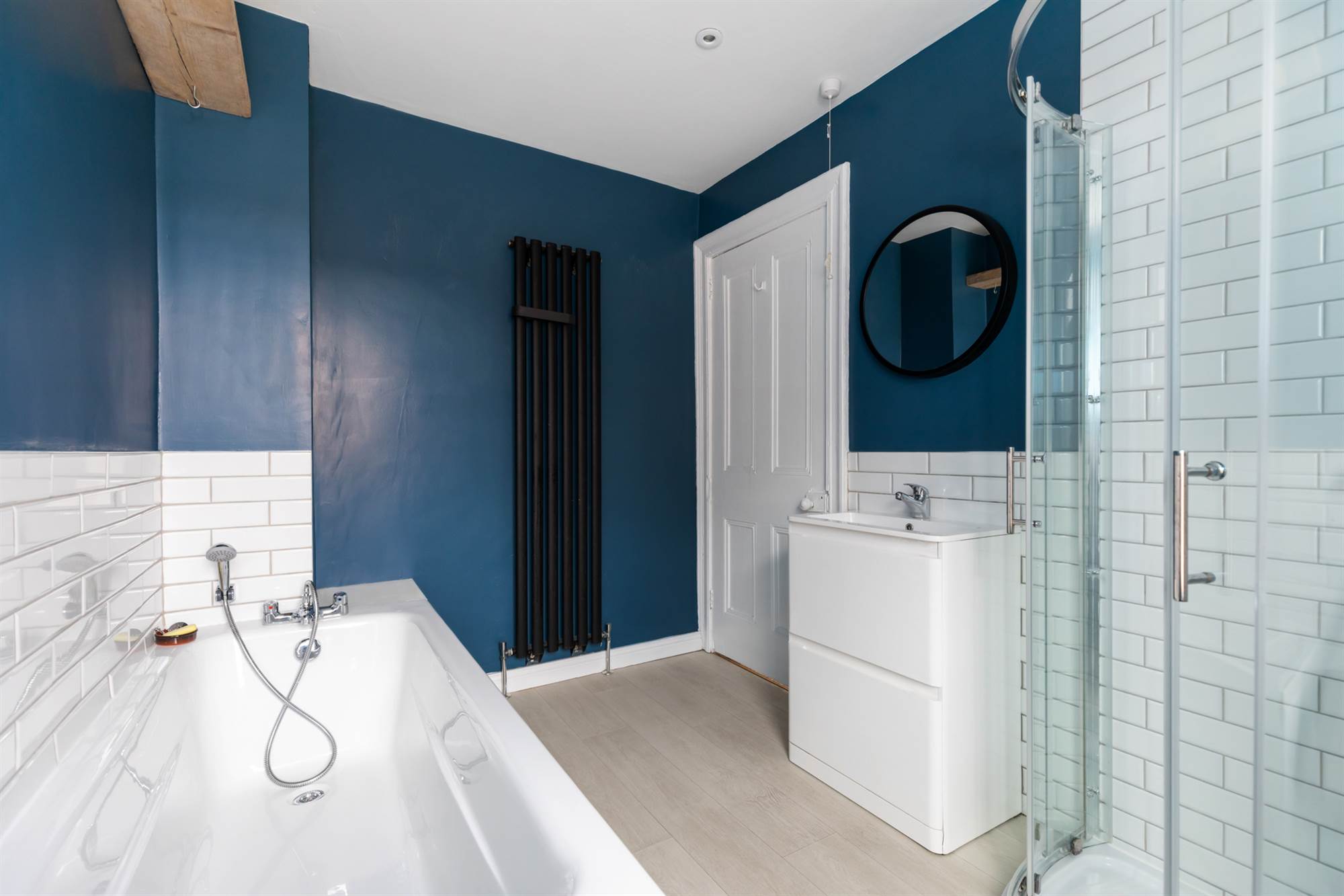 Contemporary white suite comprising panelled bath with telephone hand shower. Separate corner shower cubicle with attractive tiling and "drench" shower and additional telephone hand shower. Wash hand basin with storage underneath. Low flush wc. Part tiled walls. Feature radiator.