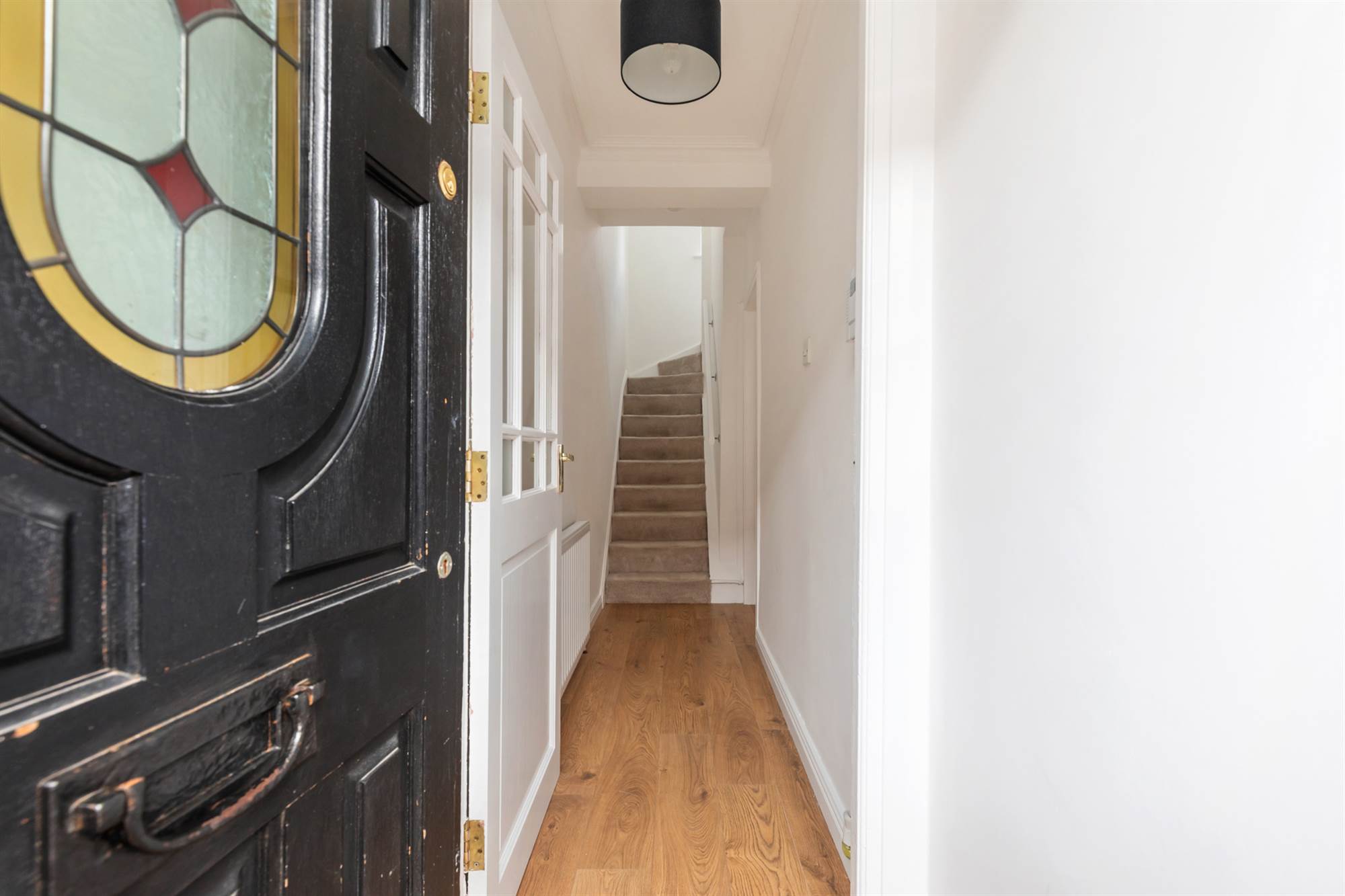 Front door with leaded stained glass inset to . . .
