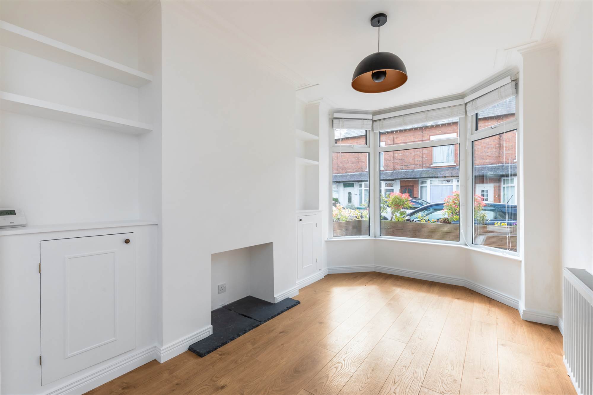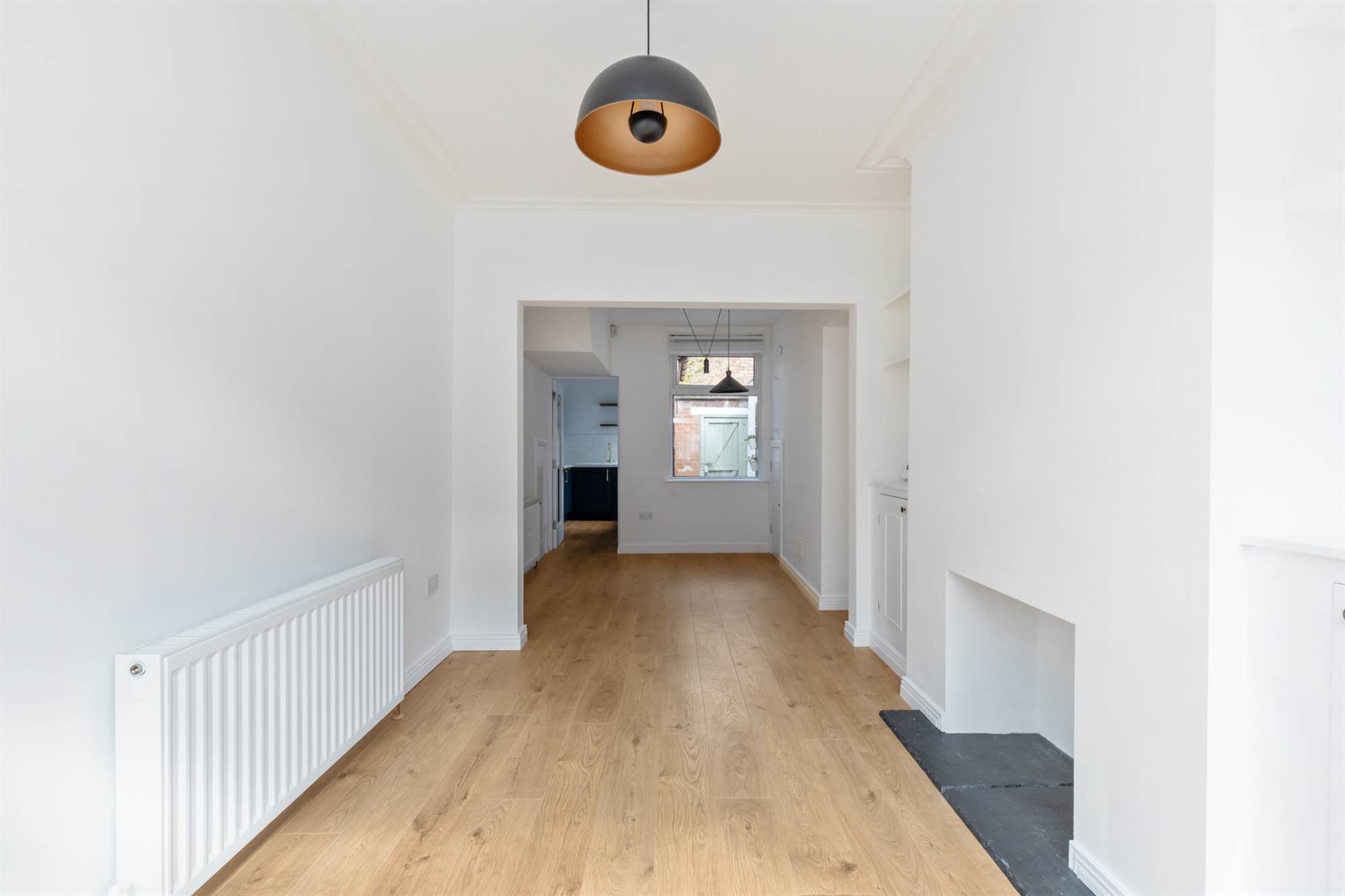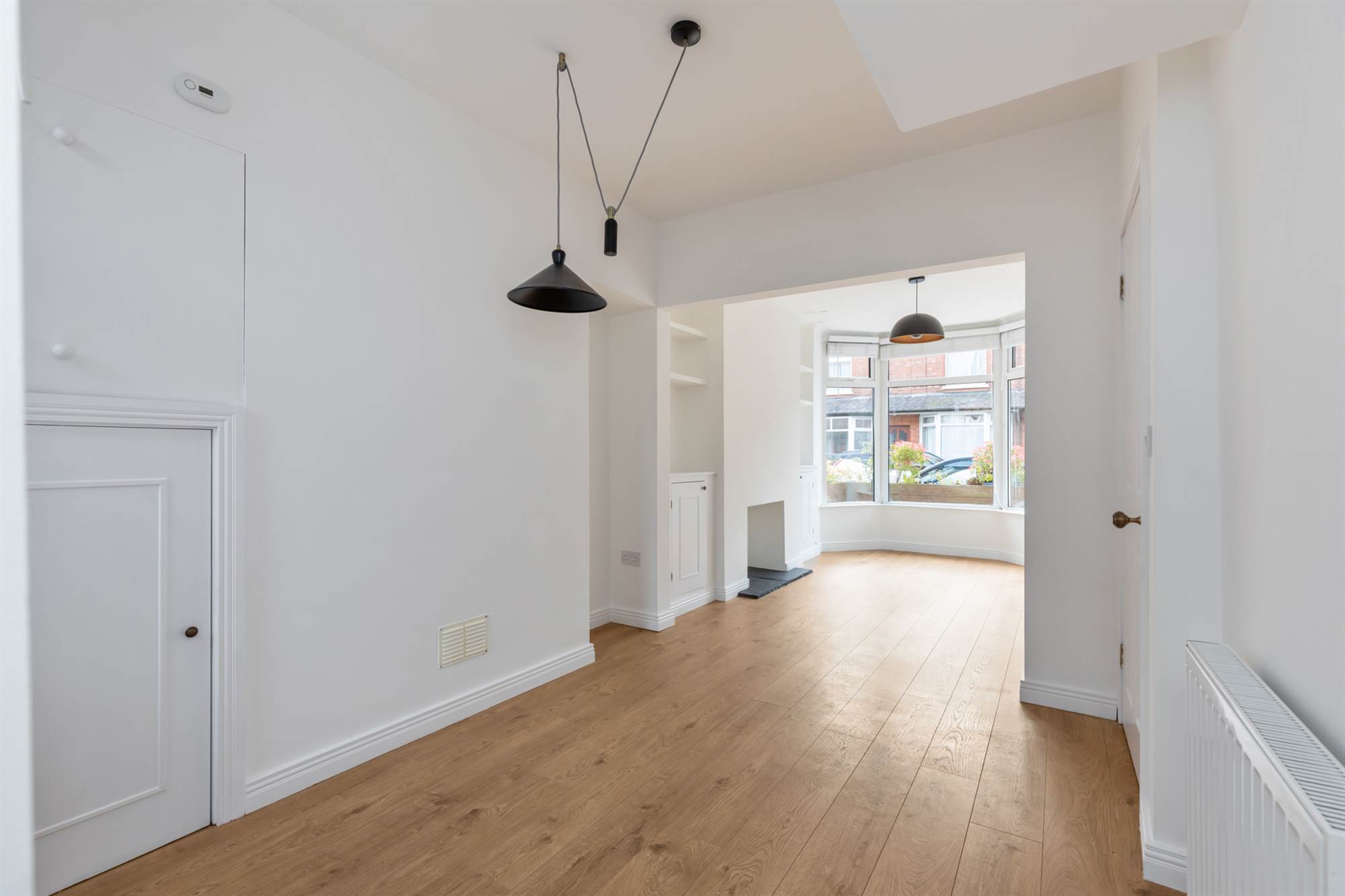 (at widest points and into bay). Recessed shelving and cupboards. Fireplace (currently sealed) with slate hearth. Open plan to . . .