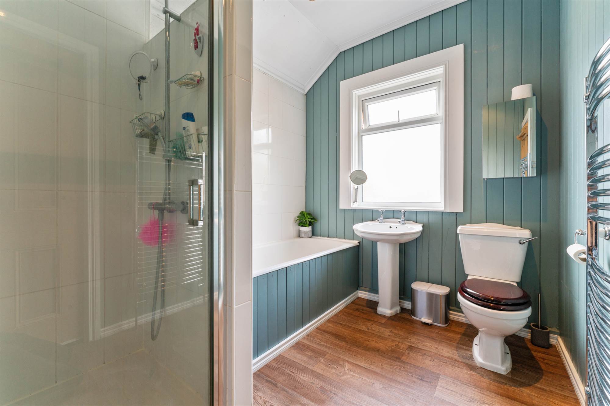 White suite comprising: Dual flush W.C. Pedestal wash hand basin with chrome mixer taps. Panelled bath with mixer taps. Separate shower cubicle with thermostatic shower. Chrome heated towel rail. Part tiled walls. Part panelled walls. Access to roofspace.
