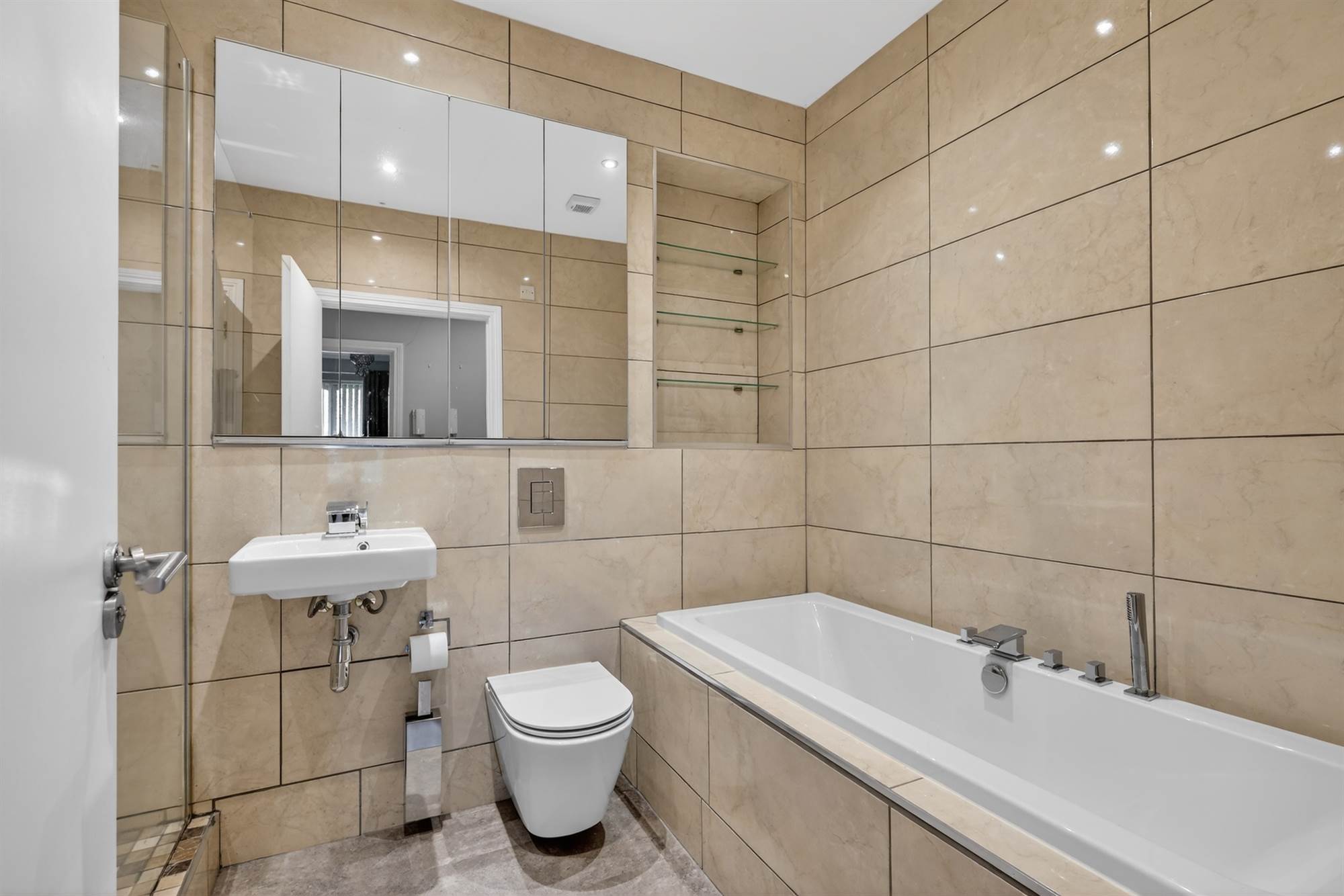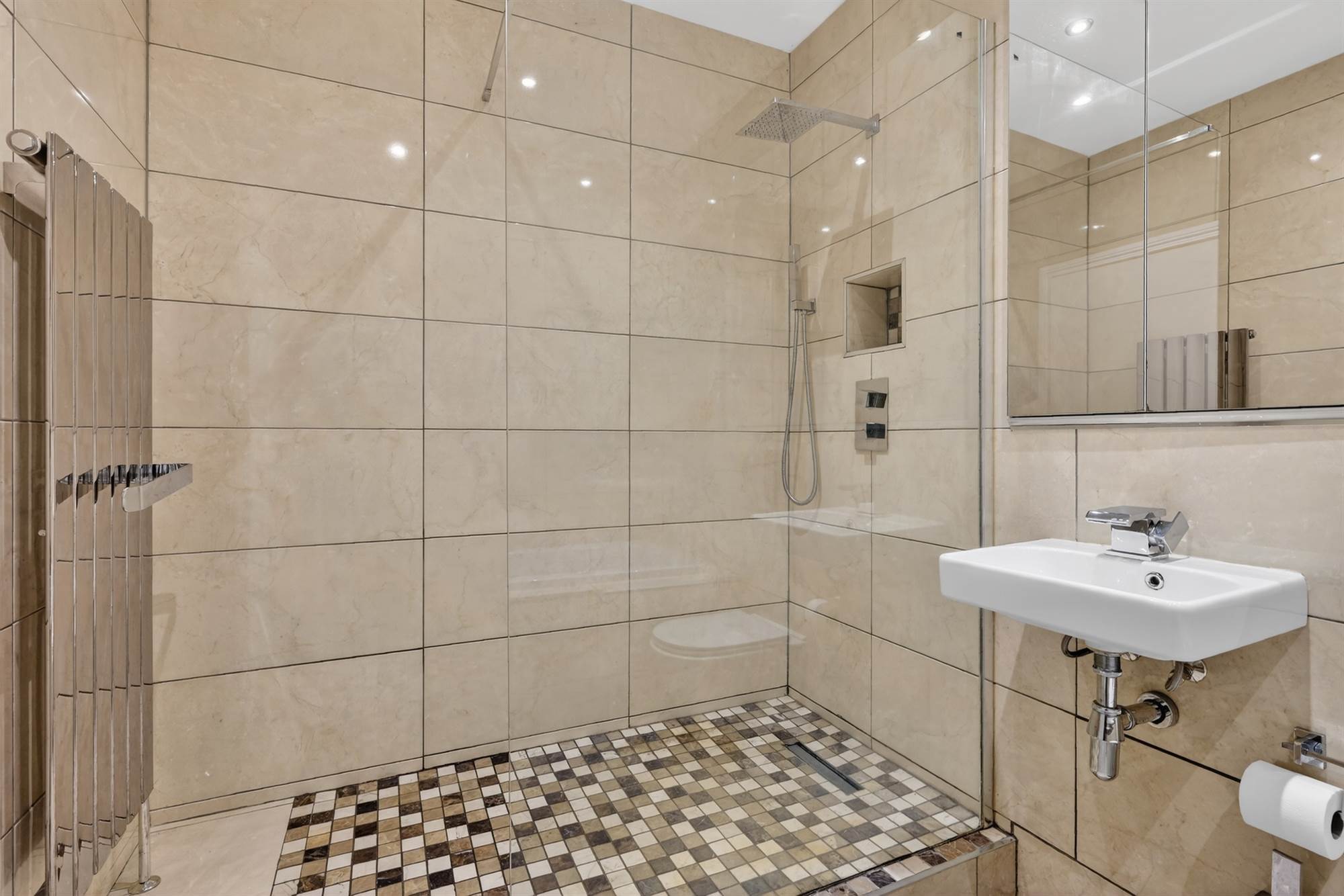 White suite comprising floating wash hand basin with mixer tap, wall-mounted mirror cabinet. Walk-in shower cubicle with rain head thermostatic shower, low flush wc, feature vertical radiator. In-set shelving. Spotlights, fully tiled walls.