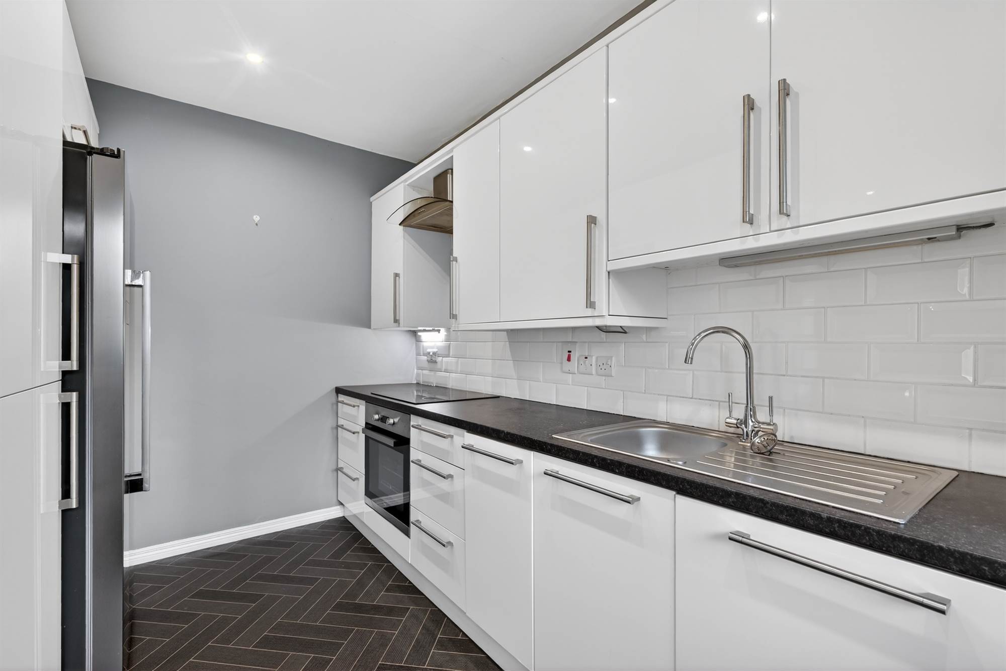 Modern range of high gloss units, work surfaces. Stainless steel sink unit with mixer taps. Underbench oven, four ring hob, extractor fan. Space for American style fridge/freezer. Plumbed for washing machine, plumbed for dishwasher, undercounter lighting. Housing for gas boiler, spotlights.