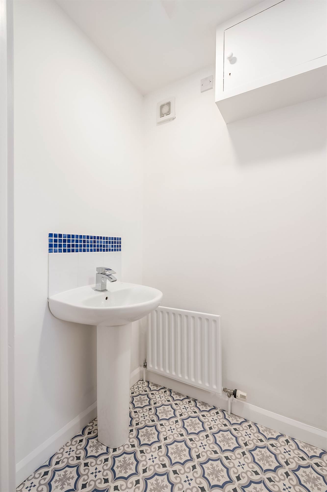 Low flush WC, wash hand basin, tiled splashback. Baxi gas boiler.