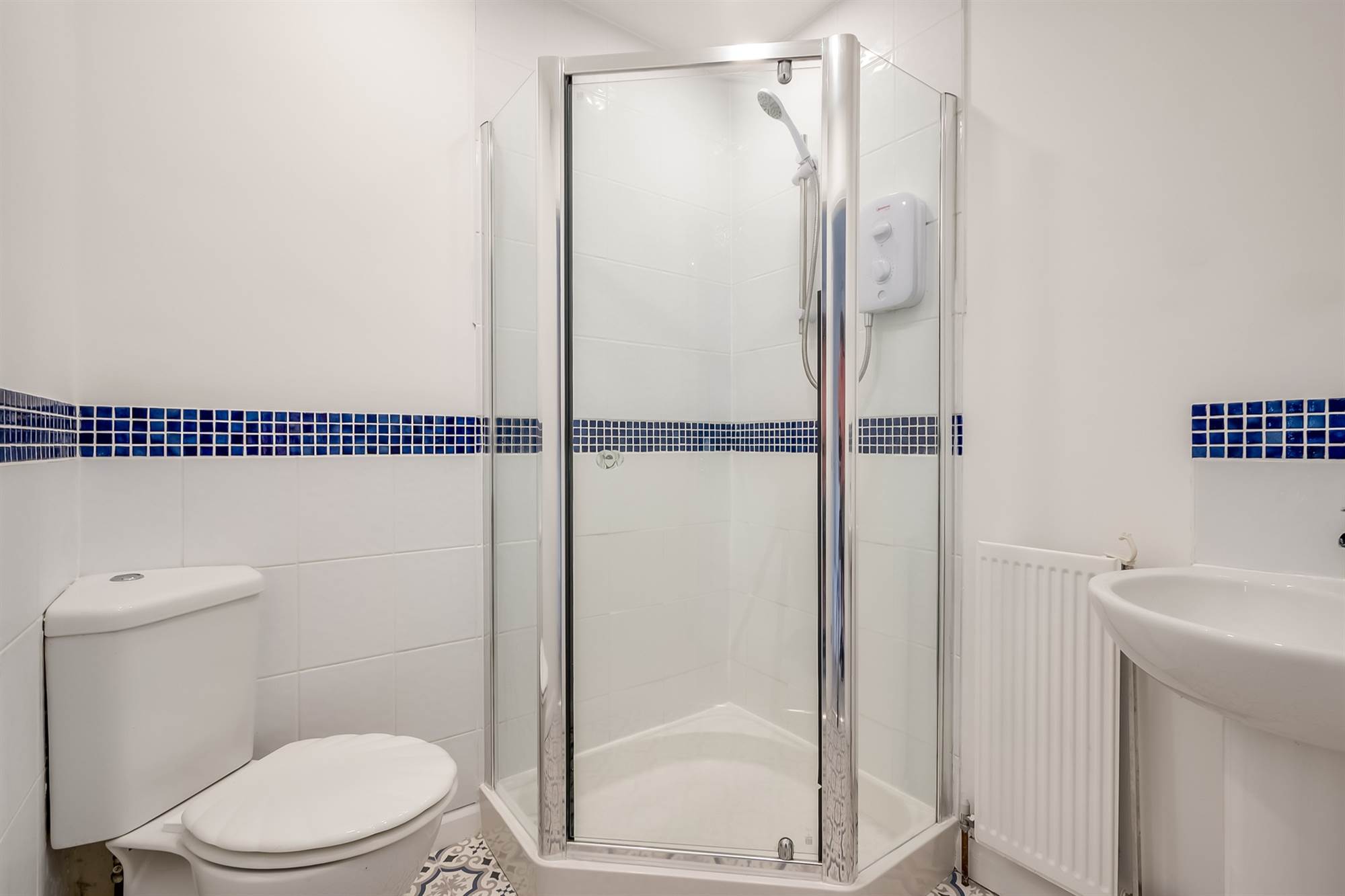 Comprising tiled corner shower with Redring electric shower. Pedestal wash hand basin with tiled splashback. Low flush WC. Part tiled walls.
