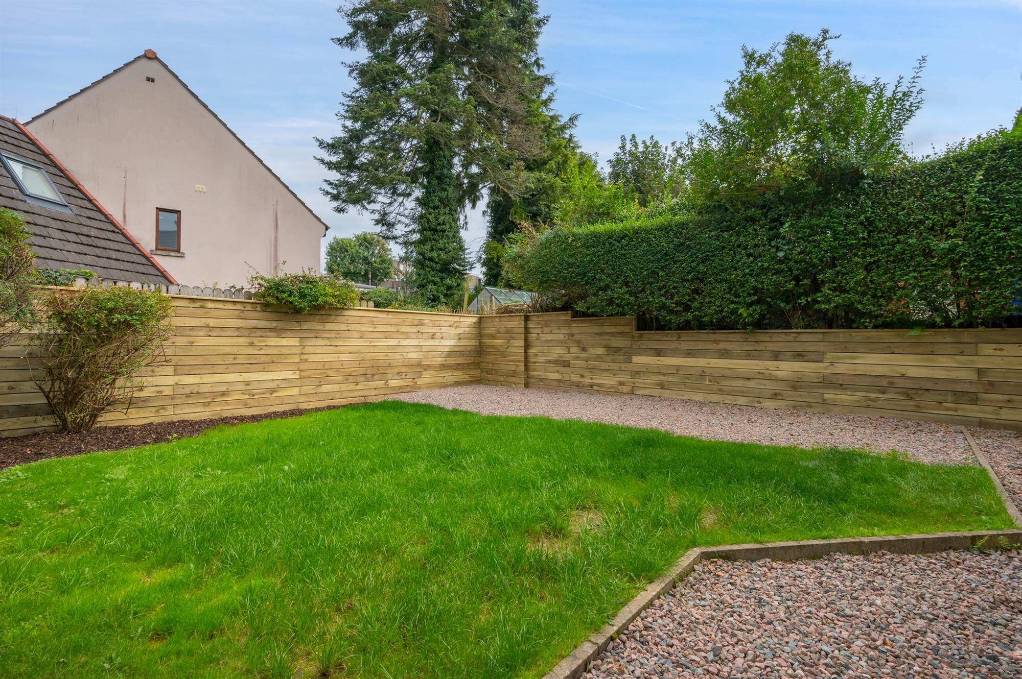 In lawn with pink-pebbled sitting area. Variety of plants and shrubs in flower beds laid in bark chips. Outside tap. Newly installed boundary fencing.