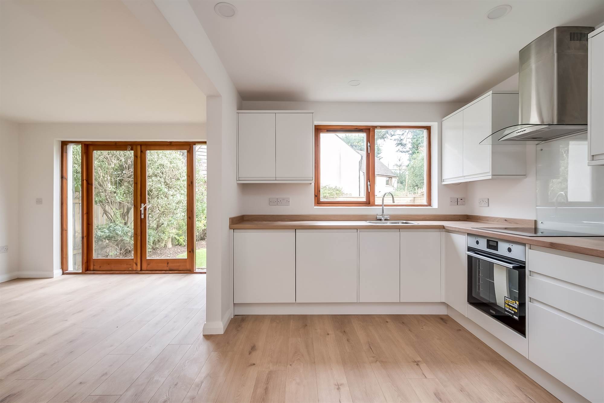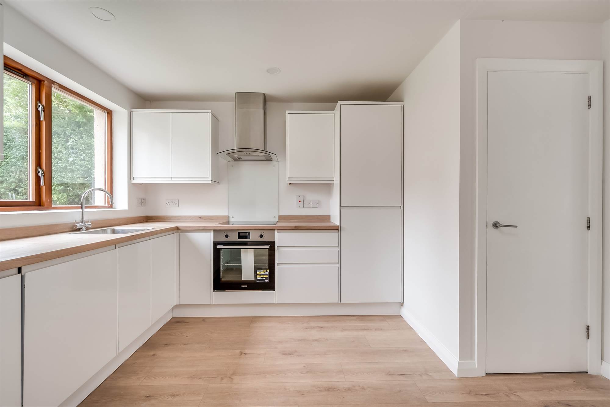 (At widest points) Newly fitted range of high and low level high-gloss units. Stainless steel sink unit with mixer tap. Integrated appliances including Zanussi induction hob and matching under bench oven, Beko fridge and freezer. Dishwasher, washing machine. Access to understairs storage cupboard.