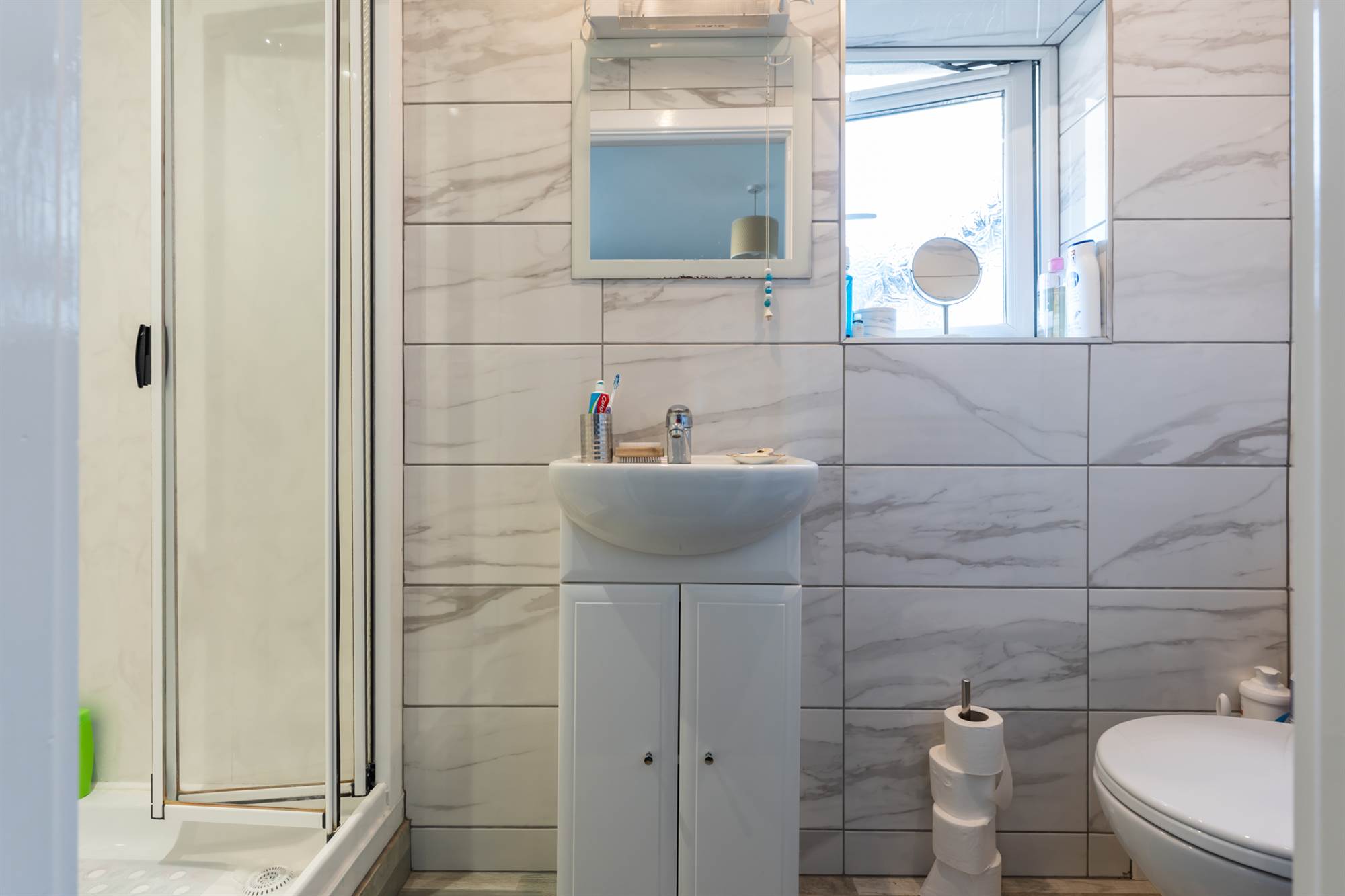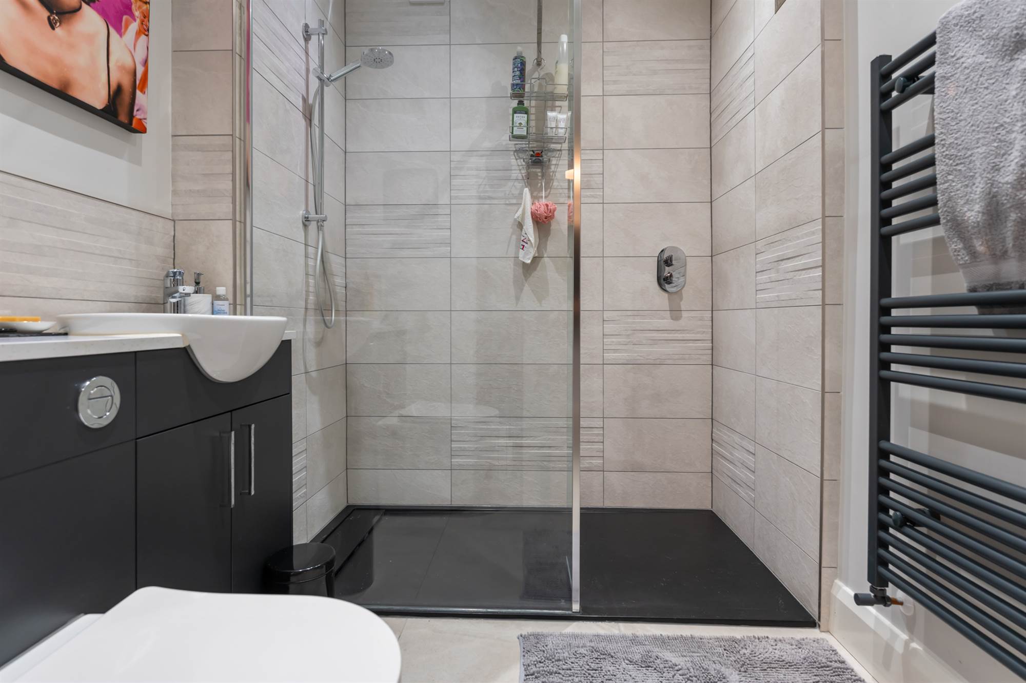 (Installed 2023). Walk-in shower enclosure with chrome fittings. Vanity unit with integrated wash hand basin, low flush wc and storage. Ceramic tiled floor, part tiled walls, heated towel rail.