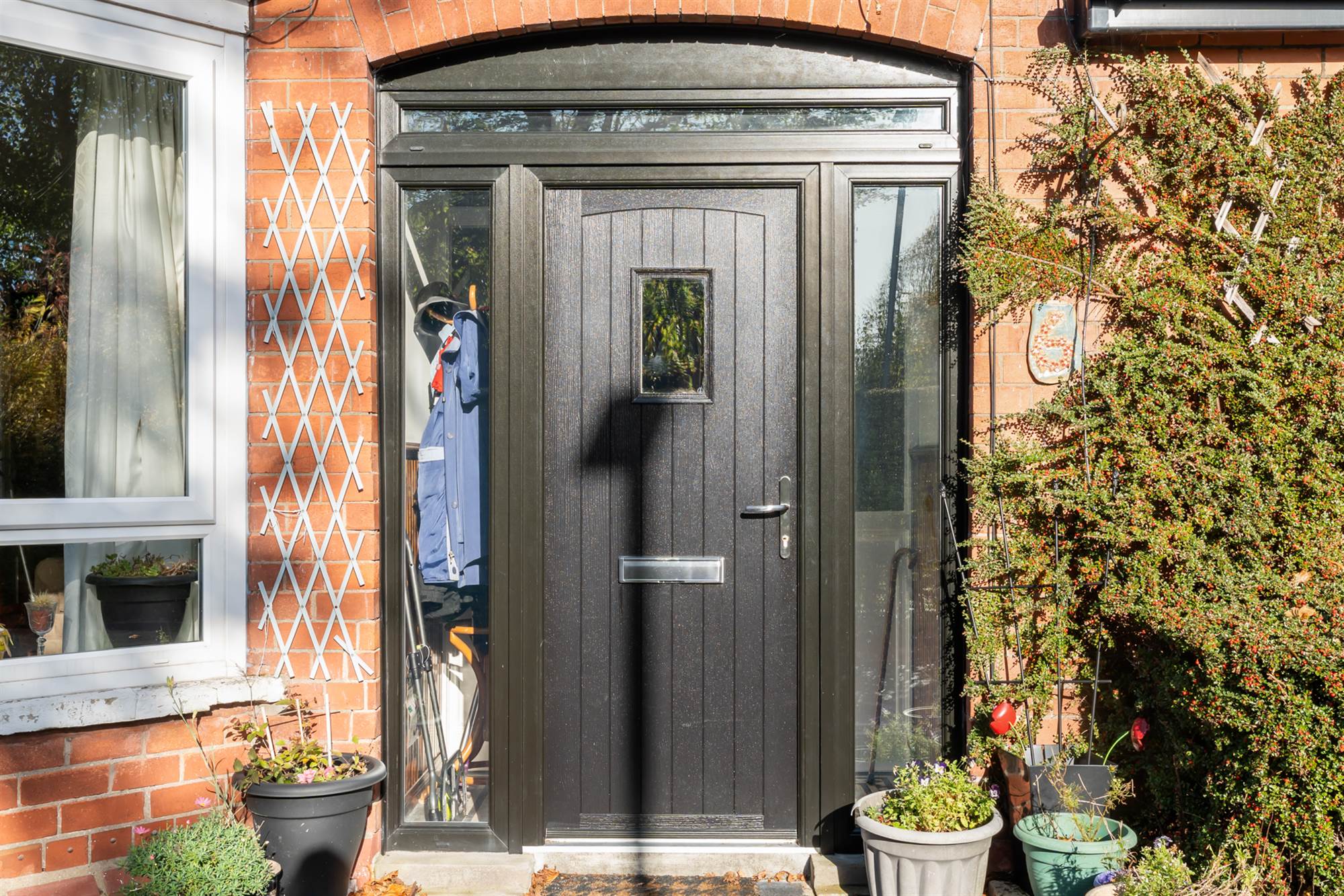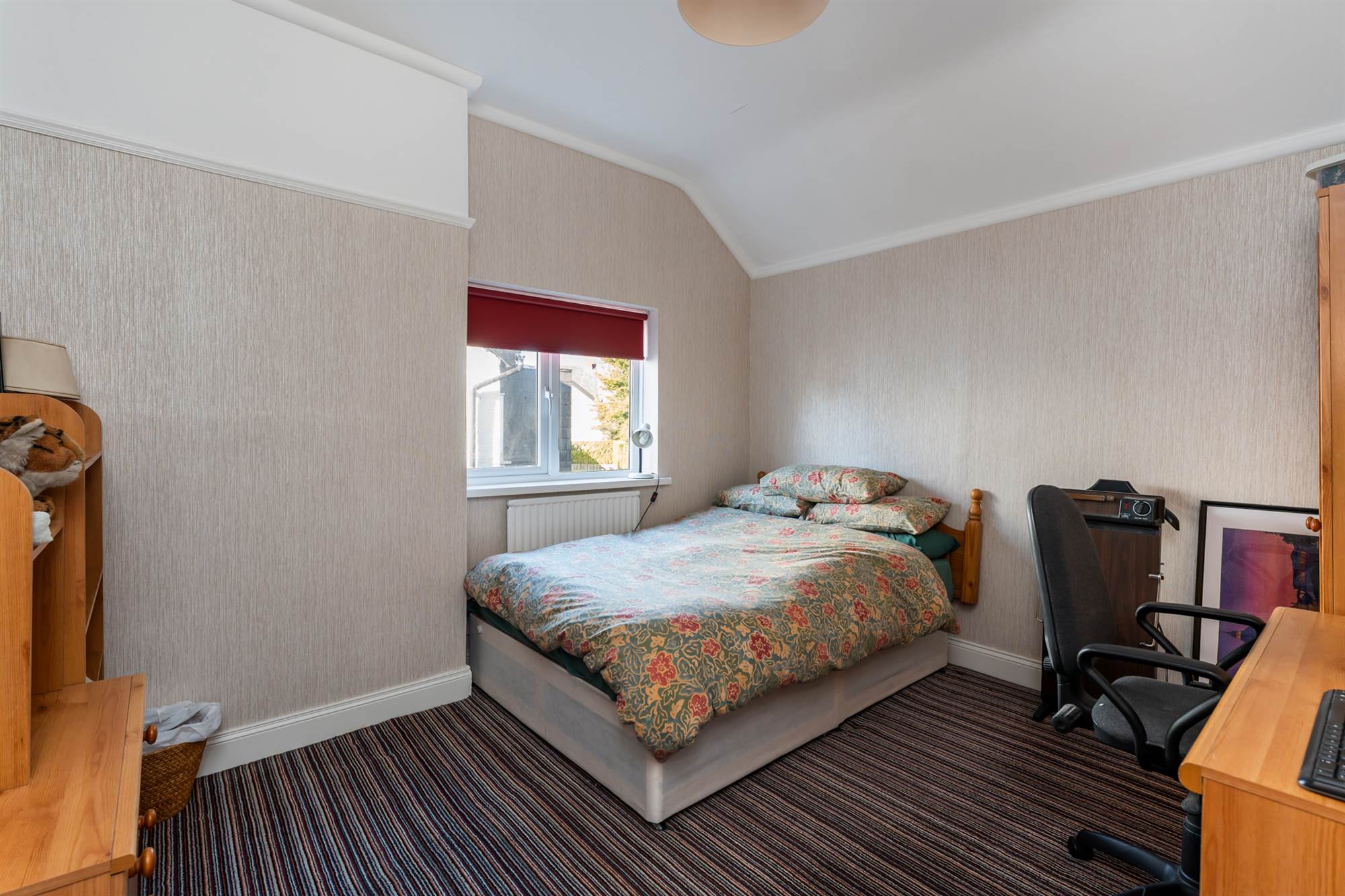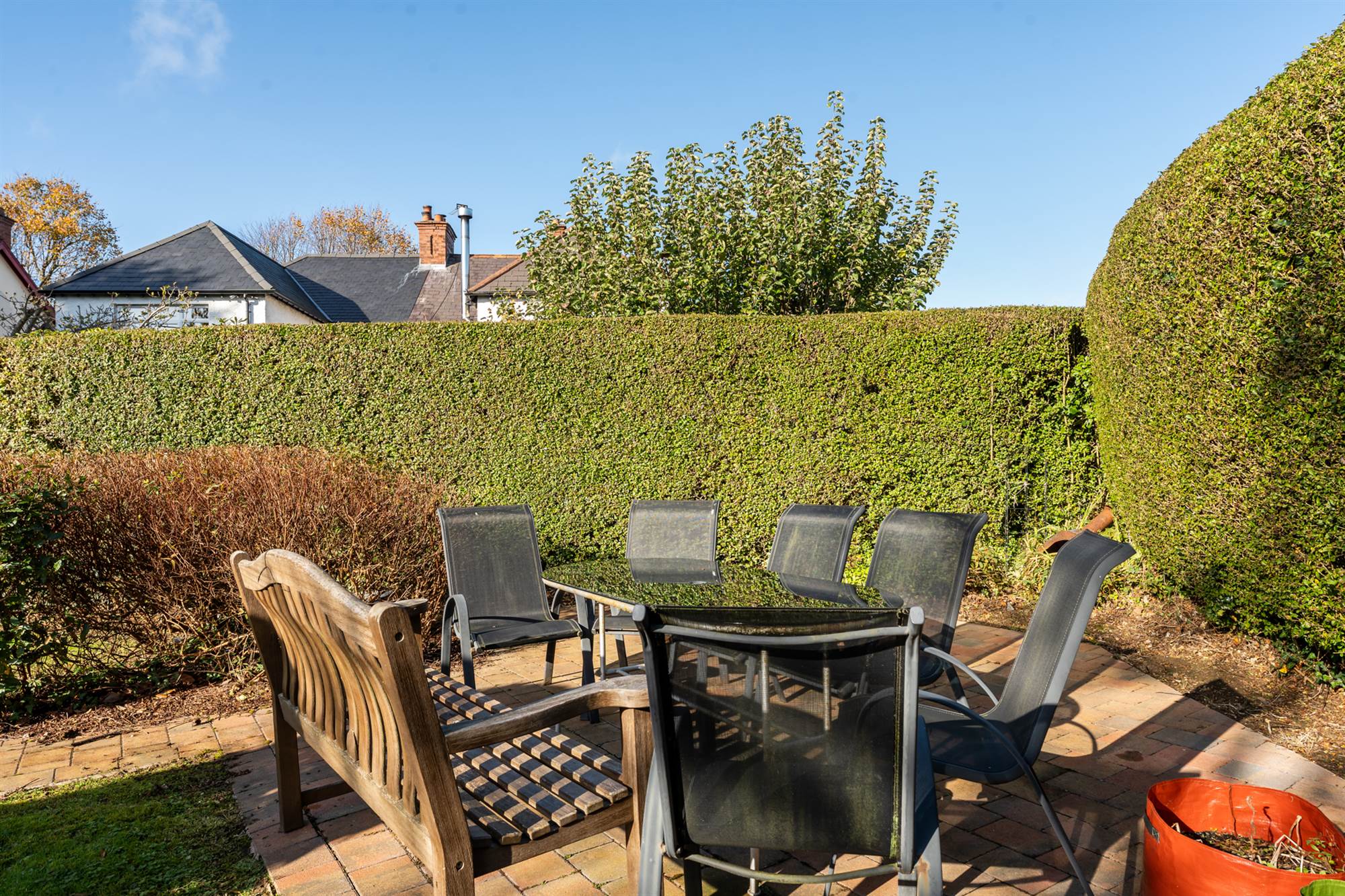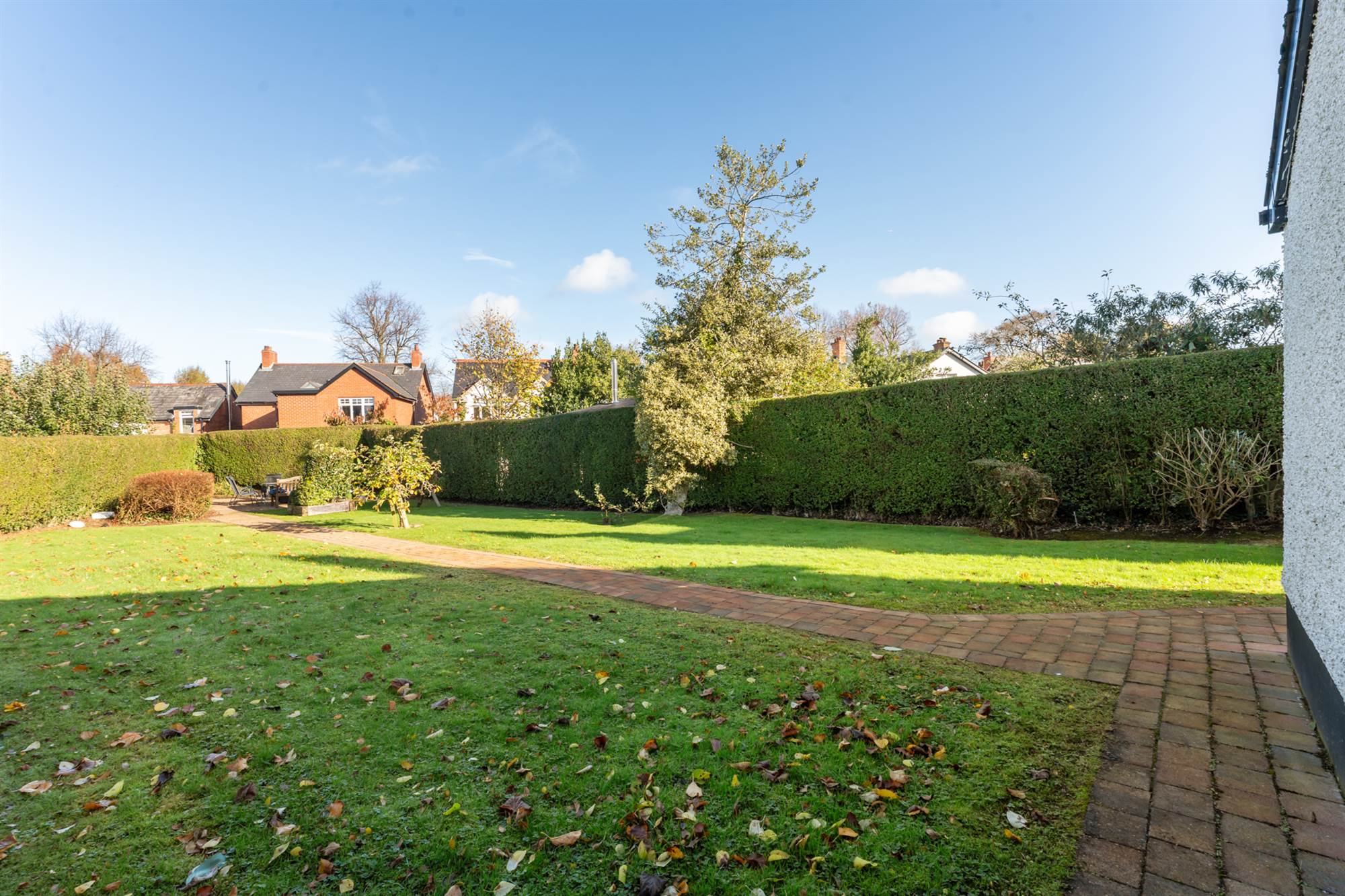 Good sized garden, mainly in lawns. Brick pavior path leading to patio/sitting area (catches evening sun). Variety of plants, trees and shrubs. PVC oil tank. Path to side with oil fired boiler housing.