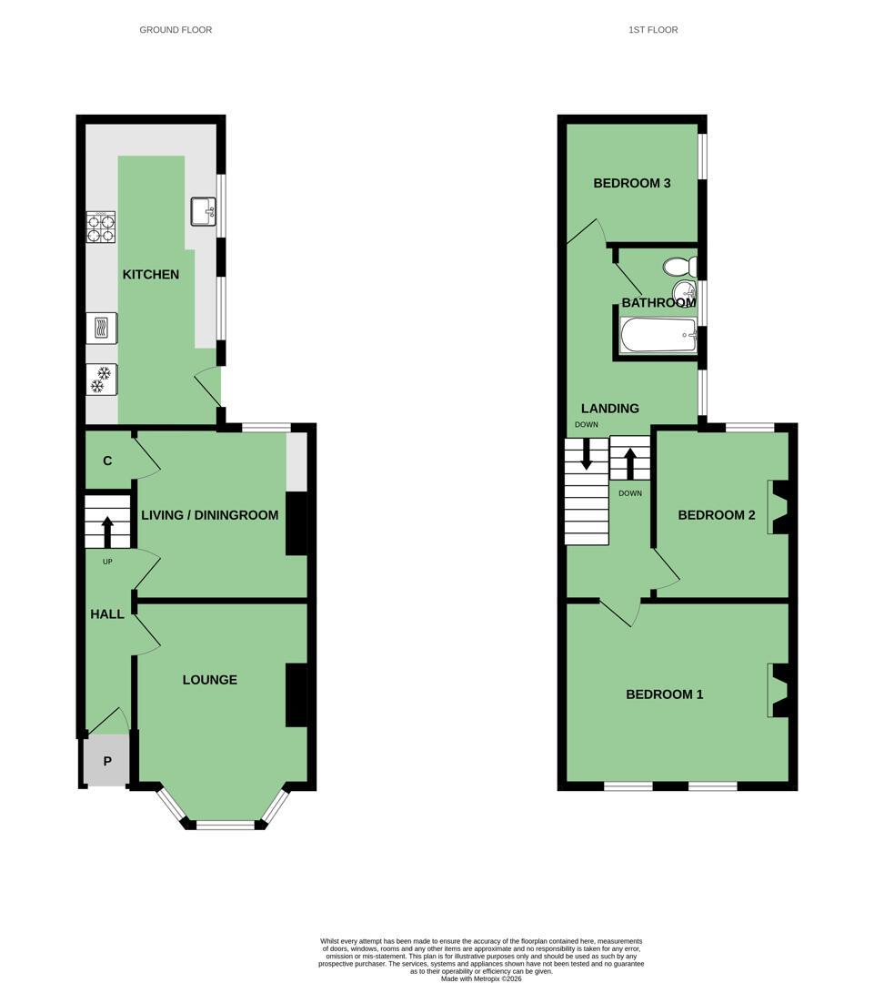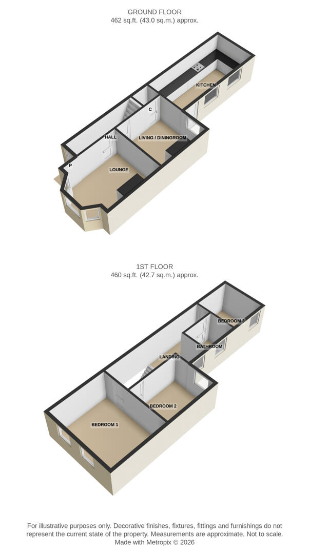 Upstairs, the property boasts three bedrooms. The principal bedroom at the front of the house is offers generous space and plenty of natural light from the twin windows. The remaining bedrooms are ideal for children, guests, or workspace. There is a bathroom with a modern white suite completing the property.