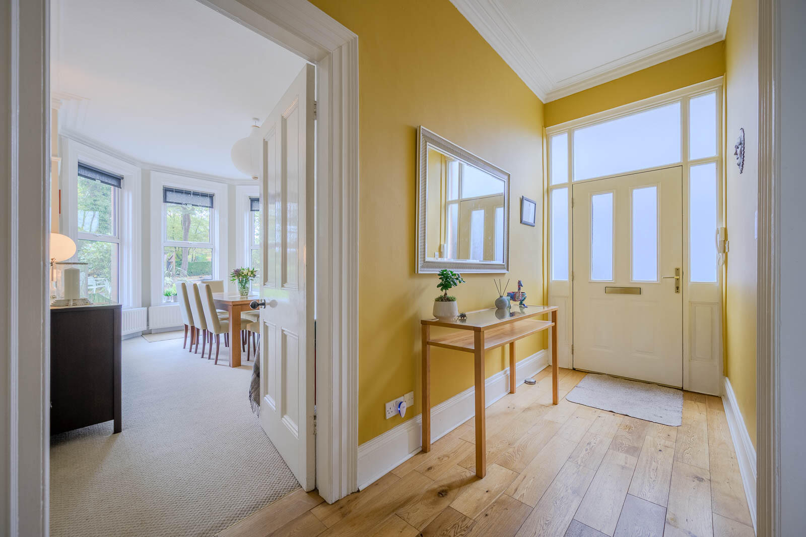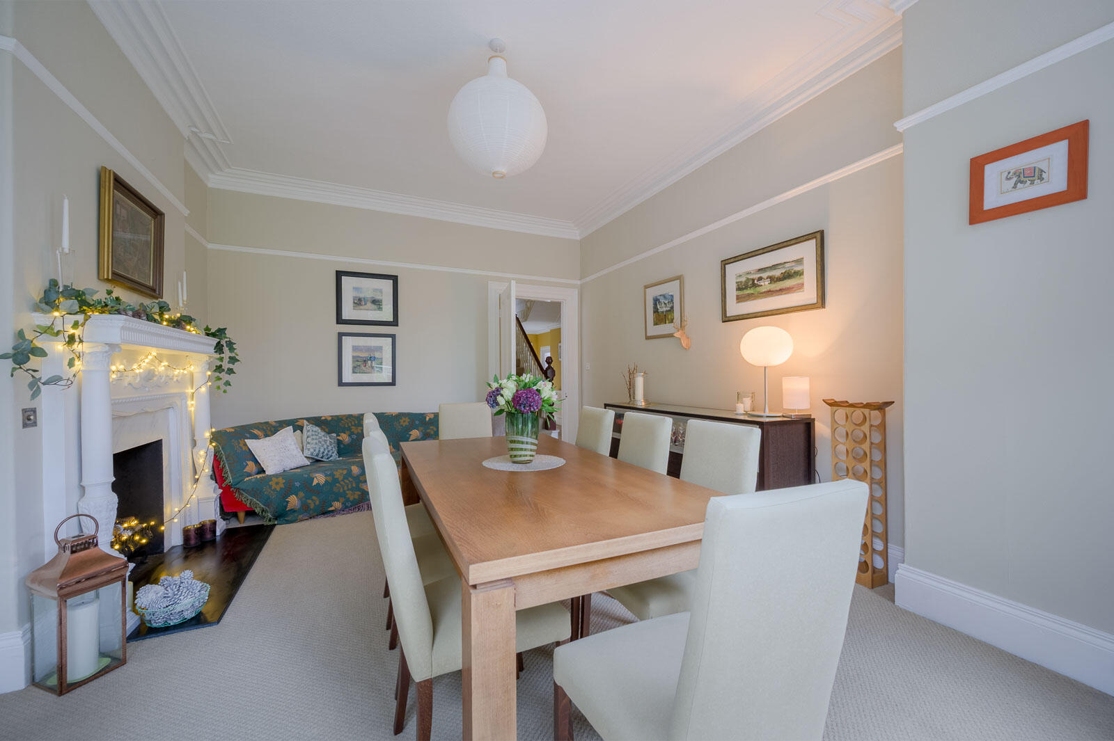 A welcoming entrance hallway with solid wood flooring, decorative coving, and an original balustrade leads to the formal dining room, rich in period character with a bay window, feature fireplace, and serene neutral décor. The adjoining lounge provides an elegant entertaining space, also with a bay window and ornate fireplace.