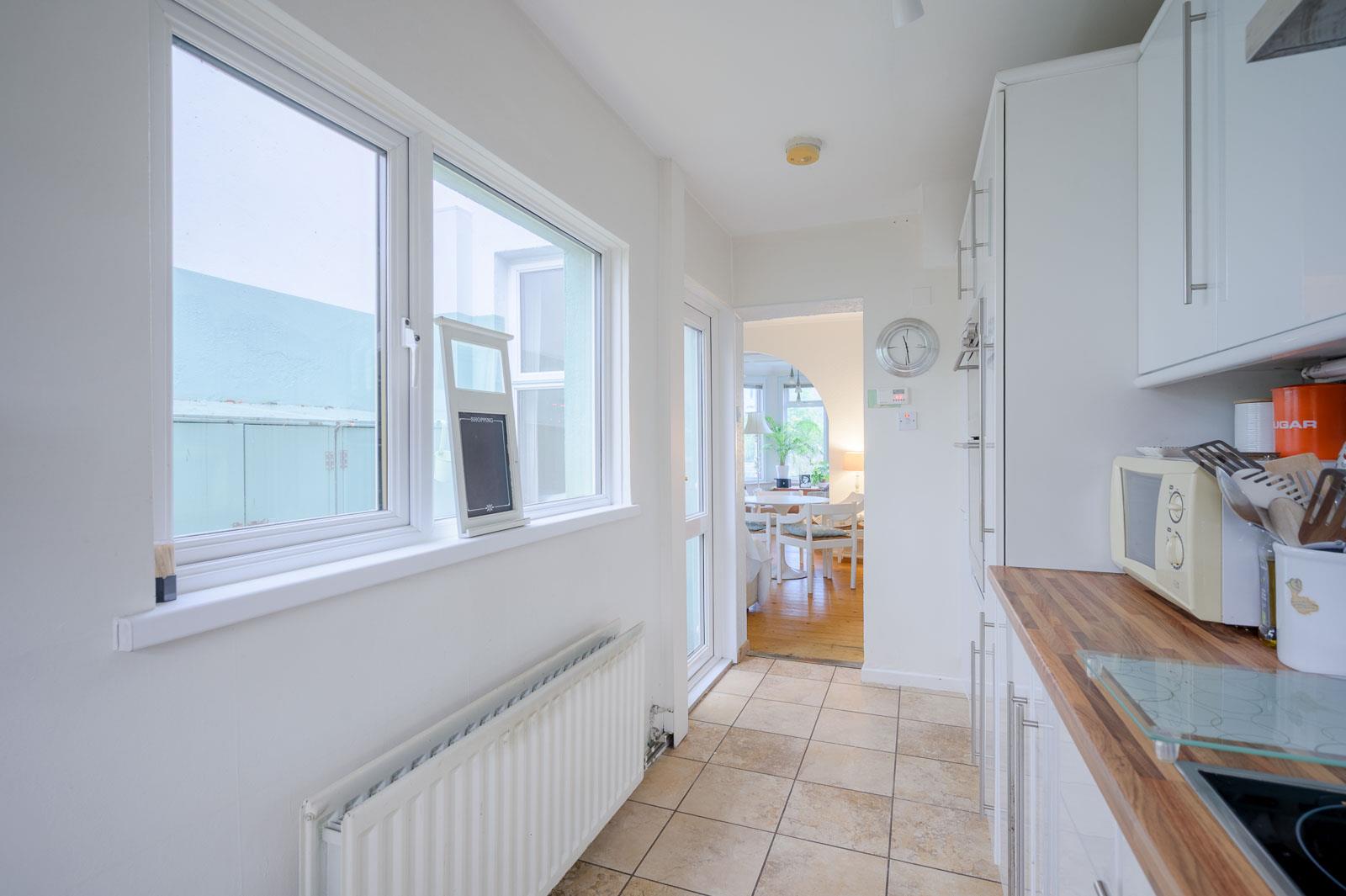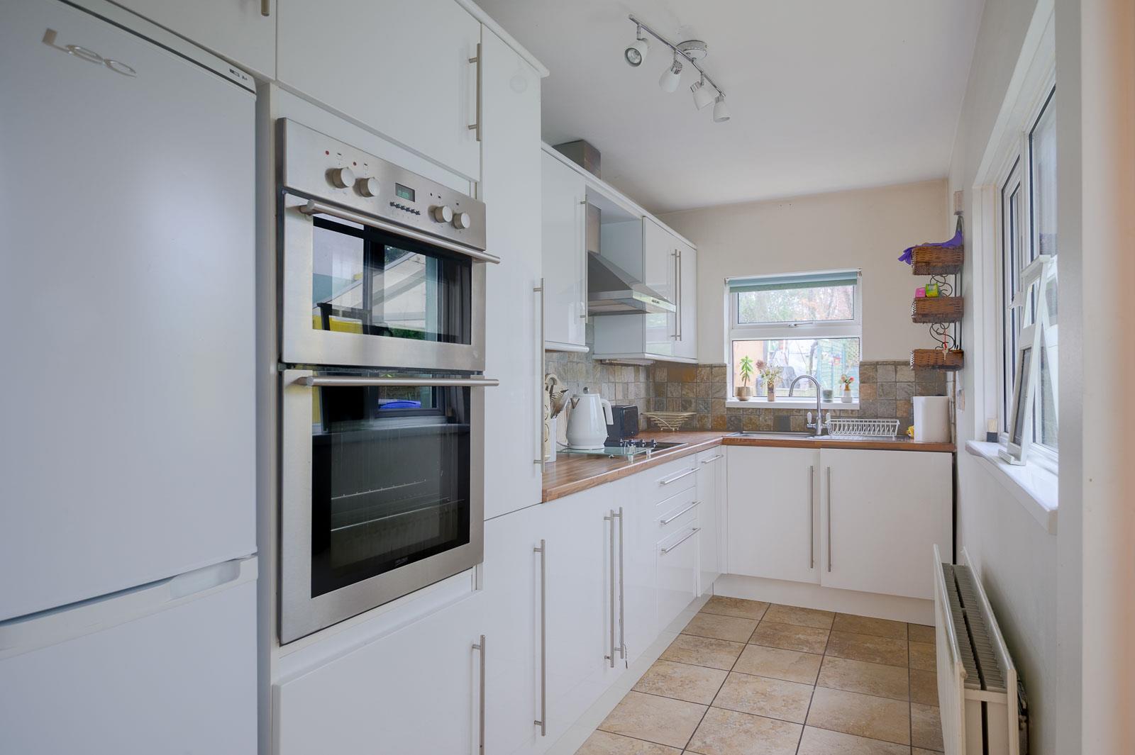 With range of high and low level white high gloss units, laminate worktop, stainless steel sink unit, ceramic hob, stainless steel extractor fan, integrated dishwasher, integrated washing machine, integrated eye level double oven, fridge freezer space, PVC double glazed back door, tiled floor, part tiled walls.