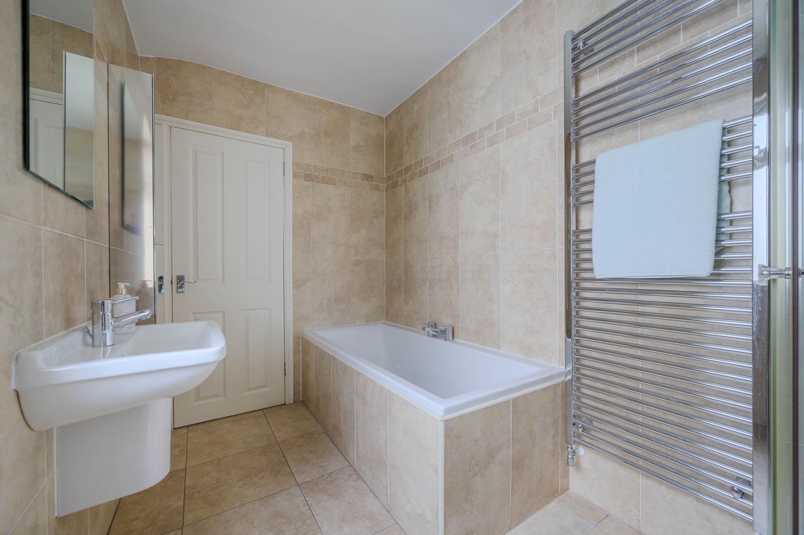 With white suite comprising panelled bath, chrome mixer tap, corner shower cubicle, thermostatic shower, semi pedestal wash hand basin, low flush WC, chrome heated towel rail, tiled floor, tiled walls.