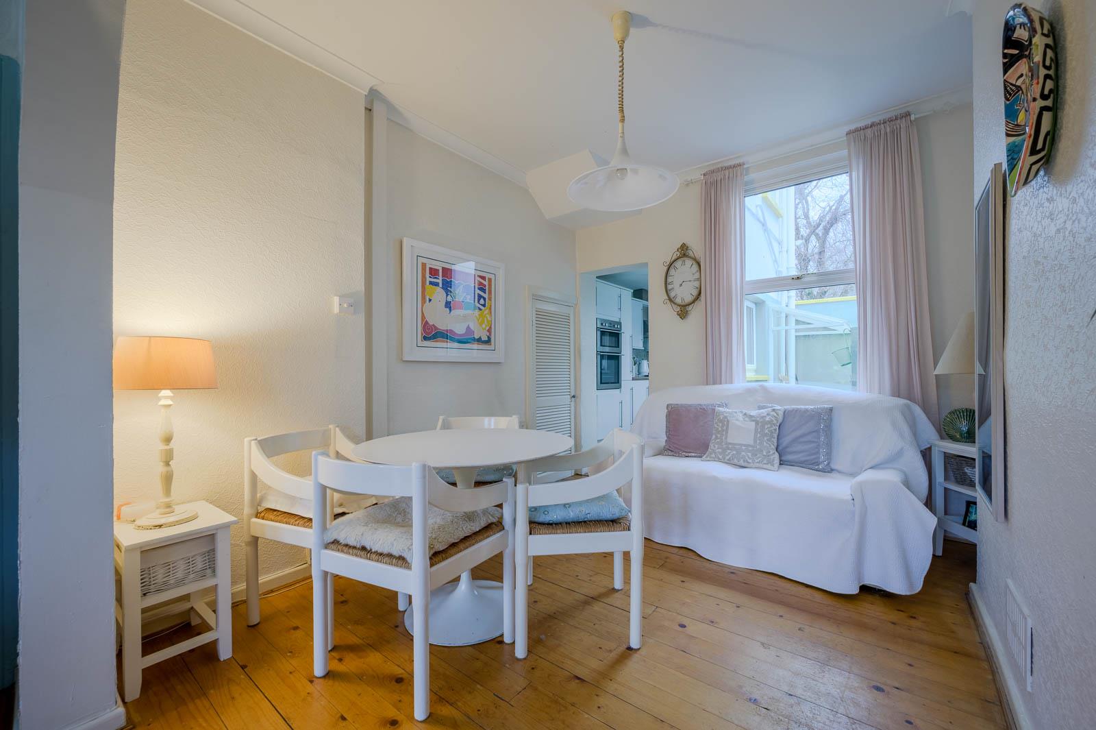 Upon entering, you are greeted by a welcoming hallway leading to a generous open-plan lounge and dining area. The living space boasts elegant period features, high ceilings, and a cozy gas stove, creating a warm and inviting atmosphere. Large bay windows flood the room with natural light, enhancing the sense of space.
