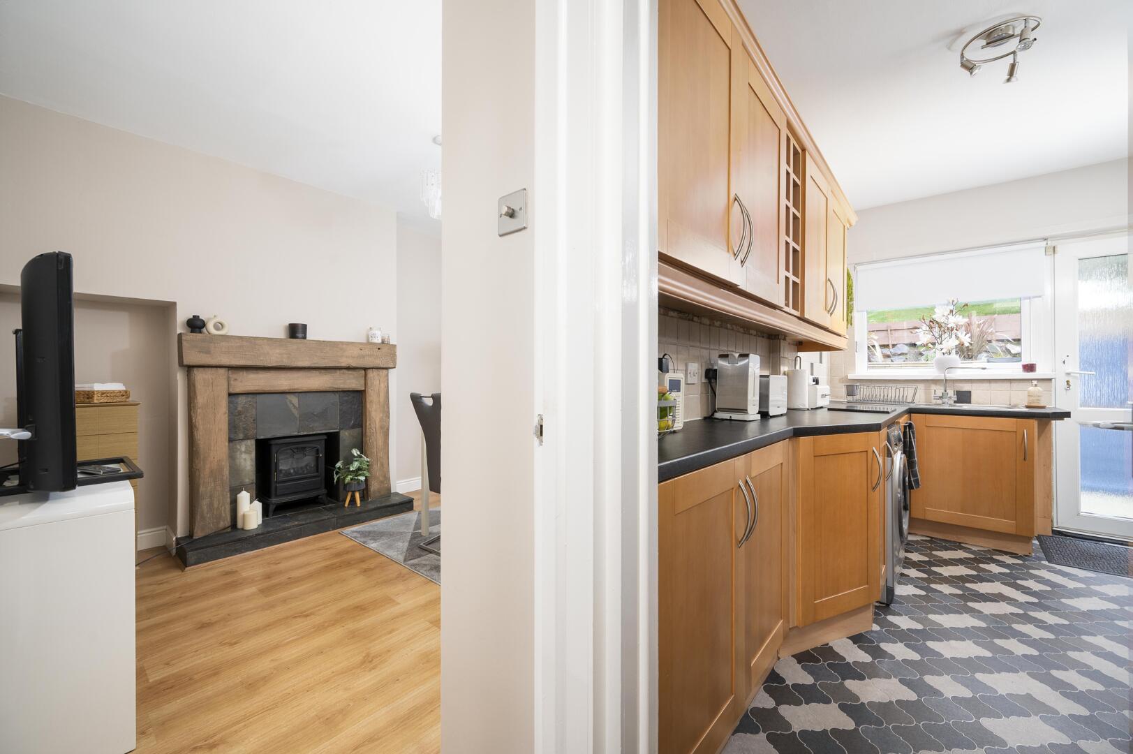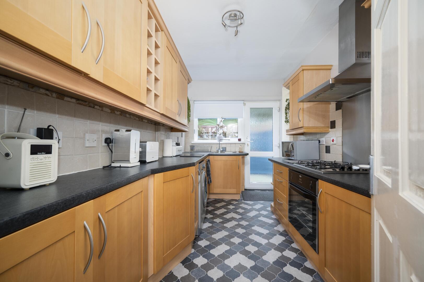 With excellent range of high and low level units, stainless steel fittings, laminate worktop, stainless steel sink and a half with chrome mixer tap, built-in low level oven, four ring stainless steel gas hob, stainless steel extractor hood above and stainless steel splashback, part tiled walls, integrated dishwasher, plumbed for washing machine, space for fridge freezer, vinyl flooring, outlook to rear, modern vertical radiator and uPVC double glazed access door to rear garden.