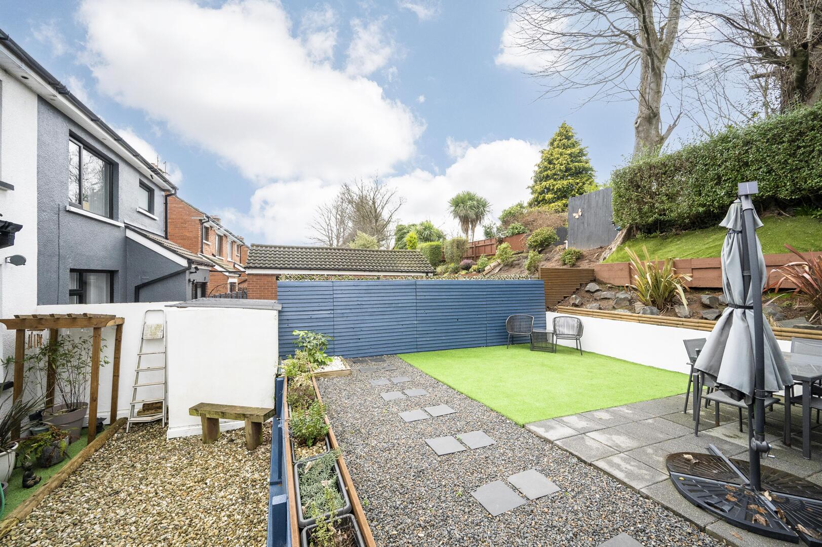 Rear garden, landscaped and tiered, outside tap, outside storage bunker, side access to fully paved driveway, ample off-street parking for two to three cars.