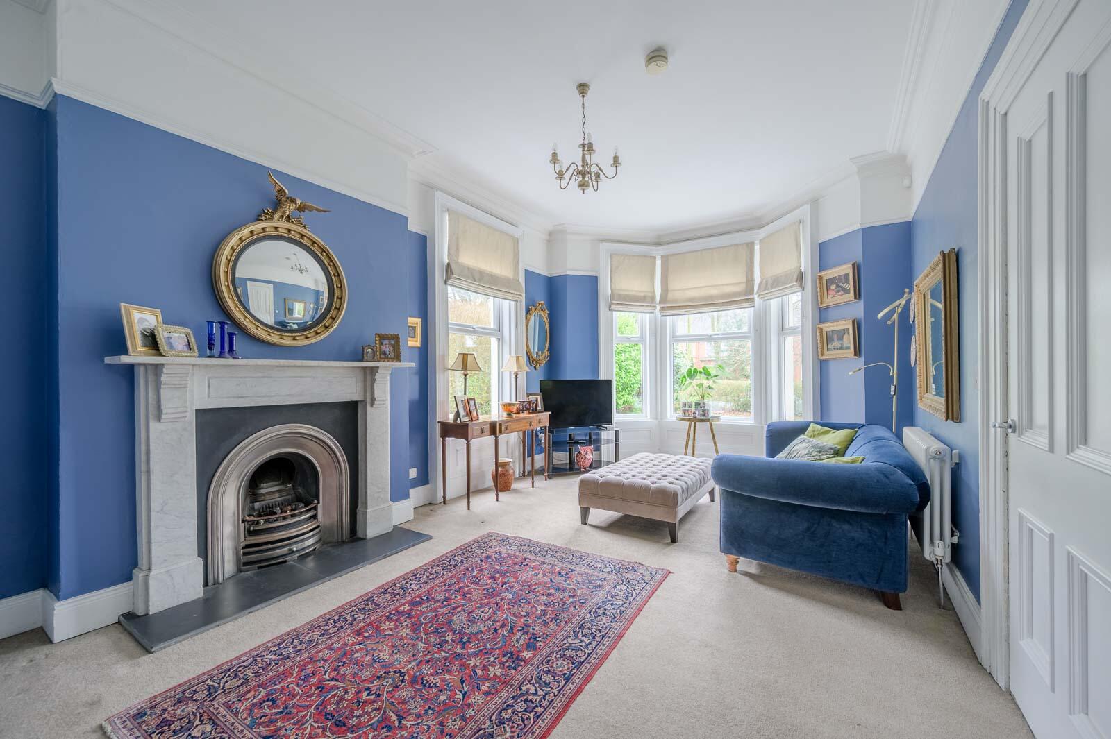 Period white marble fireplace surround, cast iron and polished inset, slate hearth, cornice ceiling, picture rail, measurement into bay window, dual aspect outlook with outlook to side and mature outlook to front gardens and Cyprus Avenue, period style radiators.