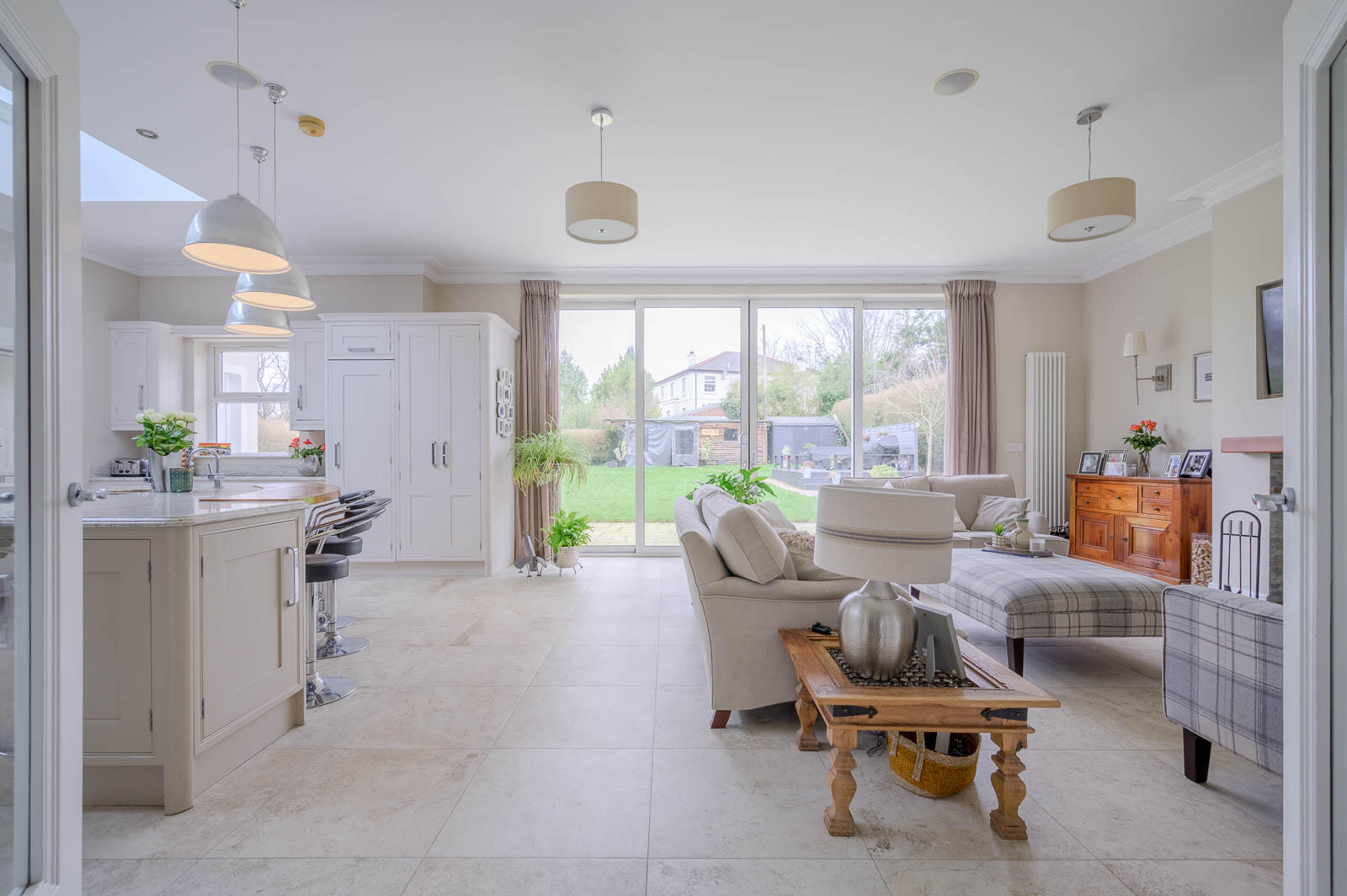 Generous space with cornice ceiling, porcelain travertine tiled flooring throughout, living space with hole in wall fireplace with Worcester slate tiled recess, cast iron wood burning stove on slate hearth, cornice ceiling, period style radiators, sleeper beam mantel, floor to ceiling windows overlooking rear patio and generous rear gardens, sliding patio doors leading to garden, open to kitchen and dining room.