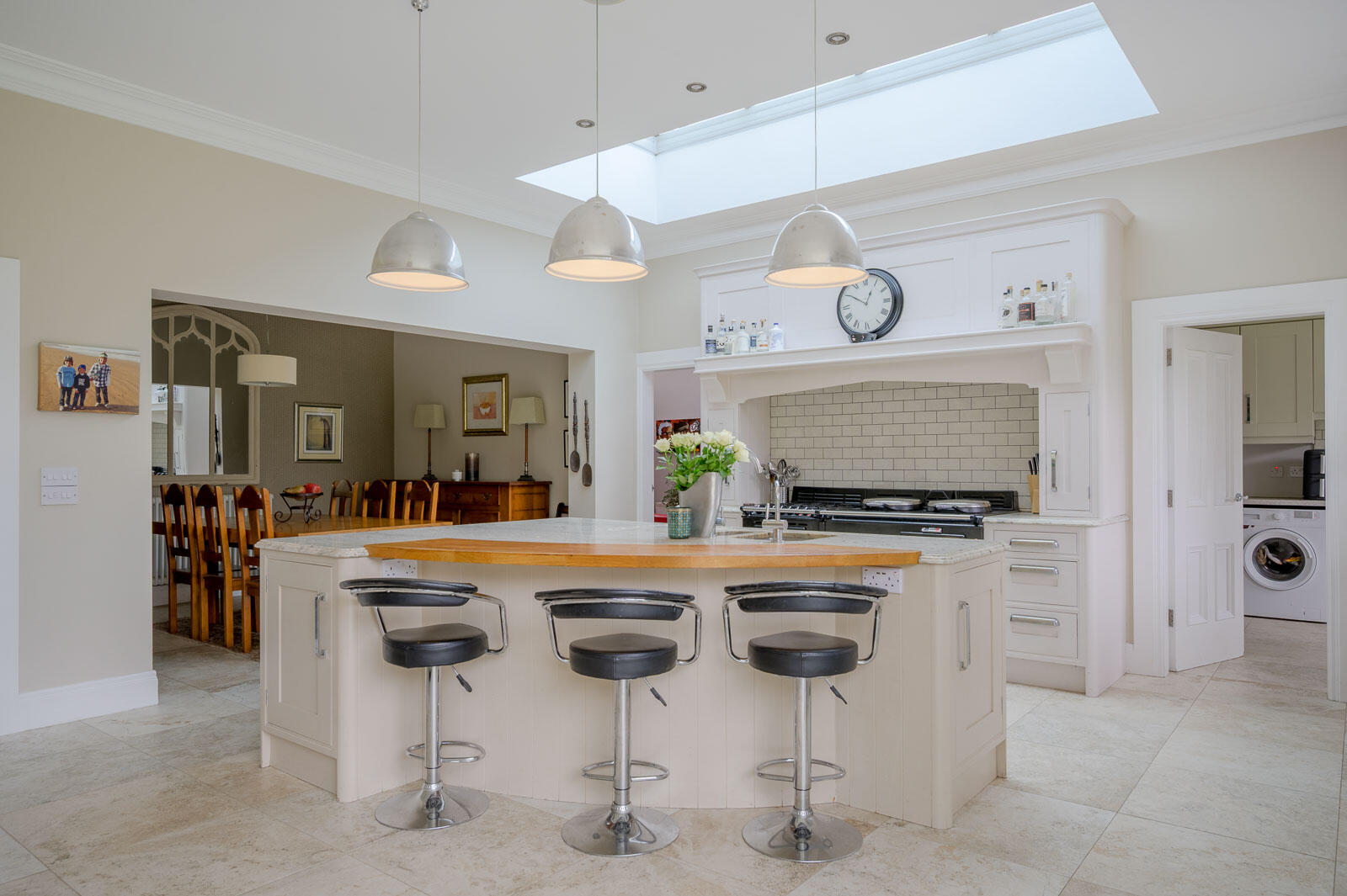 Impressive open-plan kitchen, dining and living space to the rear, designed to maximise natural light with extensive glazing and overhead roof lights.