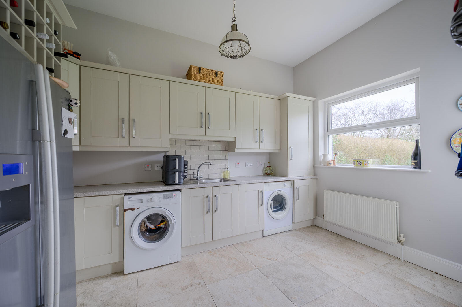 Separate generous utility room with matching range of high and low level units, chrome fittings, laminate granite effect work surface, single drainer stainless steel sink unit, chrome mixer taps, plumbed for washing machine, space for dryer, concealed Baxi gas fired boiler, housing and plumbing for American style ice making fridge freezer, built-in wine rack above, additional built-in storage cupboards, continued travertine/porcelain tiled flooring, outlook to rear garden and uPVC double glazed access door to rear patio and garden.