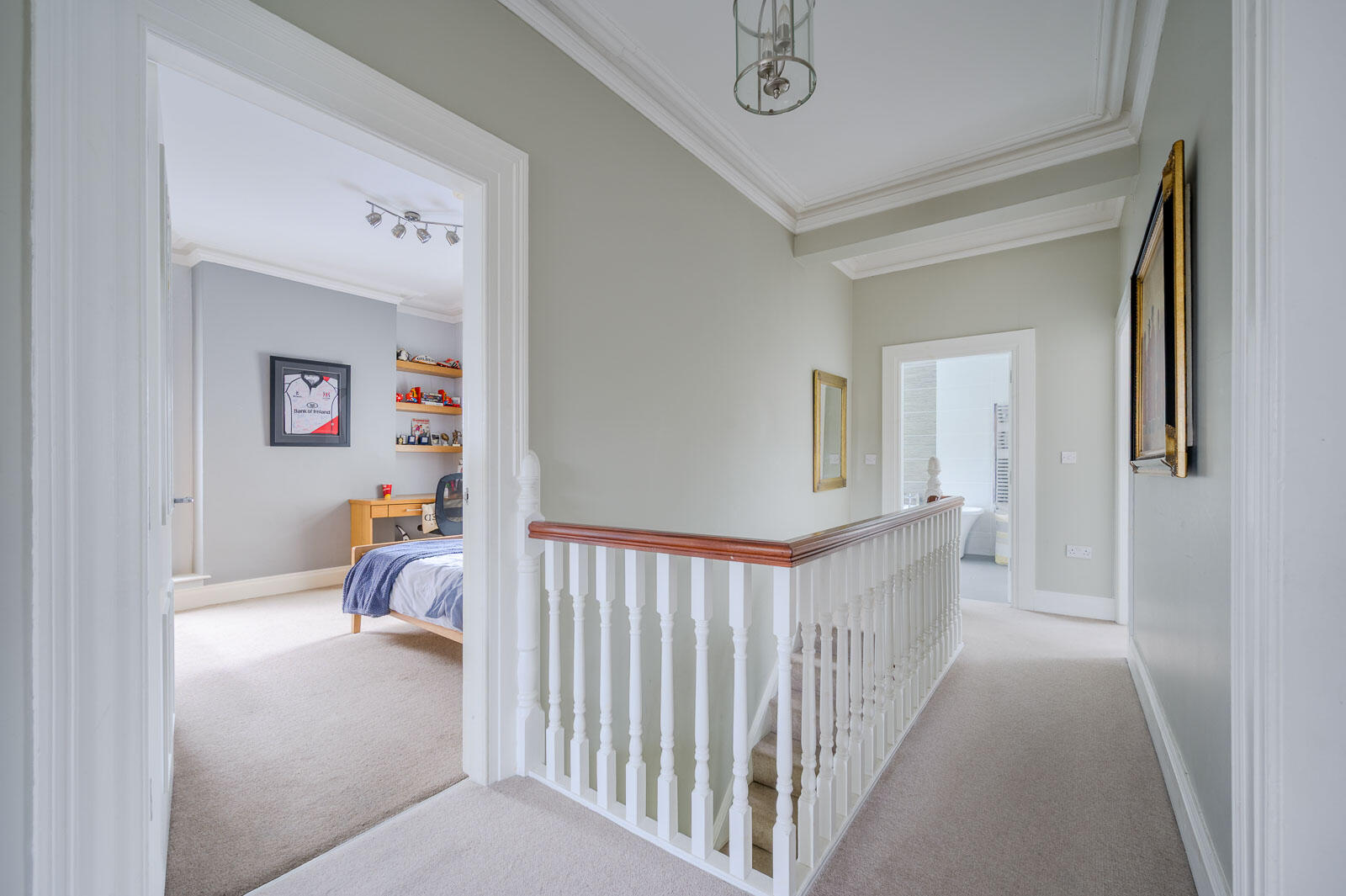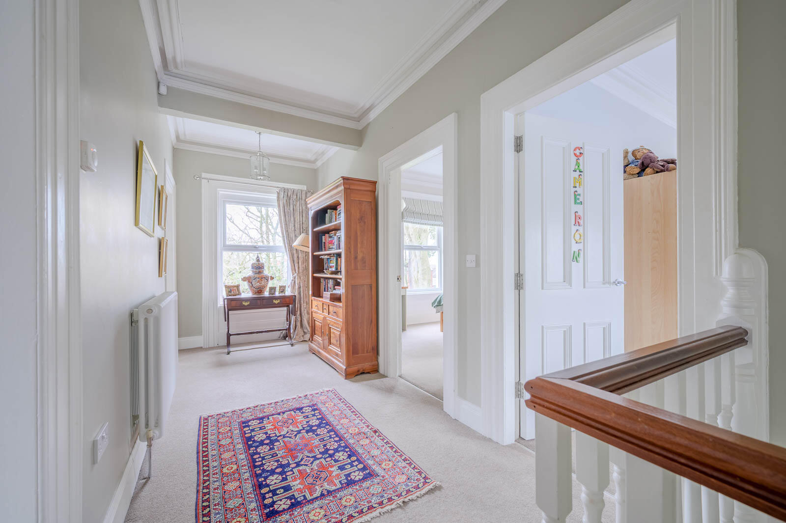 Generous spacious first floor landing with mature outlook to front gardens and Cyprus Avenue, cornice ceiling.