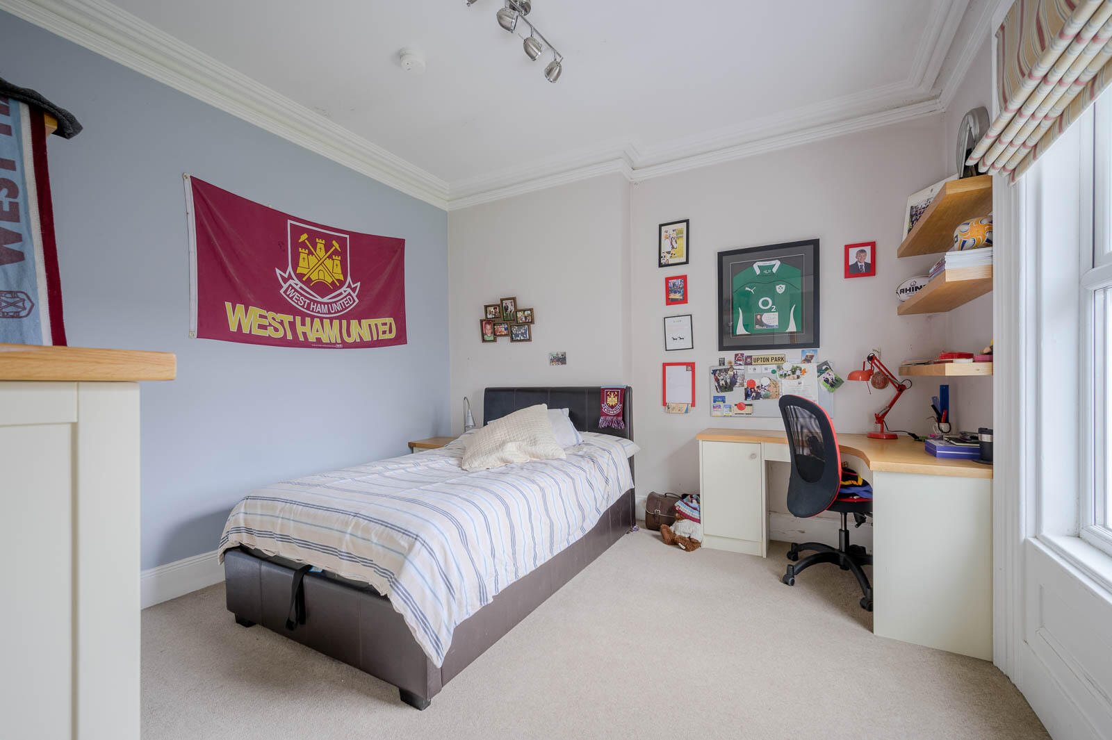 Cornice ceiling, mature outlook to front gardens and Cyprus Avenue, corner built-in study desk with hardwood worktop, drawer unit and cabinet, floating shelving.