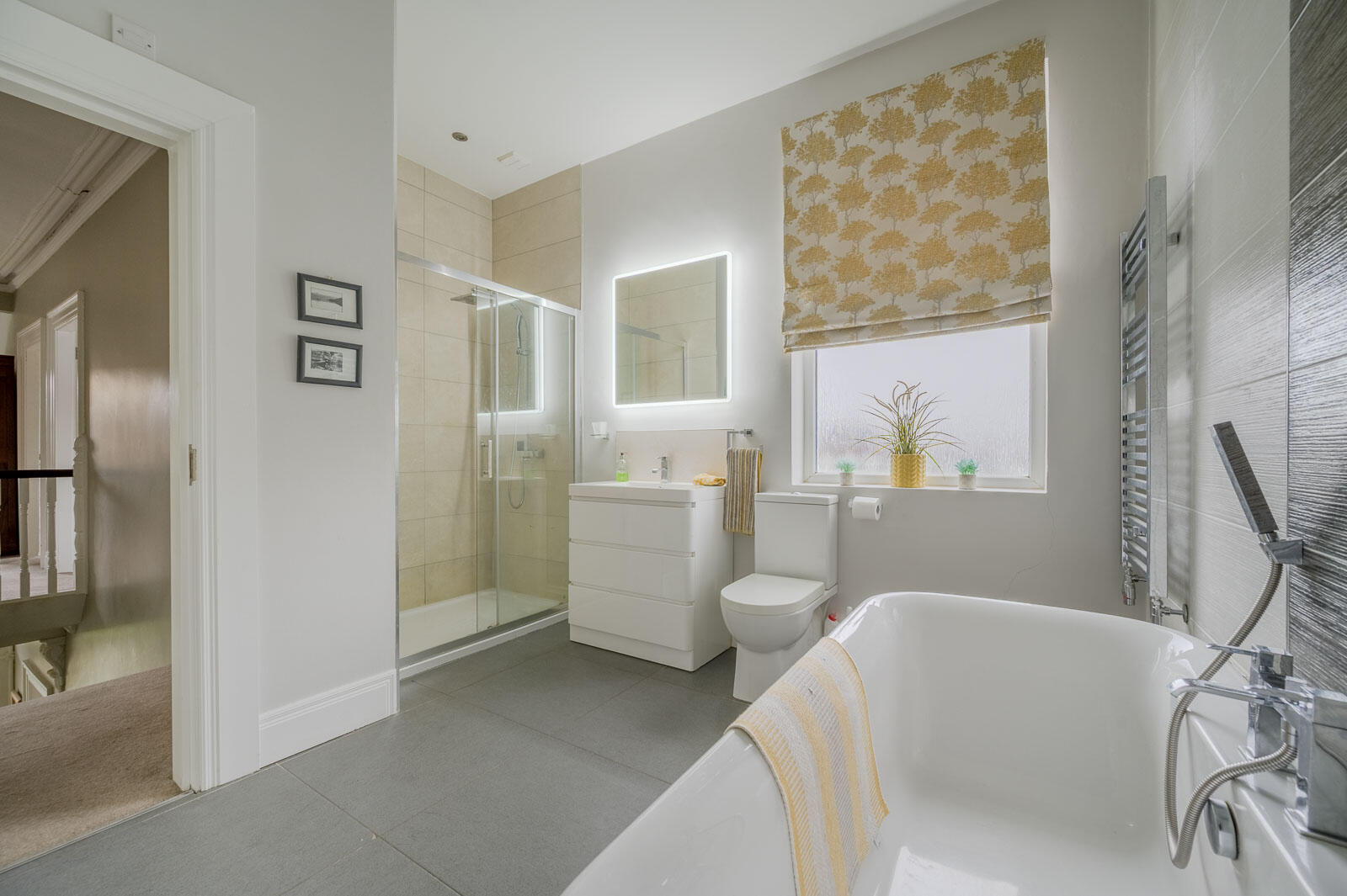Luxurious contemporary white bathroom suite comprising low flush WC, vanity unit, chrome mixer taps, porcelain tiled splashback, drawer units below, illuminated mirror above, free standing roll top bath with chrome mixer taps and telephone hand shower, chrome heated towel rails x two, fully tiled splashback, built-in glazed fully tiled shower enclosure with chrome thermostatically controlled shower unit, overhead drencher and shower attachment, porcelain tiled flooring.