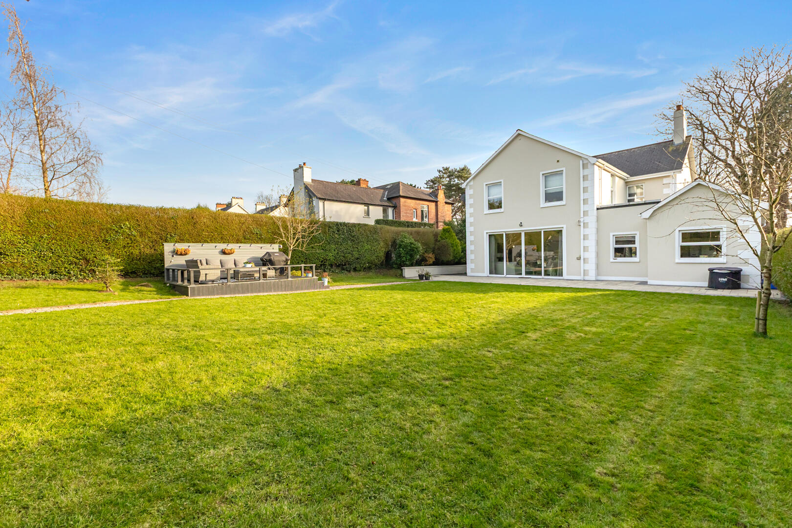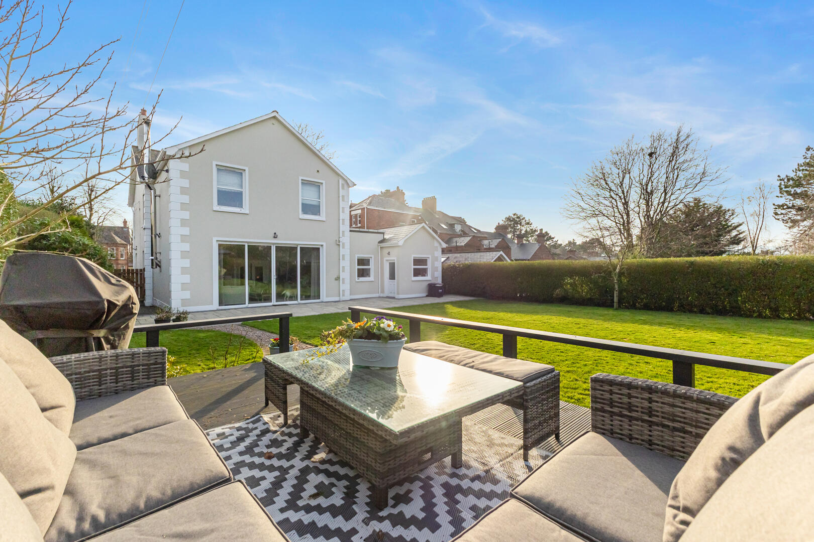 Beautiful landscaped gardens offering exceptional privacy, featuring a large terrace, multiple seating areas, immaculate lawns and mature hedging.