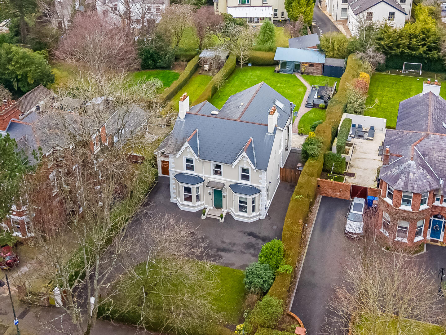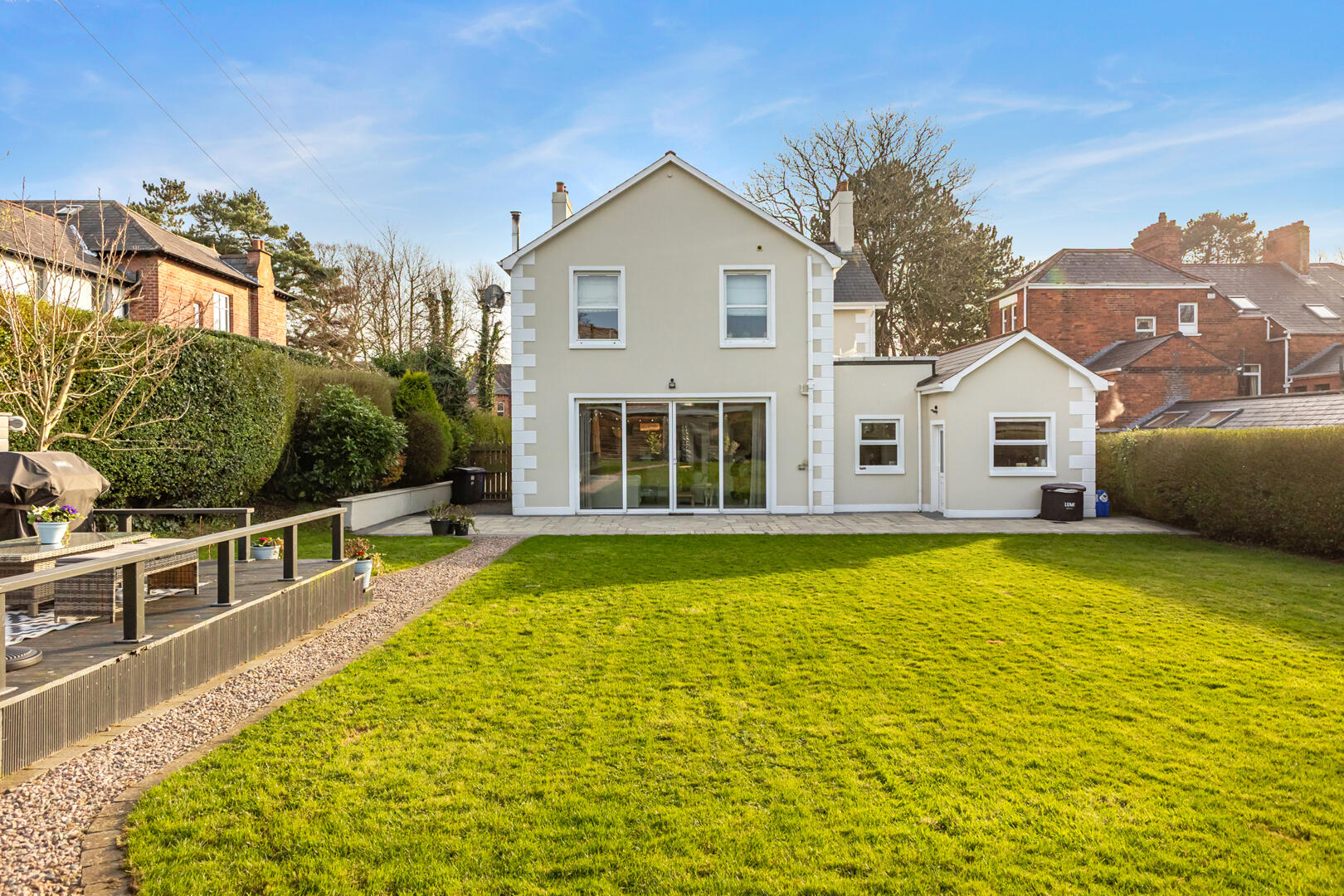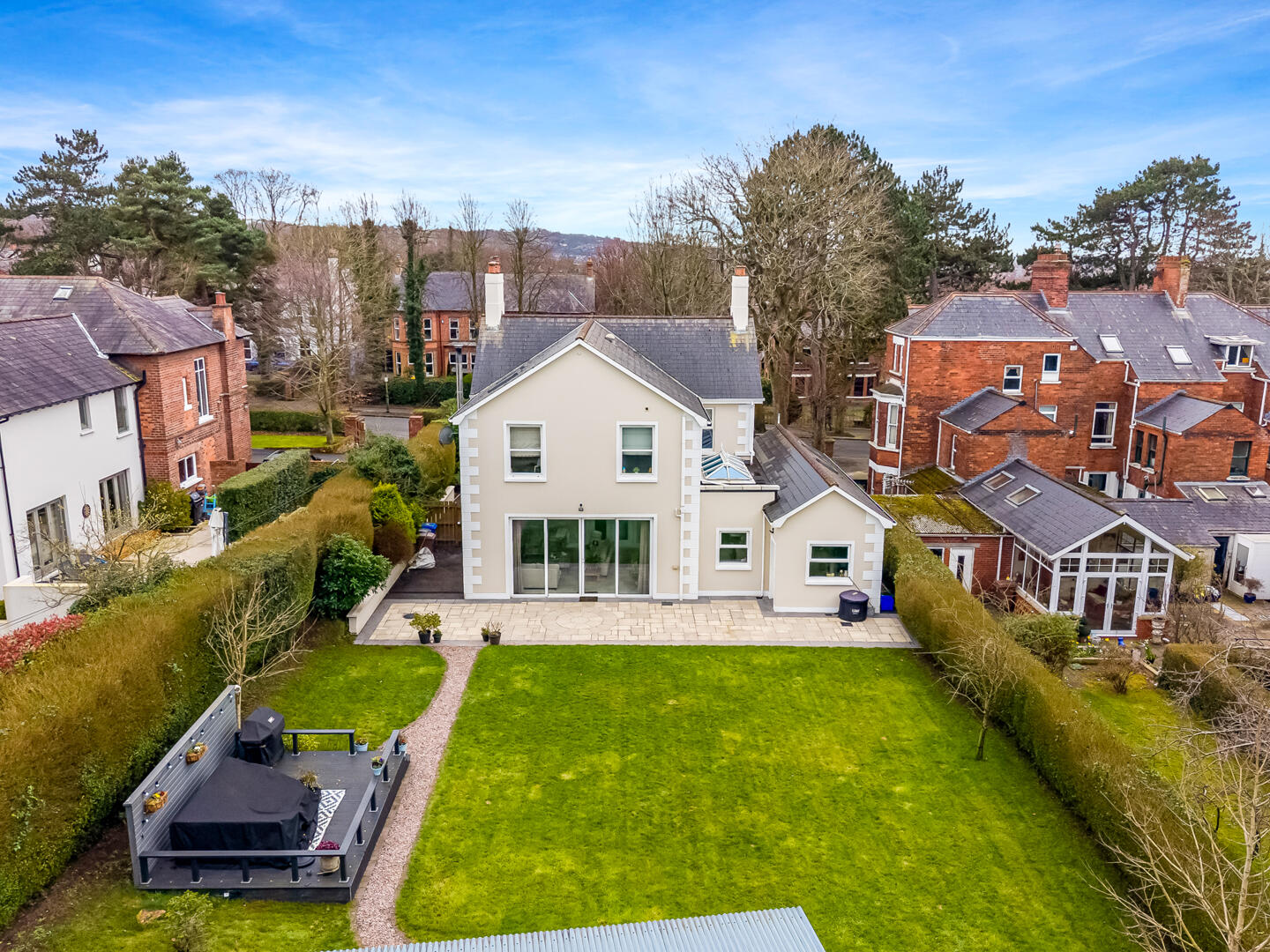 The property has beautifully landscaped gardens offering excellent privacy. A large terrace and multiple seating areas provide spaces for entertaining and relaxation, complemented by well-kept lawns and mature hedging. With excellent kerb appeal and generous parking, this remarkable home offers rare quality along one of Belfast´s most sought-after avenues.