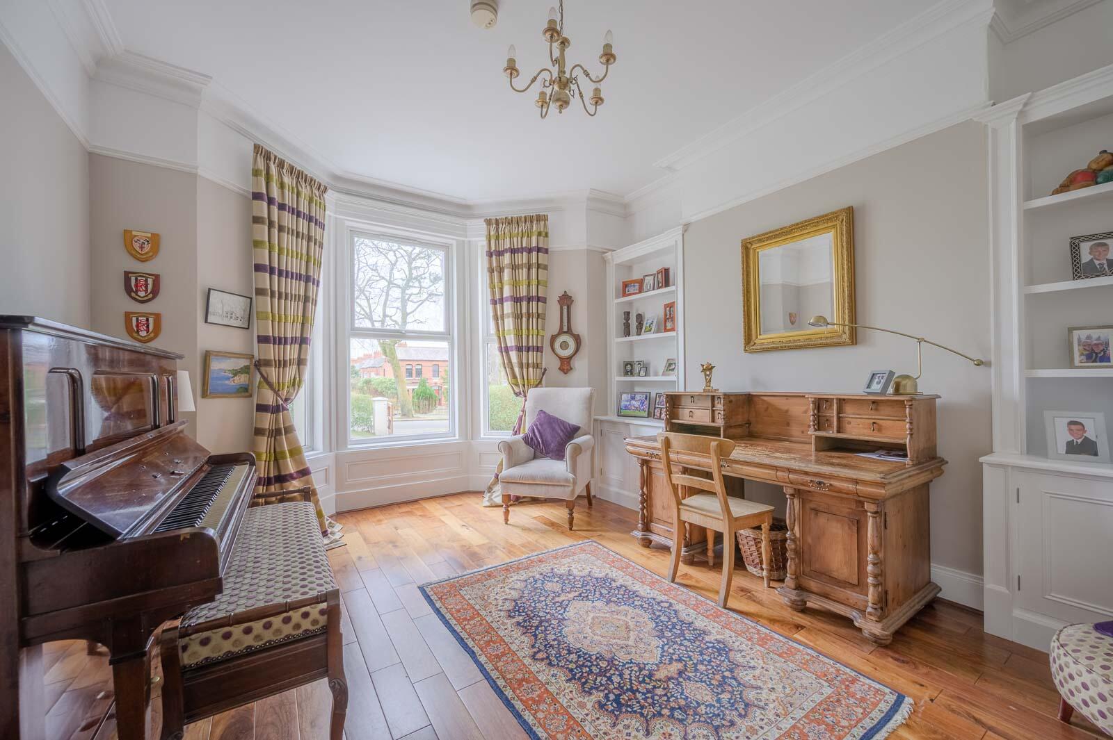 Cornice ceiling, dual aspect windows, mature outlook to side towards Belfast Port and the Antrim Hills, outlook to rear, oak built-in study desk and floating shelves.