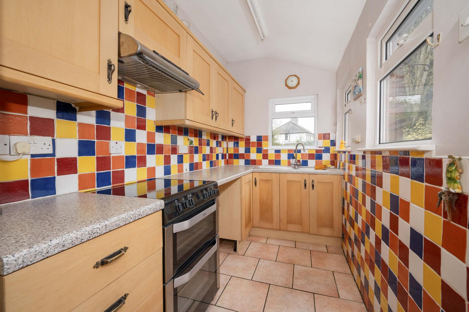 With excellent range of high and low level units, worktops, stainless steel sink and chrome mixer tap, space for cooker, extractor hood above, part tiled walls, plumbed for washing machine, space for fridge freezer, space for dryer, additional storage space, ceramic tiled floor, wood effect uPVC double glazed access door to rear garden, dual aspect windows.