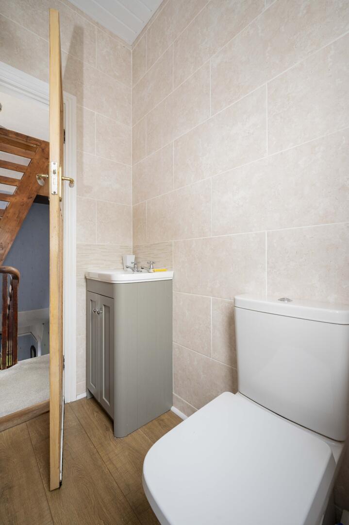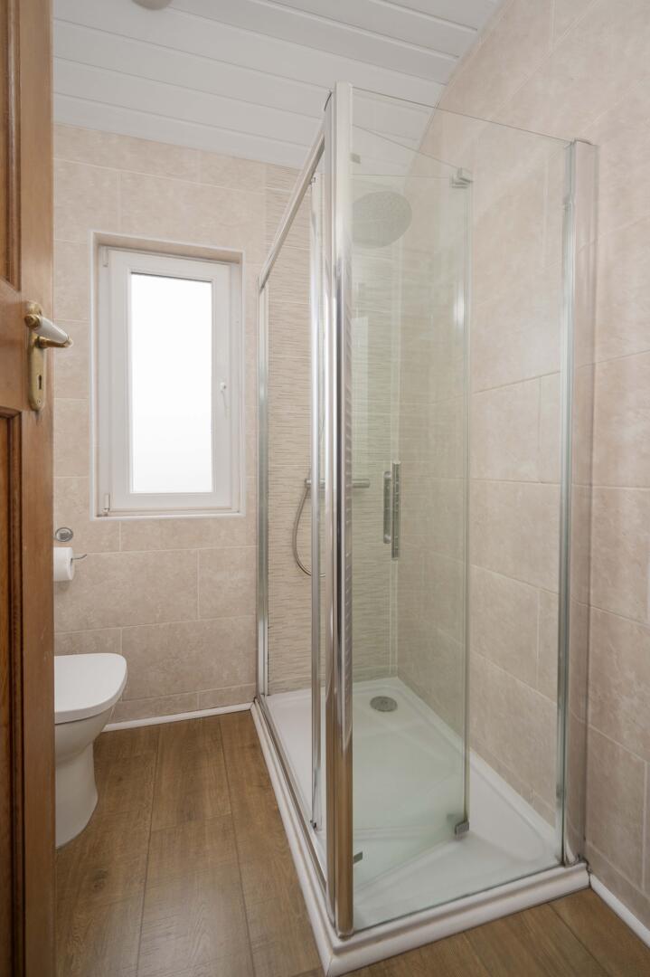 Modern white suite comprising low flush WC with push button, vanity unit with chrome taps, fully PVC panelled shower cubicle with thermostatically controlled valve, telephone handle unit and overhead shower, fully PVC panelled walls, tongue and groove ceiling, low voltage recessed spotlighting, chrome heated towel rail, frosted glass window.