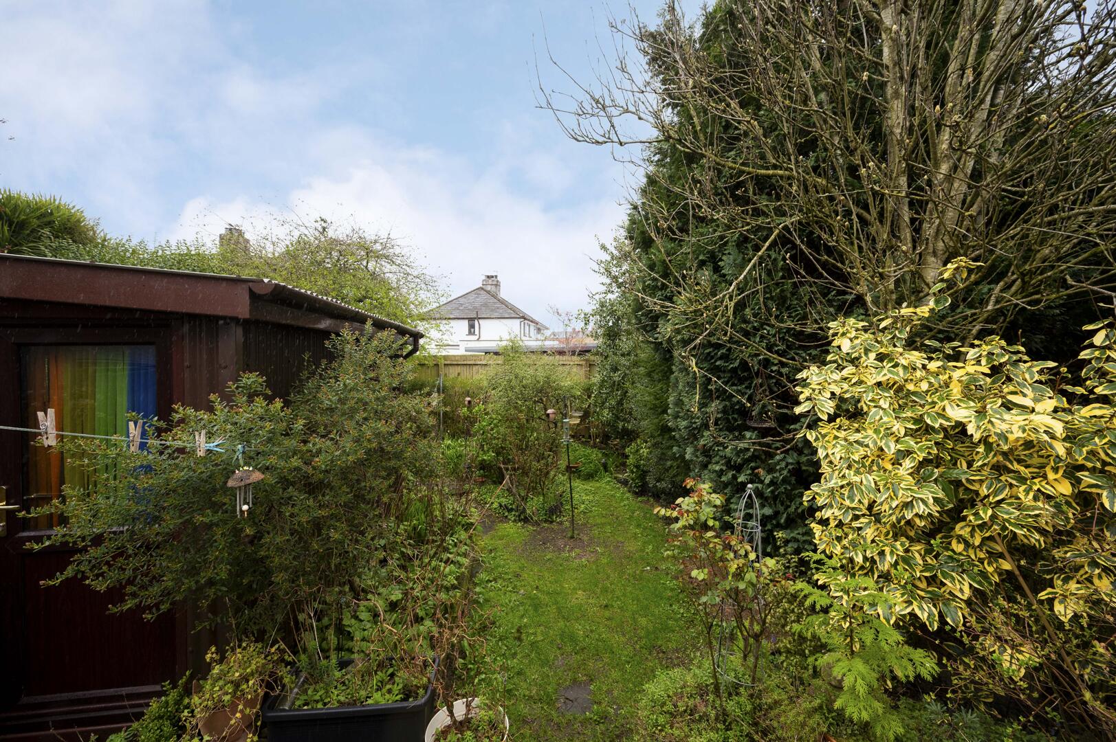 Fully paved driveway to front, ample off-street parking for one to two cars, front garden with various plants and shrubs, rear garden part paved and part paved in lawns, mature outlook, various trees, shrubs and plants, garden pod with power.