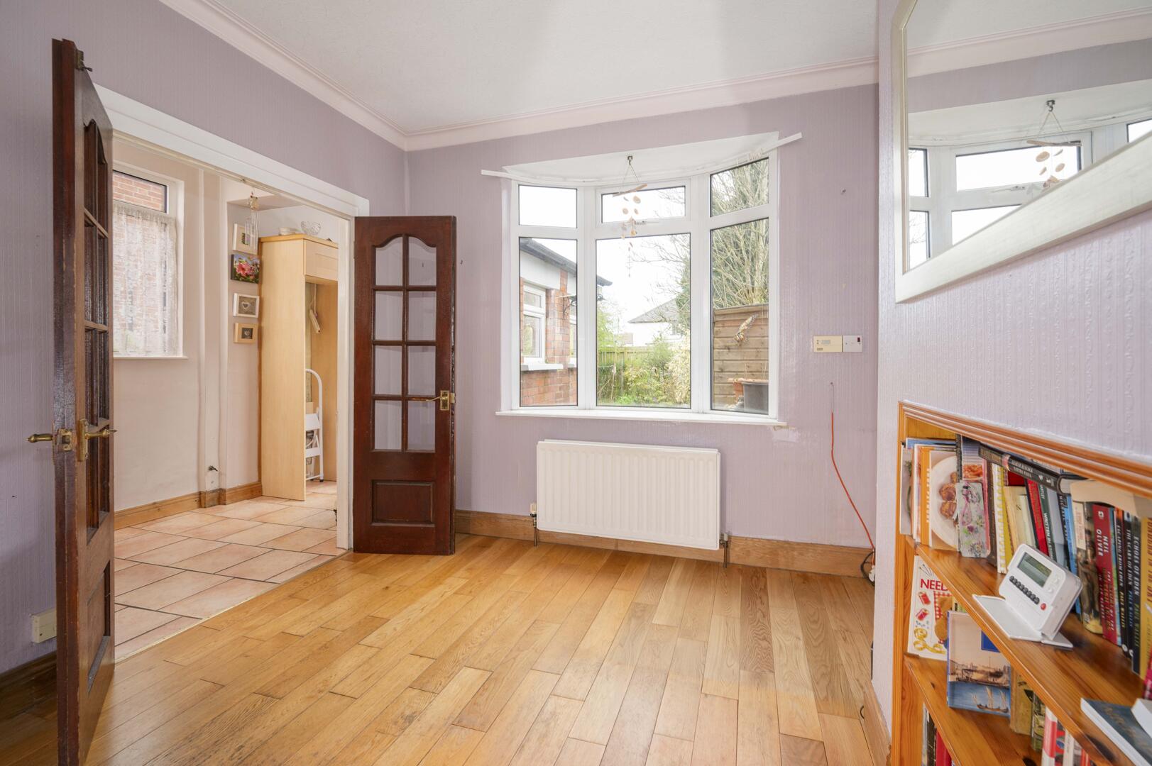 Dual aspect, measurement into bay window, original stained glass windows, oak wooden floor, wooden fireplace with tiled inset and hearth, cornice ceiling.