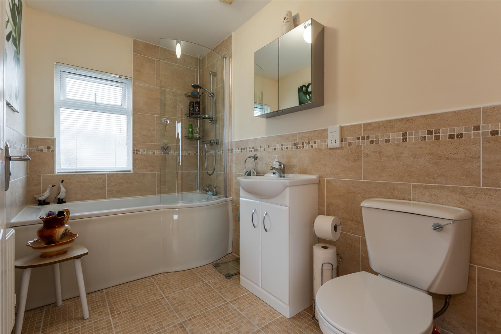 White suite comprising, panelled bath with mixer tap, wall mounted overhead shower, glass shower screen, low flush w/c, pedestal wash hand basin with mixer tap, partially tiled walls, tiled flooring and extractor fan.