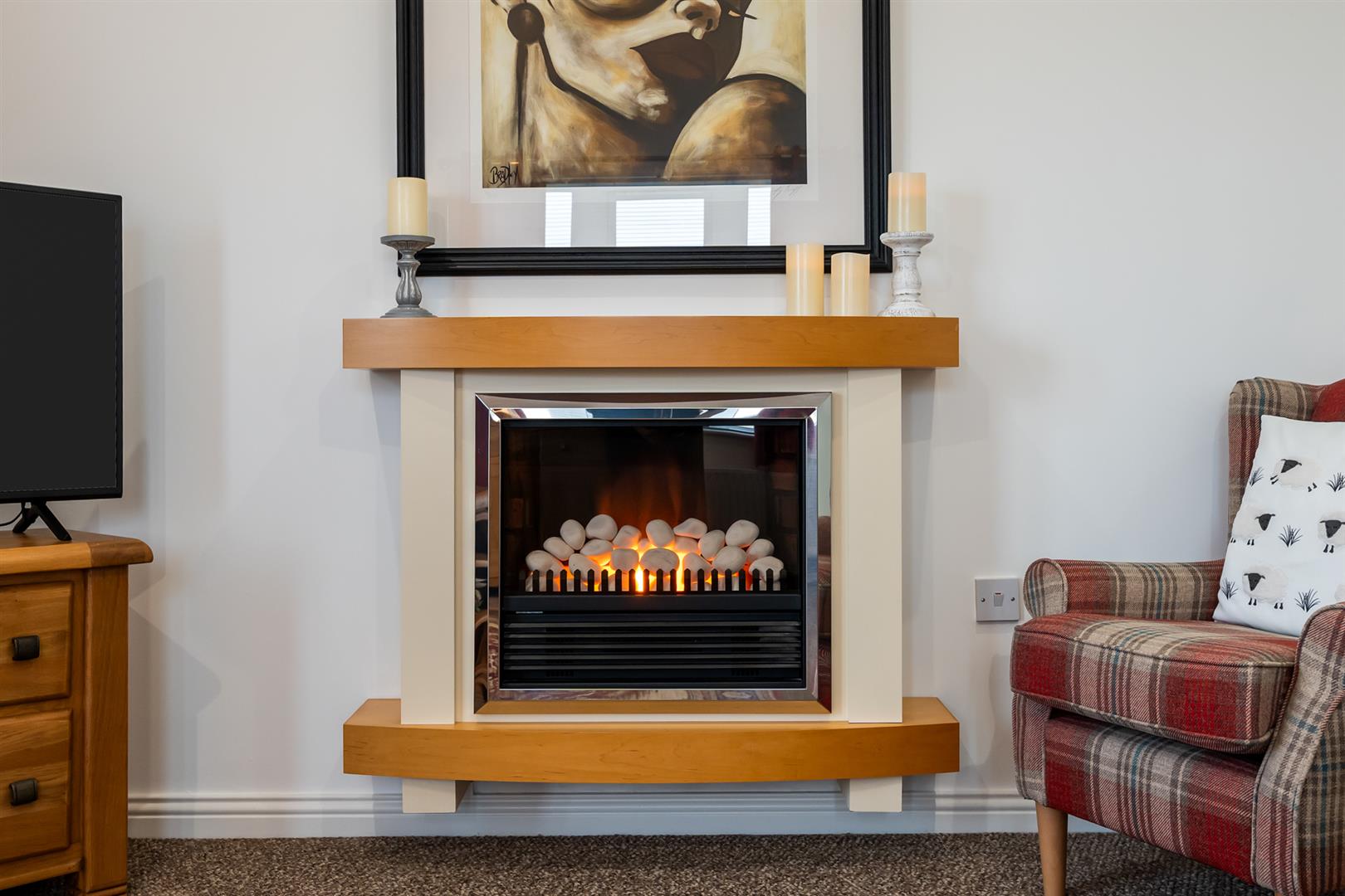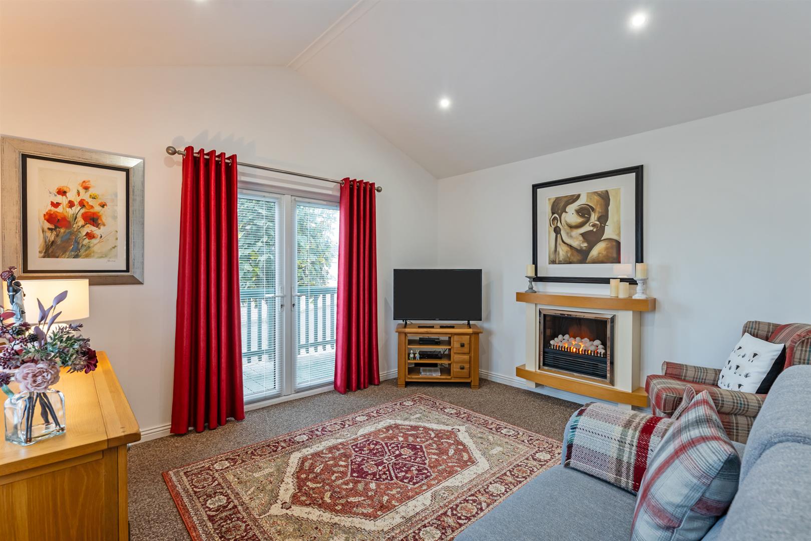 Electric fireplace, recessed spotlights, double doors onto decked area.