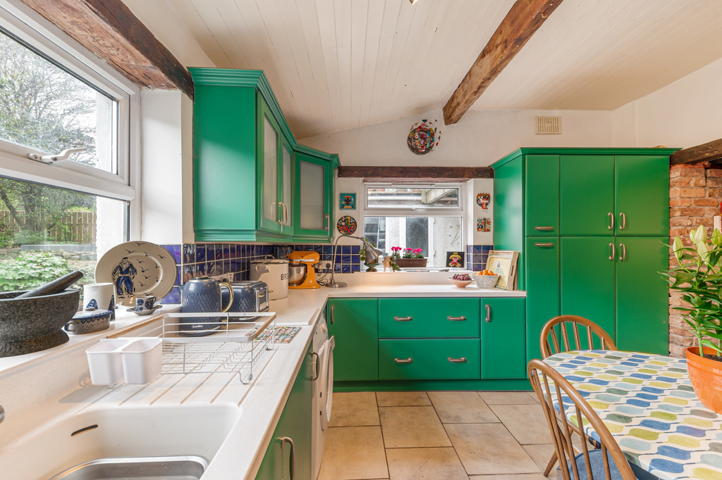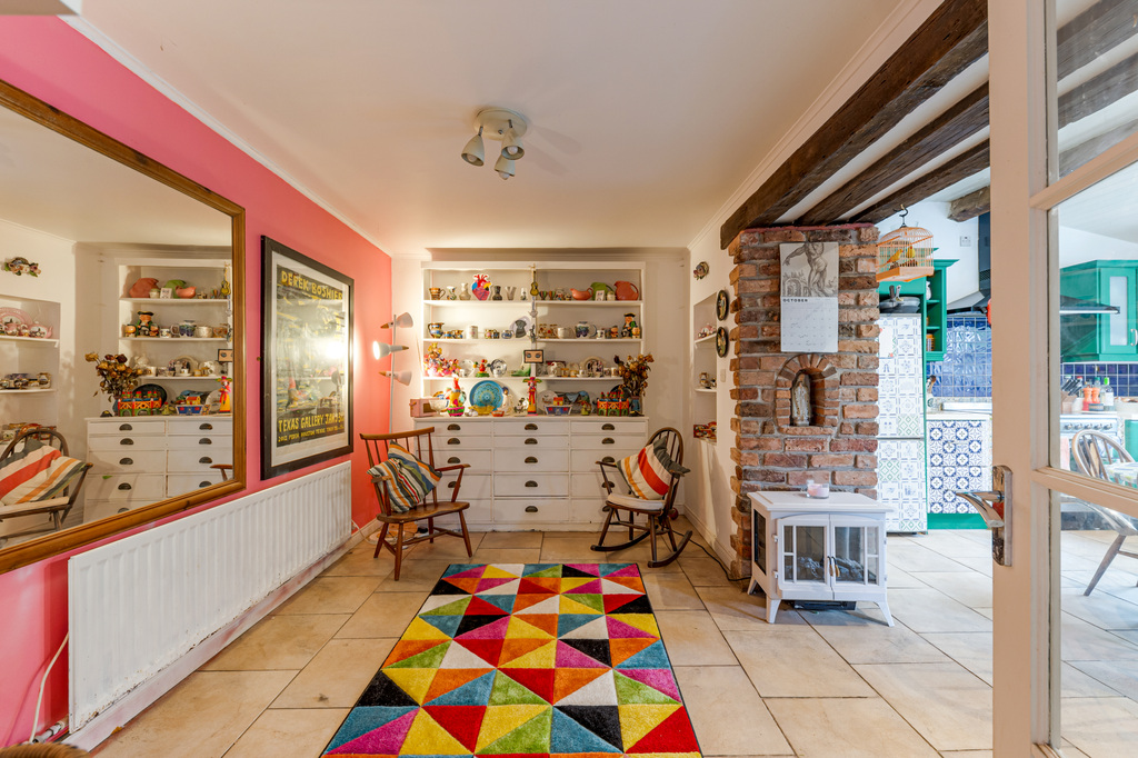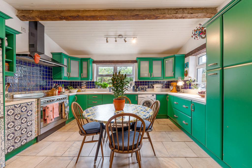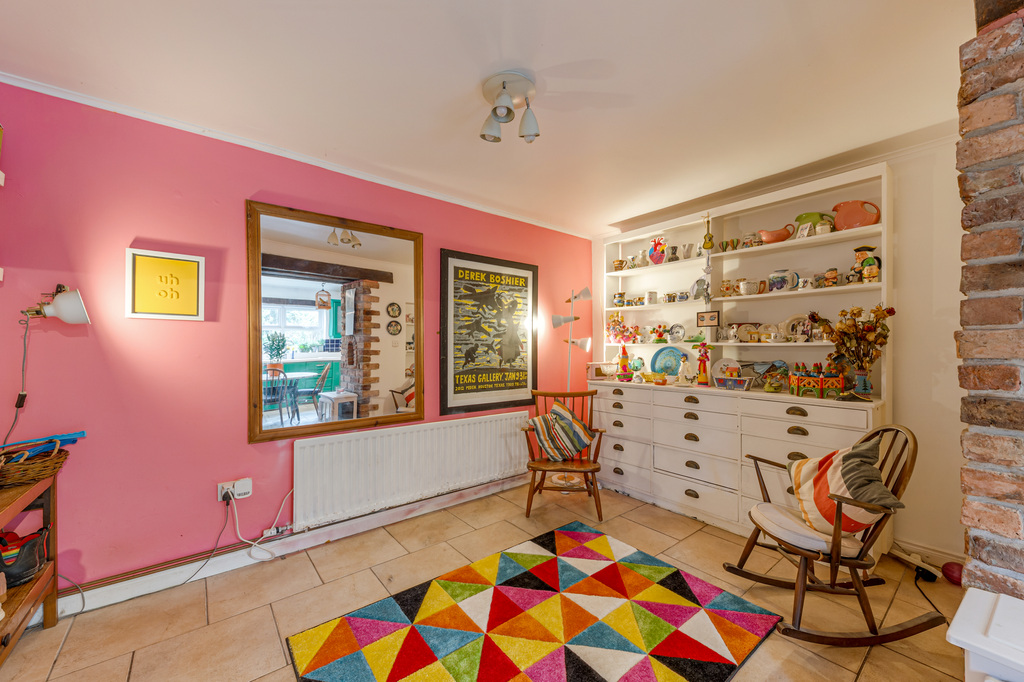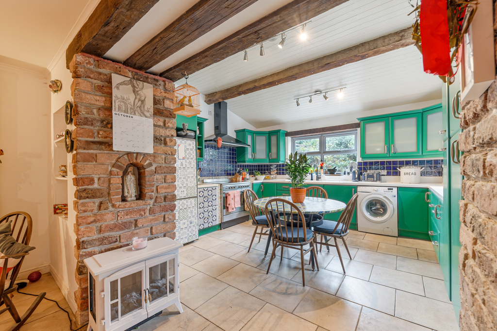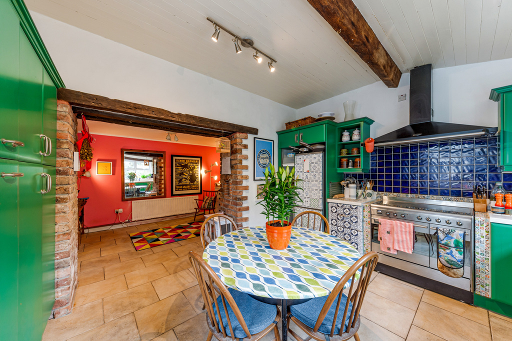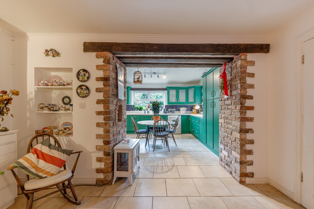 Charming Open Plan Kitchen with Garden Views and Casual Dining Area Leading to Snug