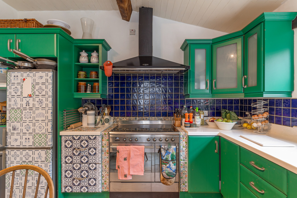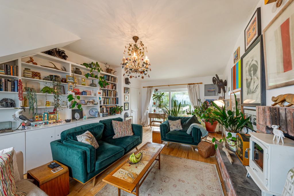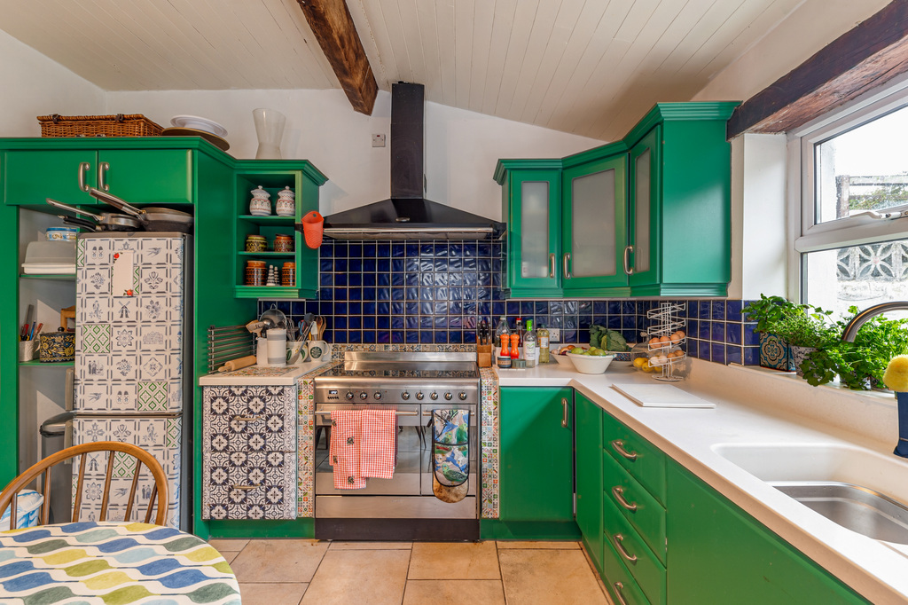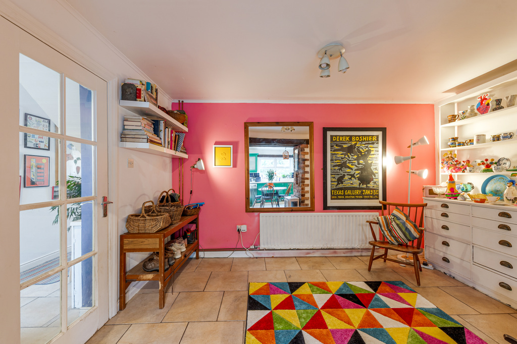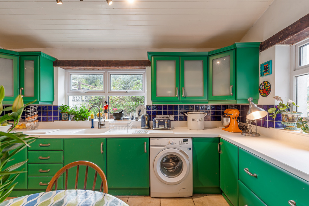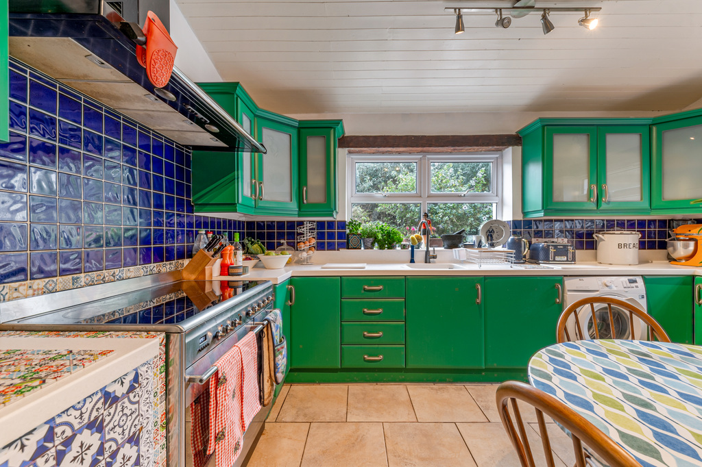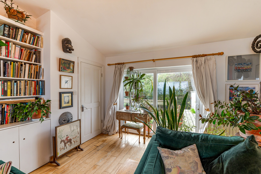 Charming Open Plan Kitchen with Garden Views and Casual Dining Area Leading to Snug