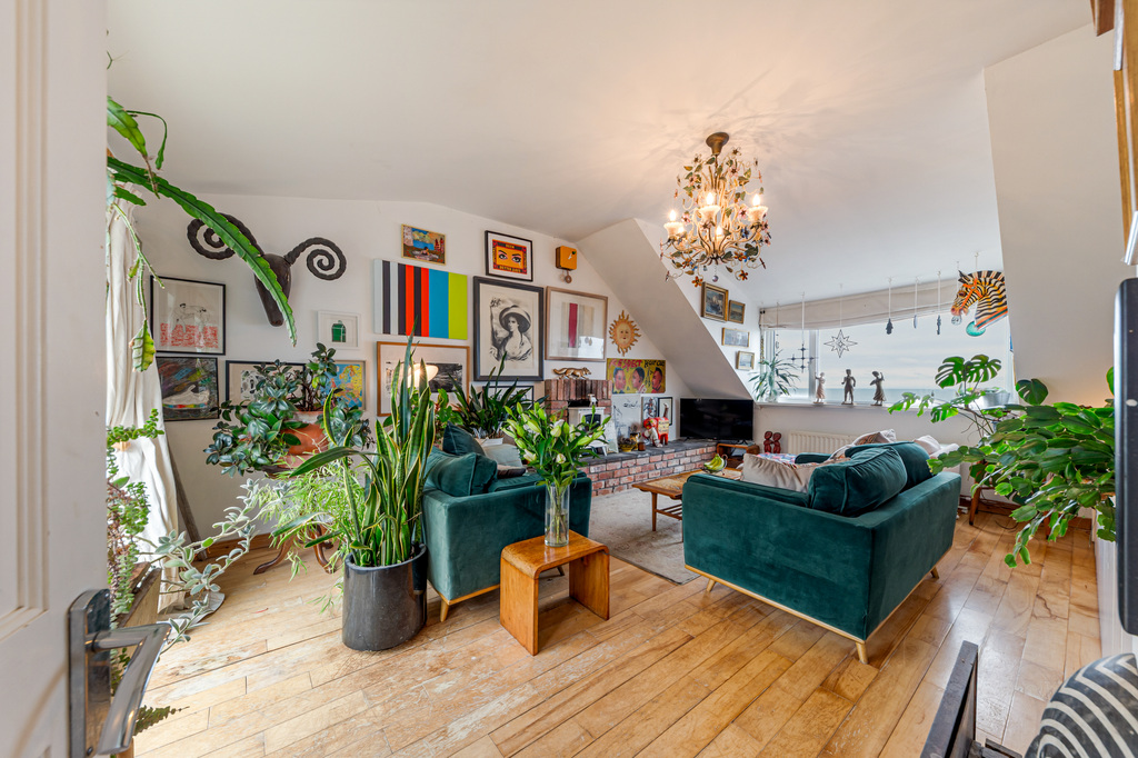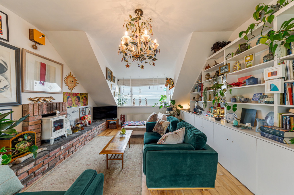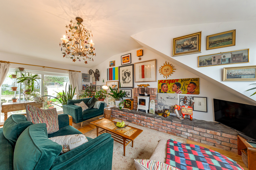 Extensive First Floor Dual Aspect Lounge with Stunning Sea Views to the Front, Inglenook Fireplace with Wood Burning Stove and Double Doors to Raised Decked Sun Terrace Overlooking Rear Gardens