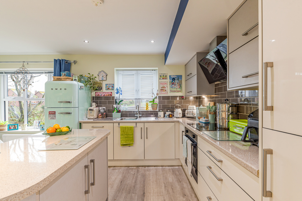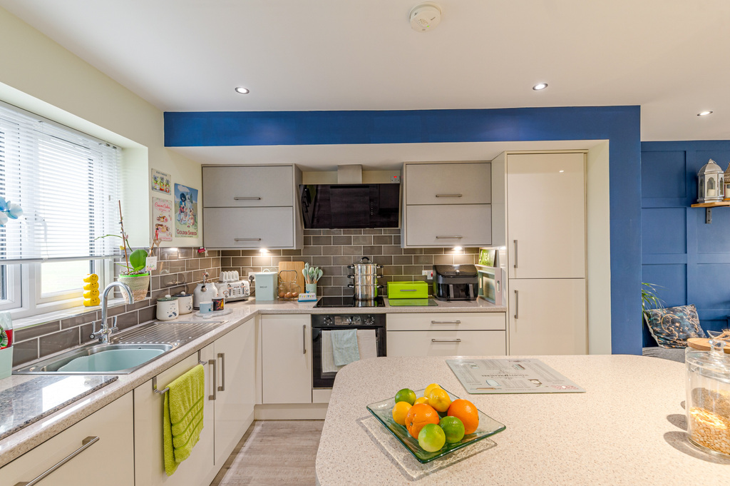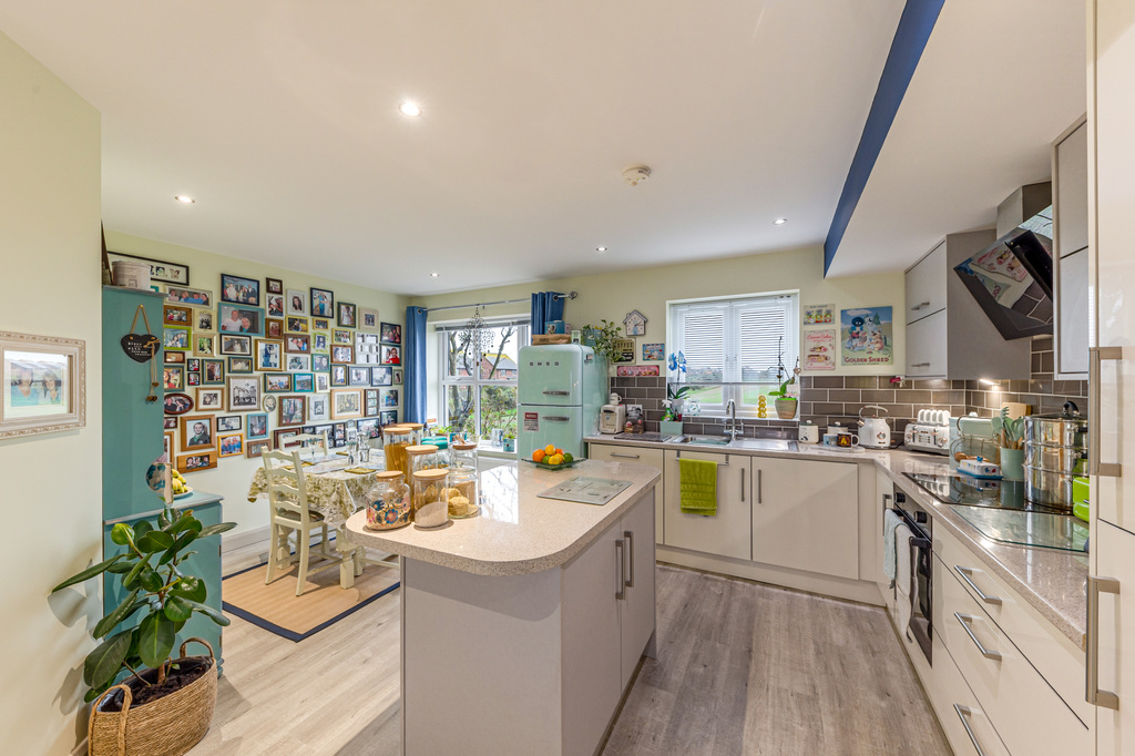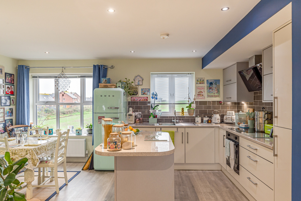 Open Plan Modern Fitted Kitchen with Built in Appliances, Centre Island, Dining Area and Countryside Views