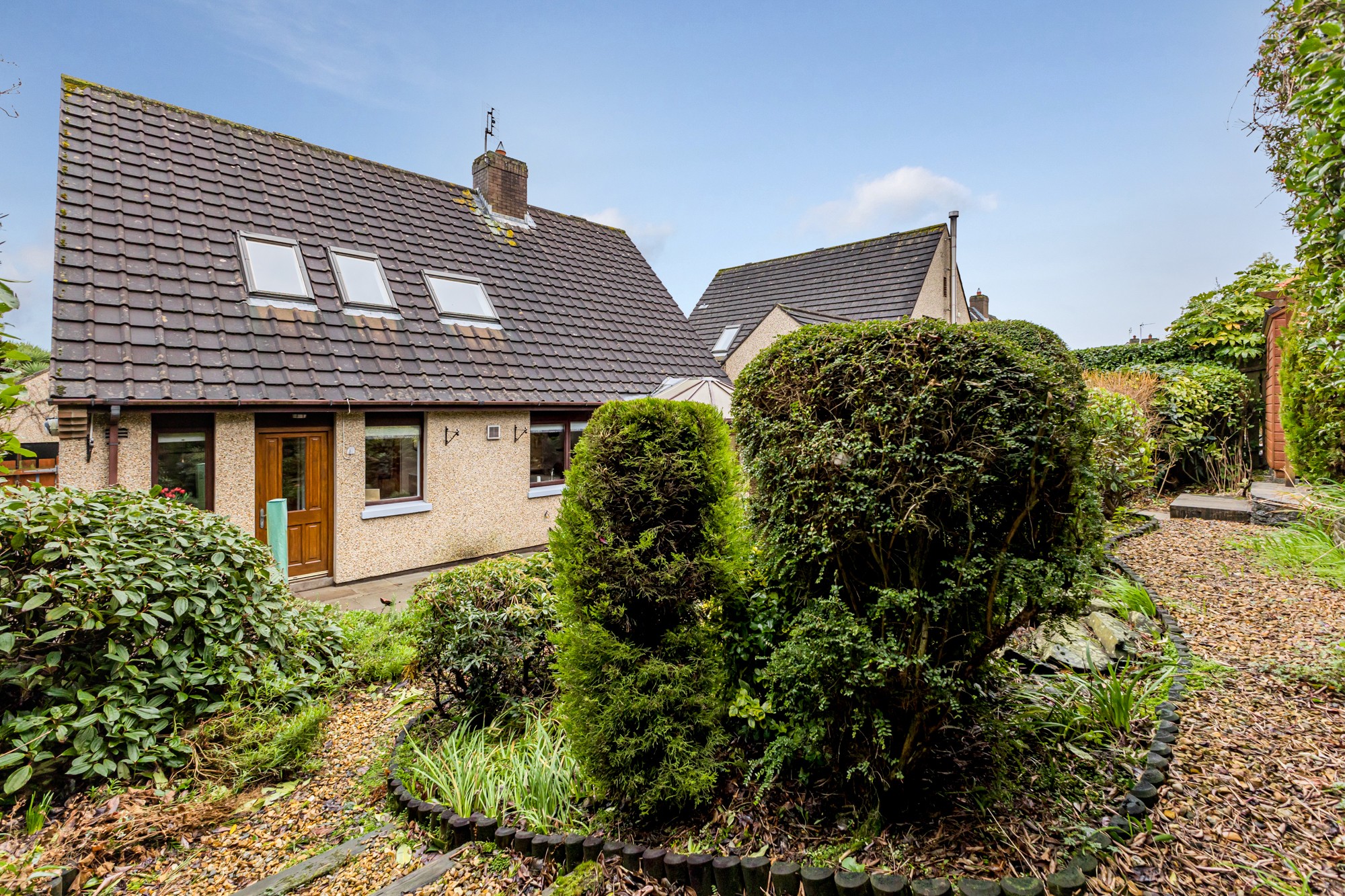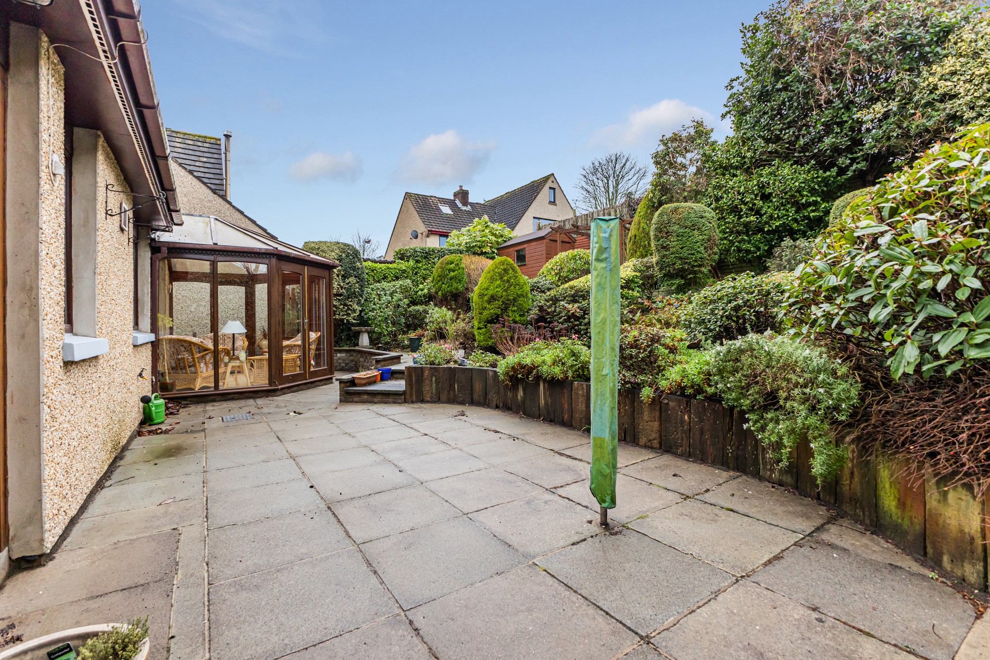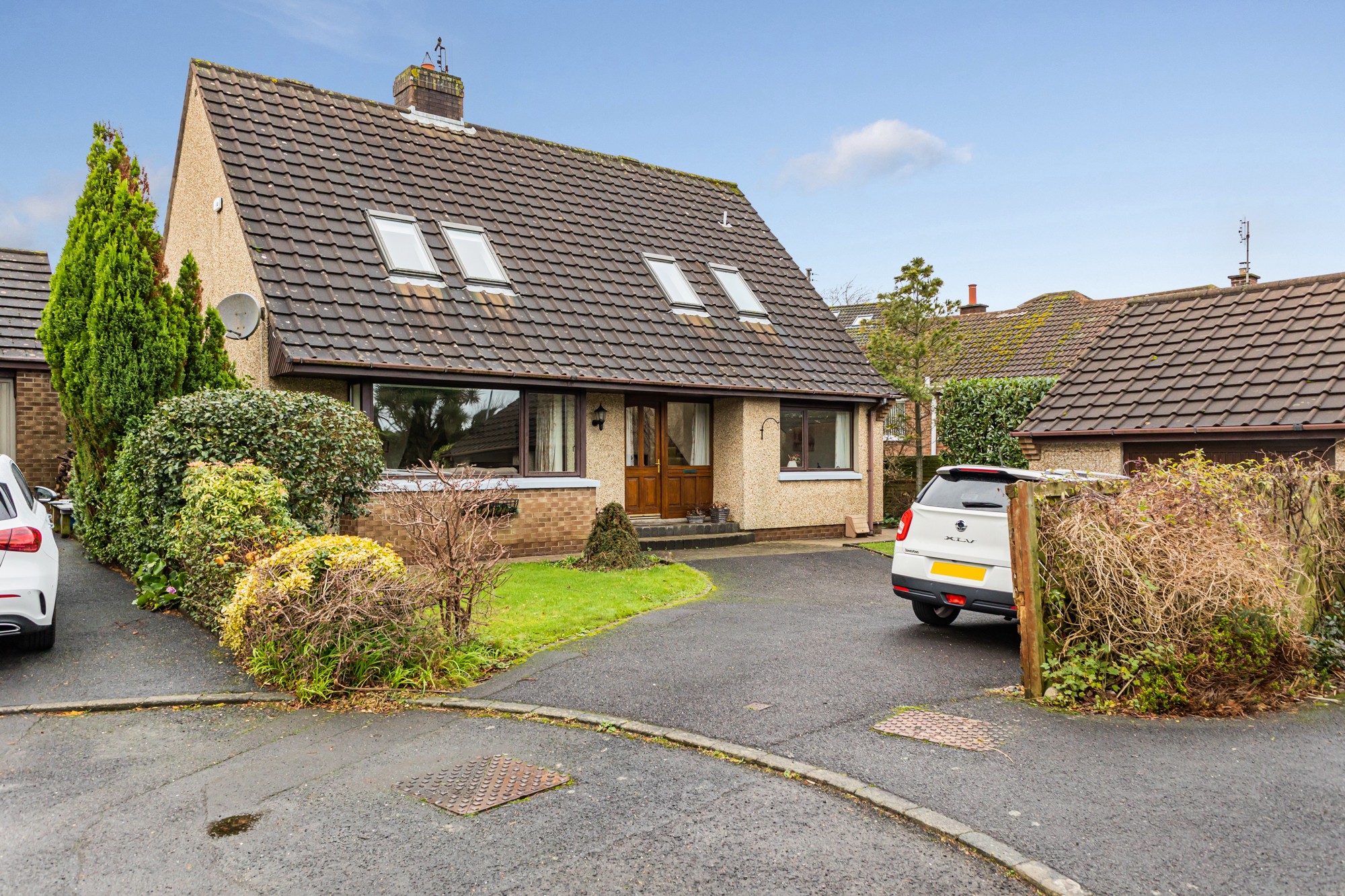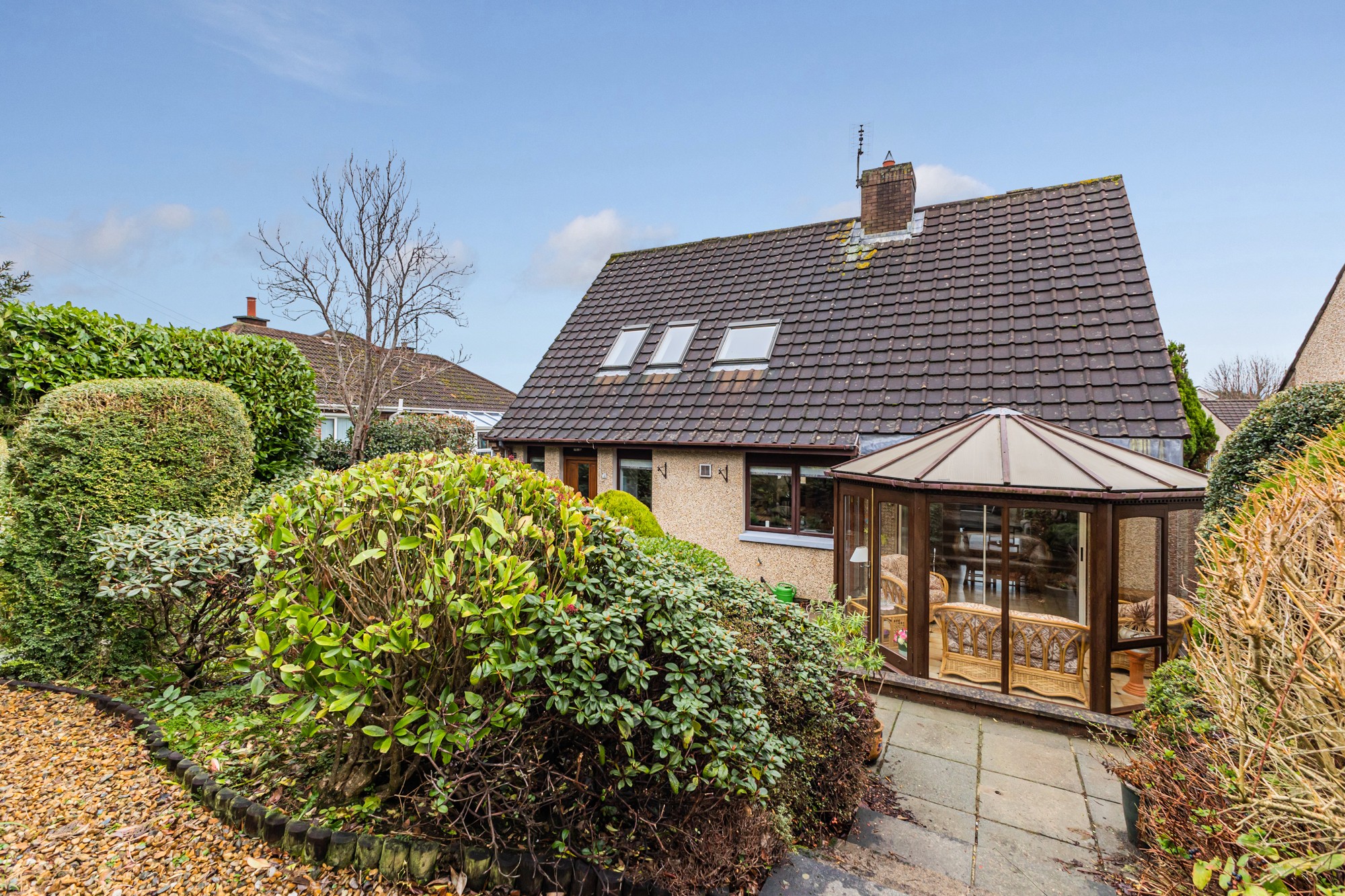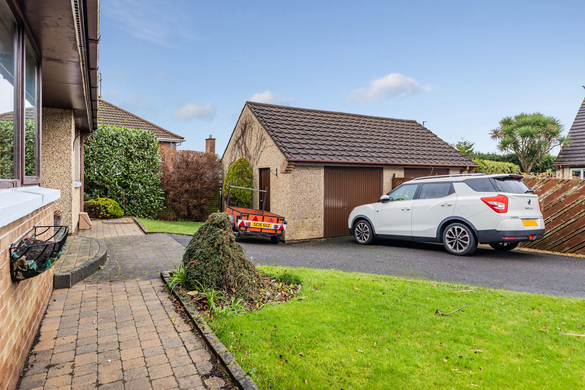 Externally the front provides a multi car driveway leading to a spacious detached garage and lawns with small trees and shrubs, the south facing enclosed rear is a display of rockery with small trees and flower beds with a patio area.