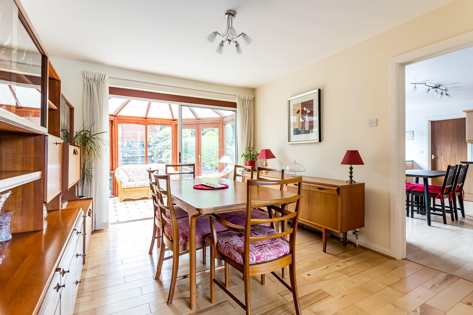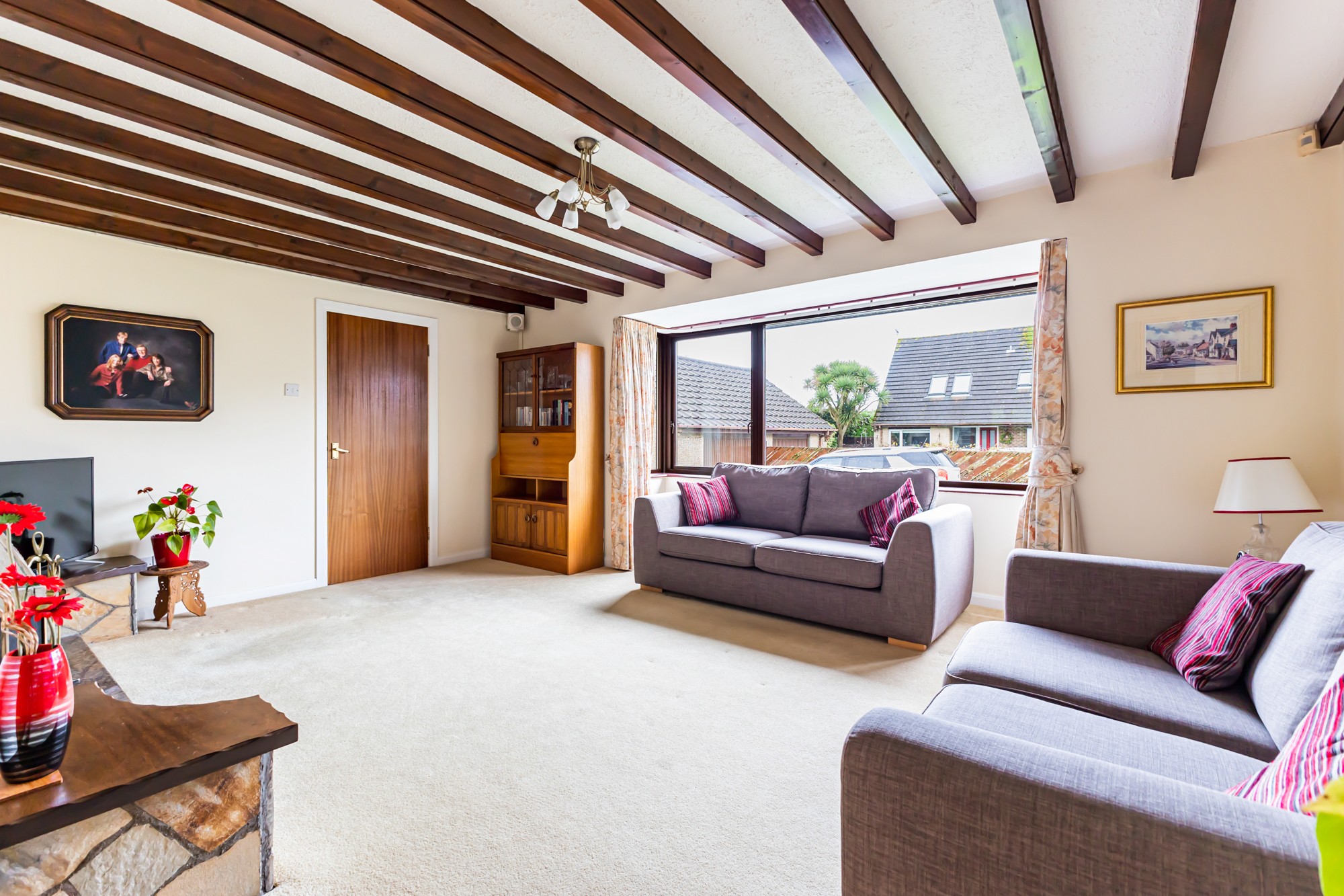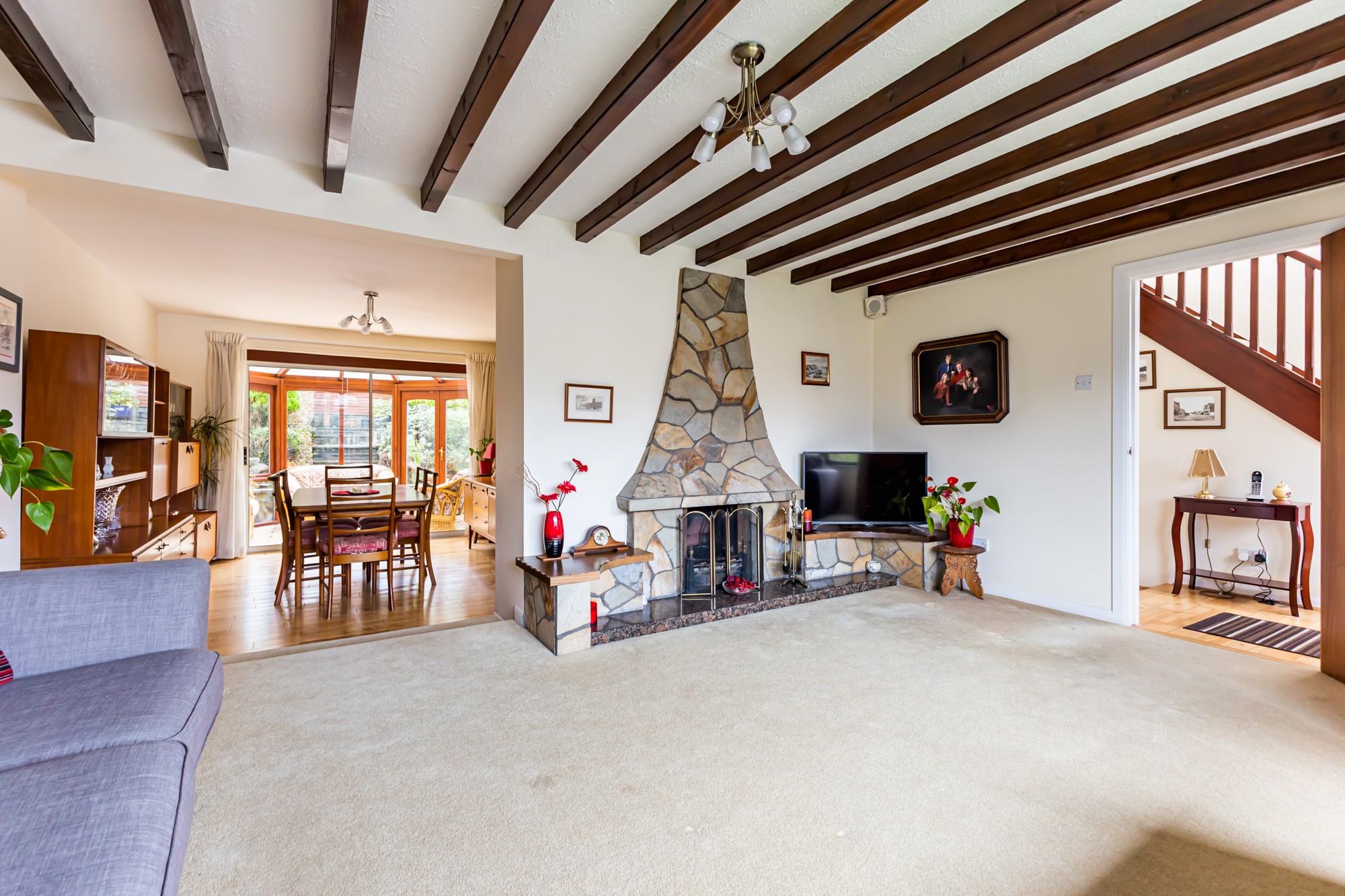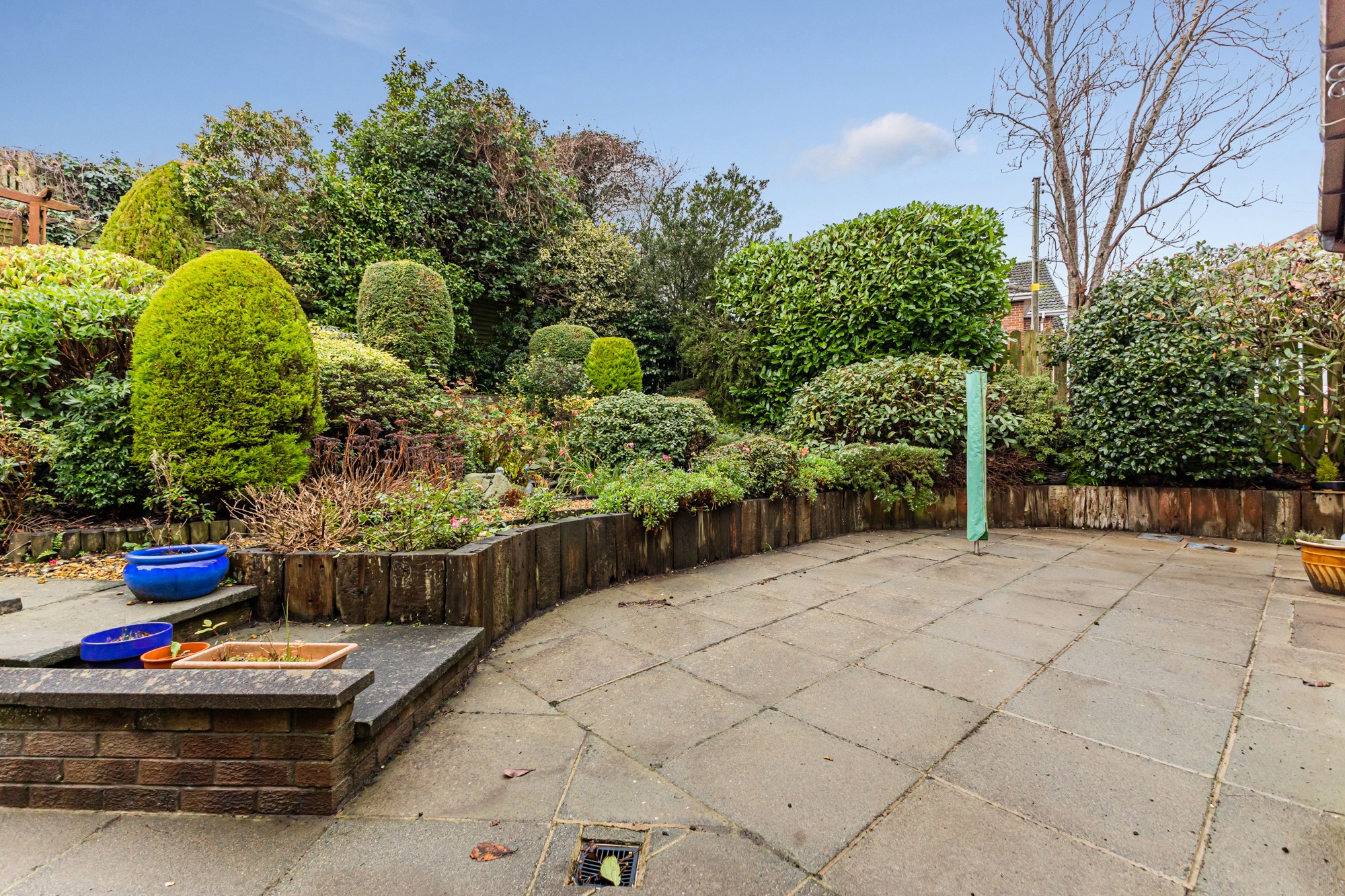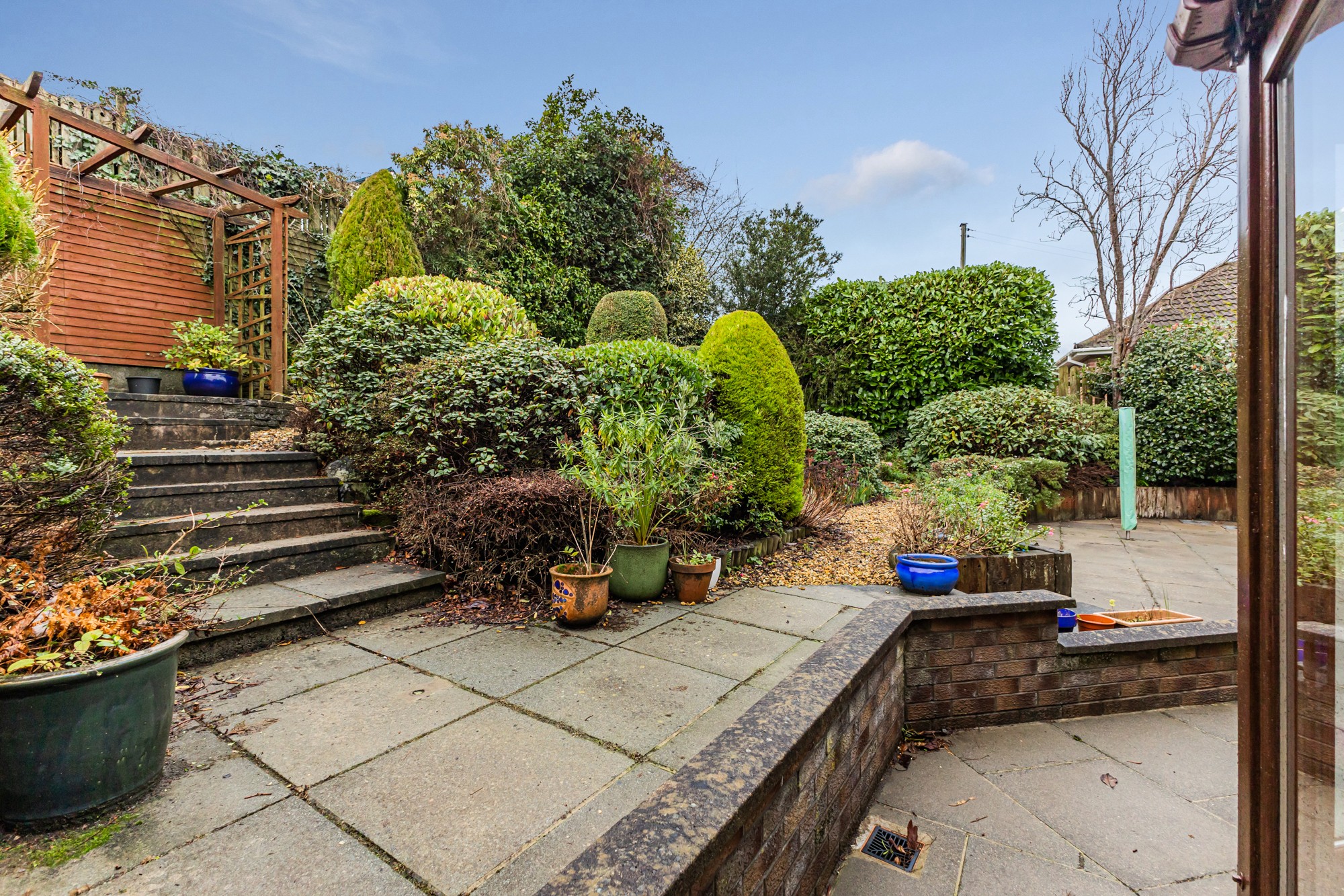 Externally the front provides a multi car driveway leading to a spacious detached garage and lawns with small trees and shrubs, the south facing enclosed rear is a display of rockery with small trees and flower beds with a patio area.