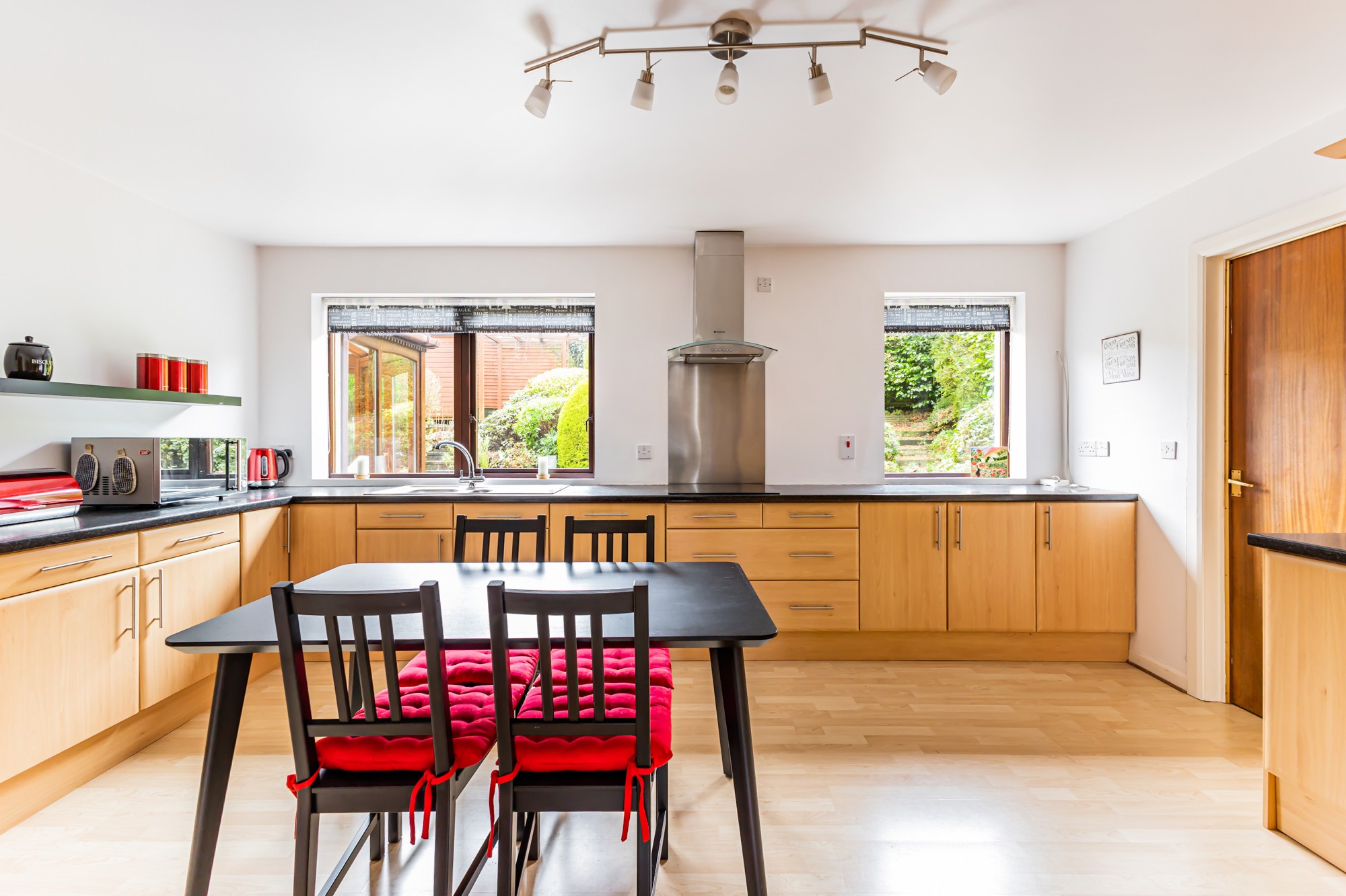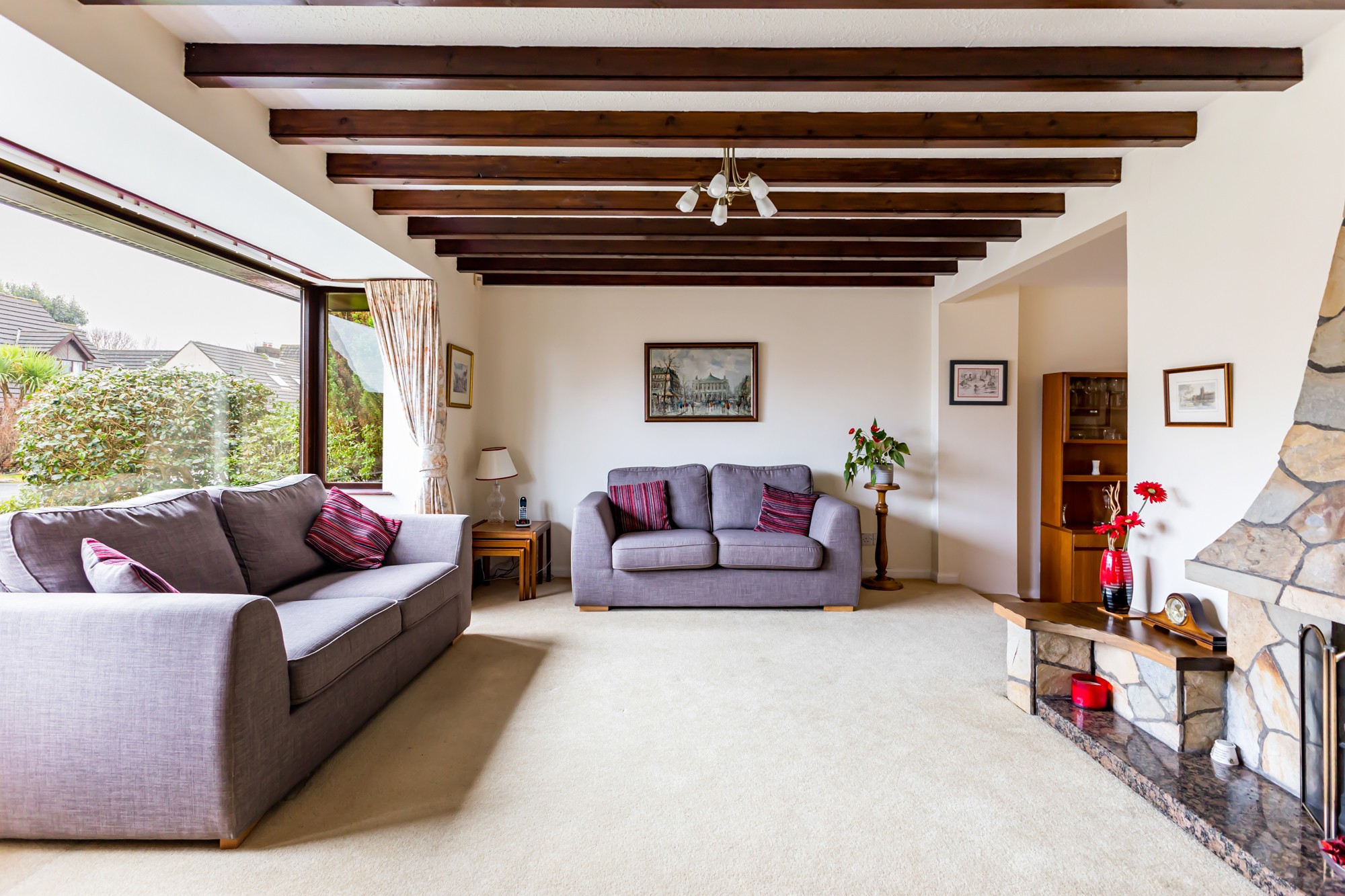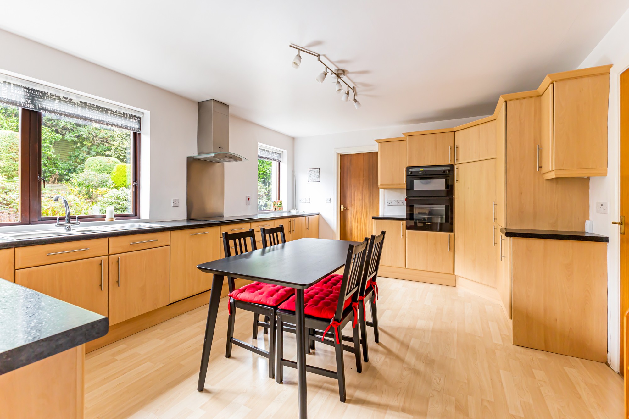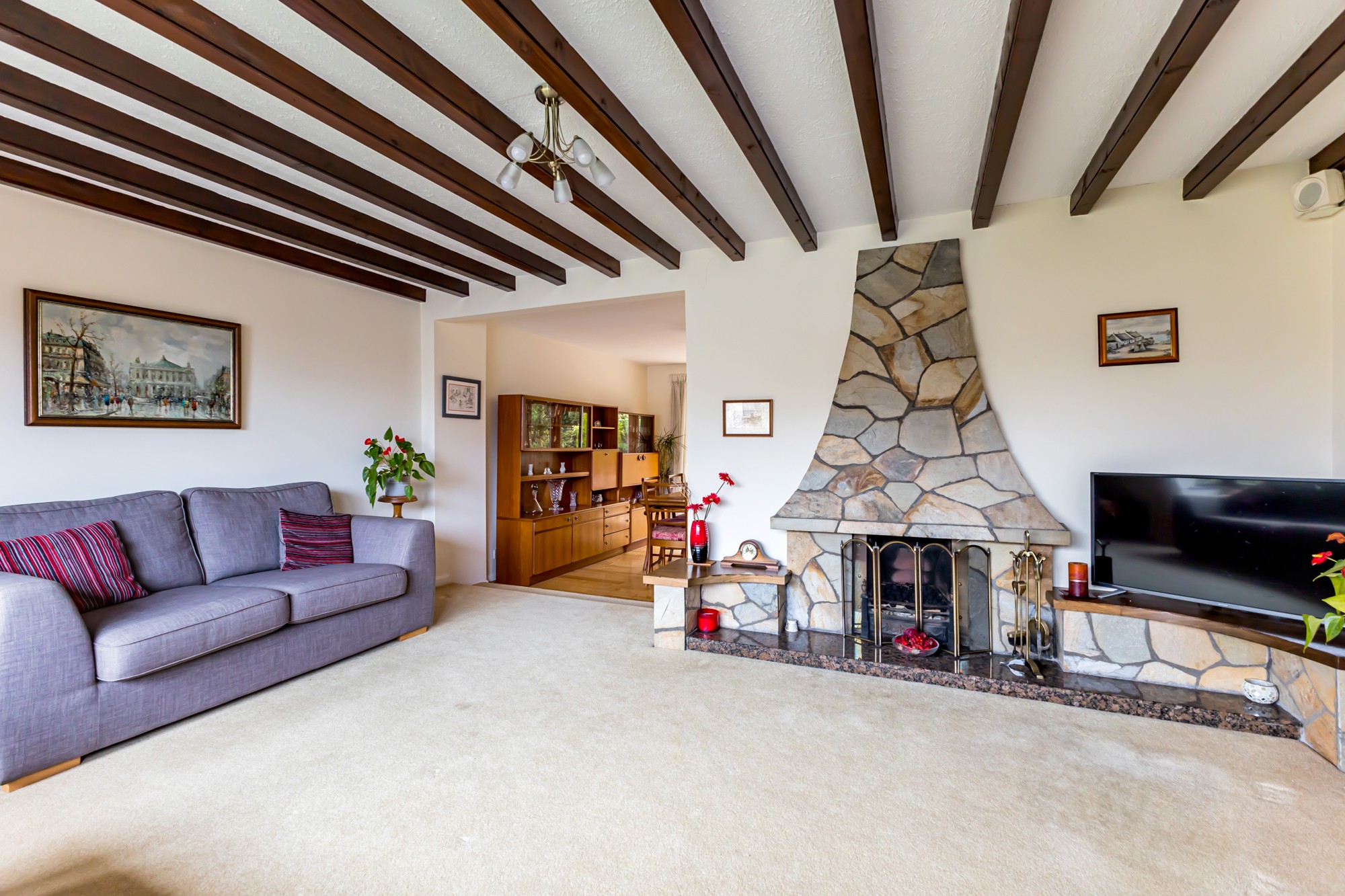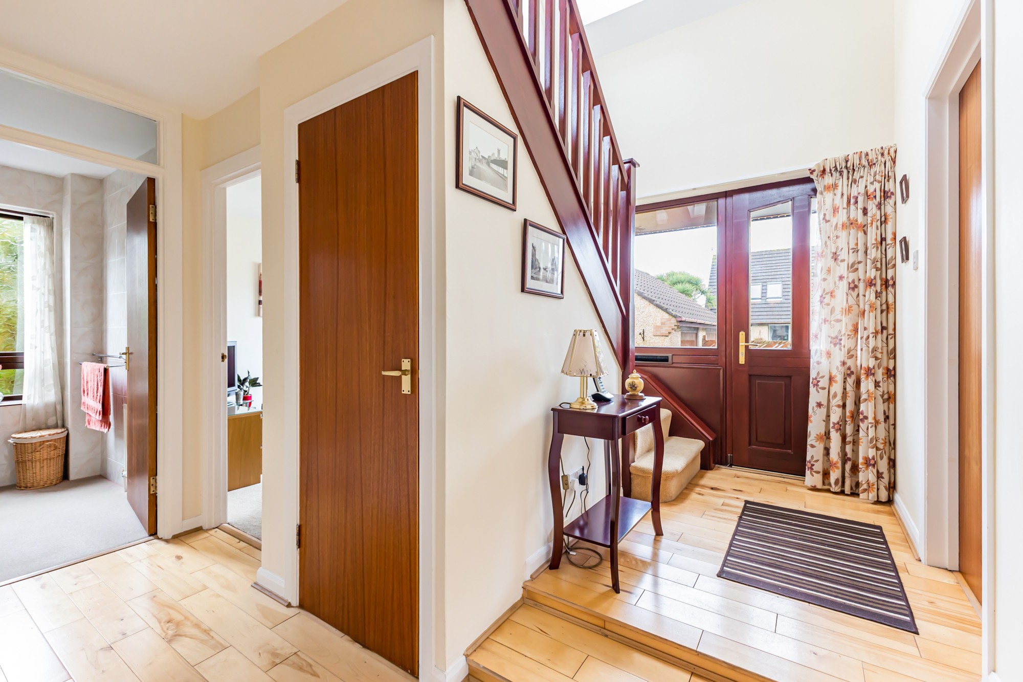 Externally the front provides a multi car driveway leading to a spacious detached garage and lawns with small trees and shrubs, the south facing enclosed rear is a display of rockery with small trees and flower beds with a patio area.